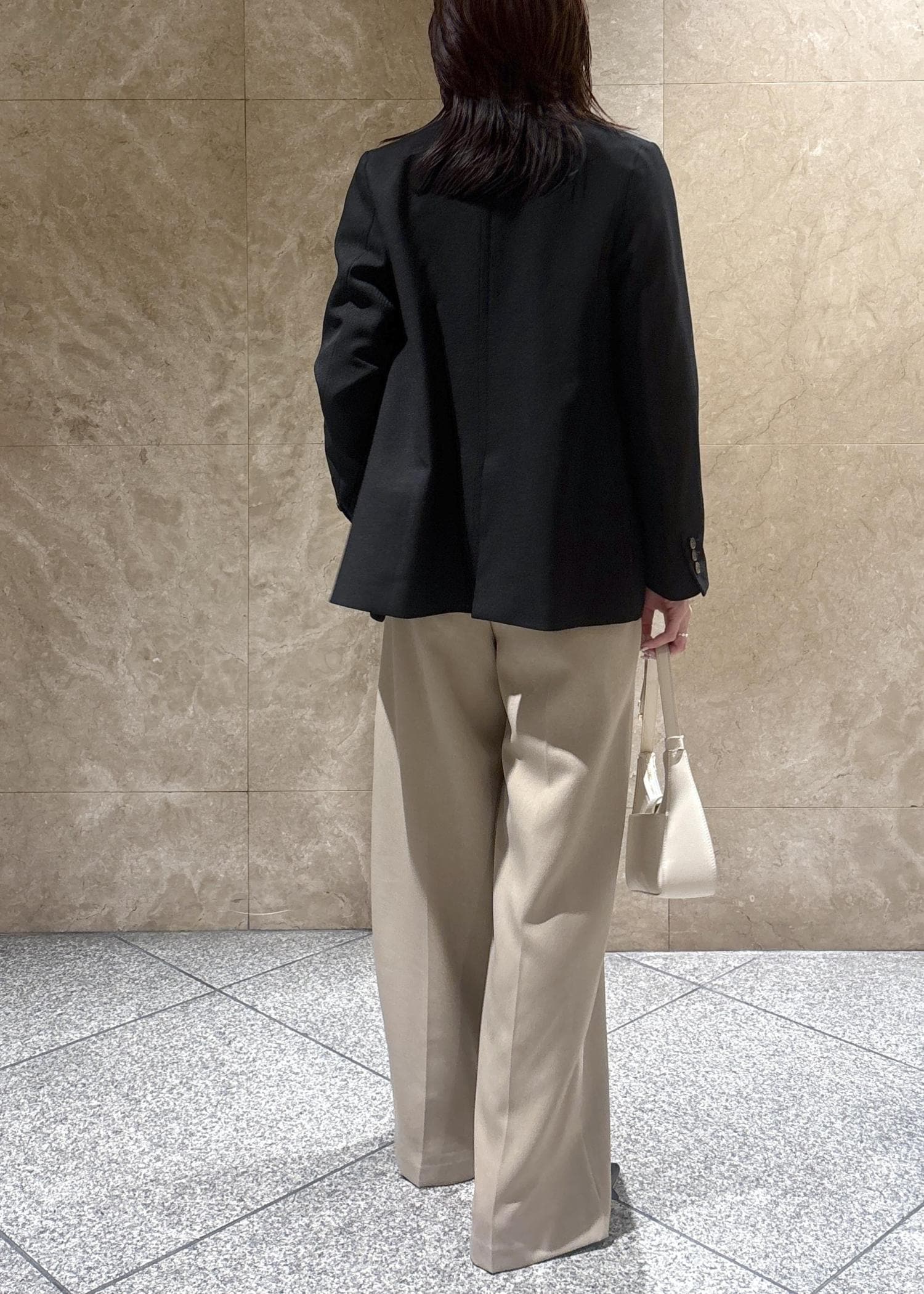 程よくゆとりのあるサイズ感ですが肩周りは落としたデザインではなくスッキリしているので、お仕事など少しフォーマルな場面でも使えるキレイめ見えジャケットです。 -