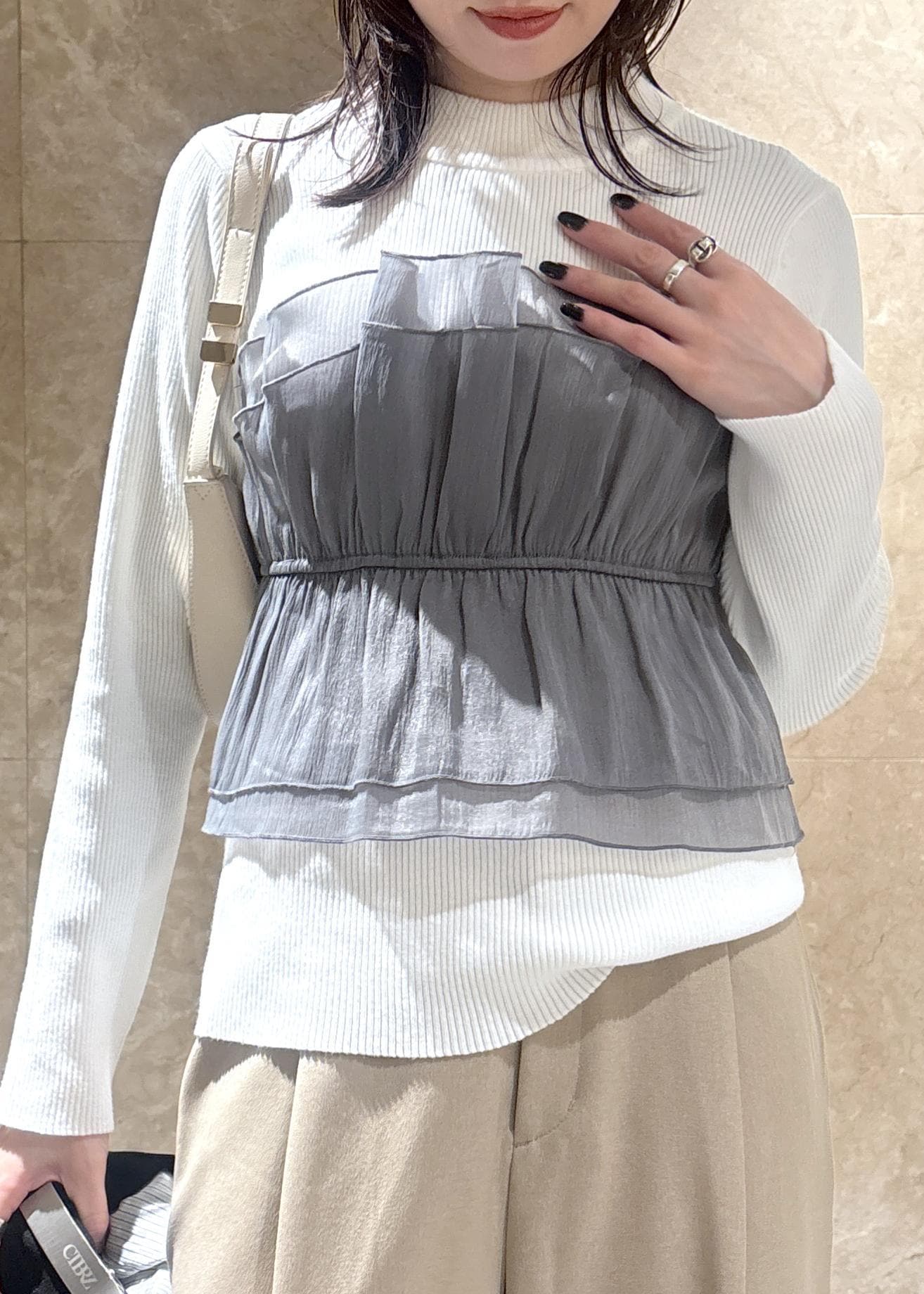 2BUY10%OFFVIS【美得】ビスチェドッキングニットプルオーバー/セットアップ対応キナリ系 / F¥5,489レビューキナリ系(18)のカラーは、クリーンなホワイトカラーに、オーガンジー部分はグレーのカラー。
