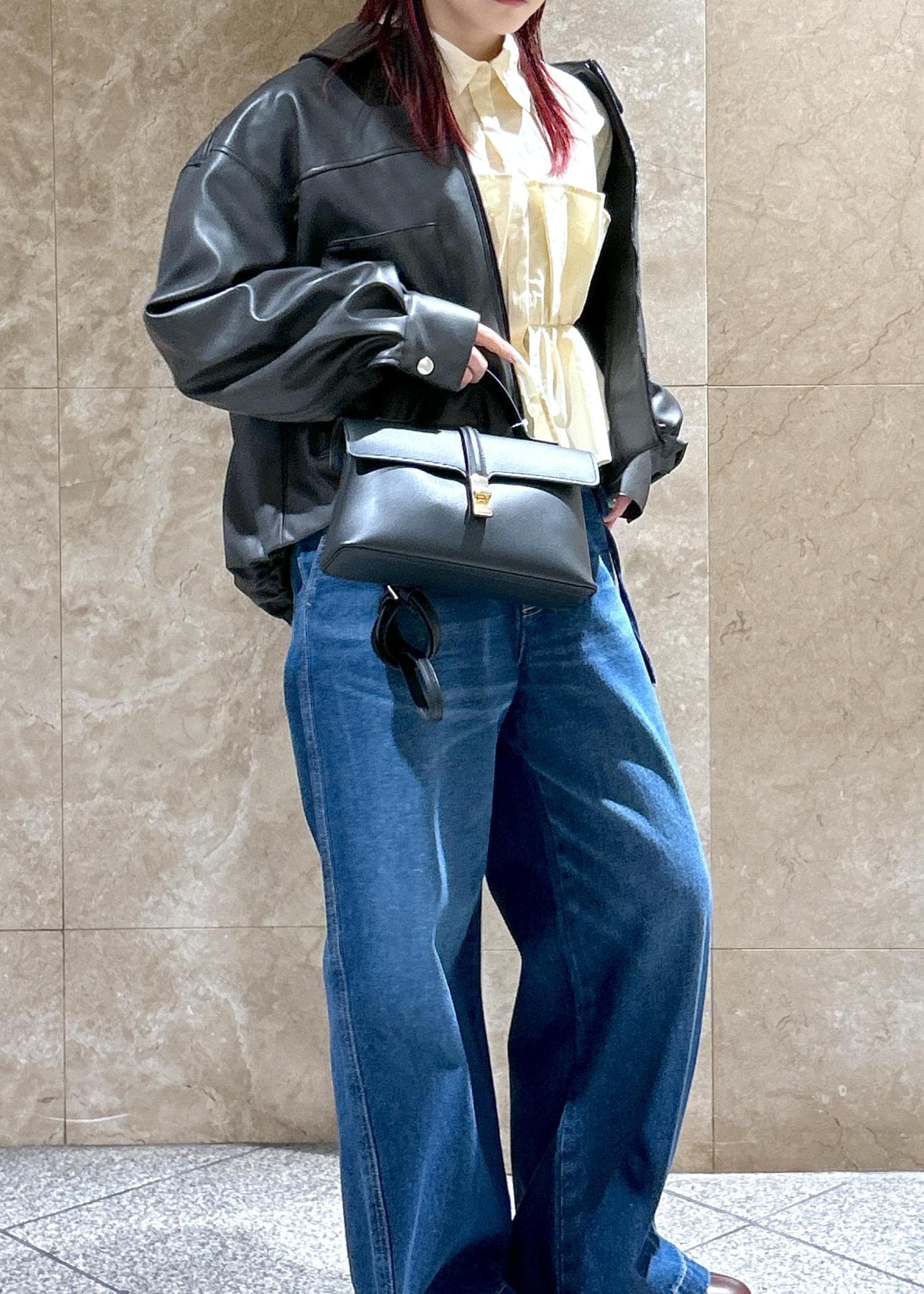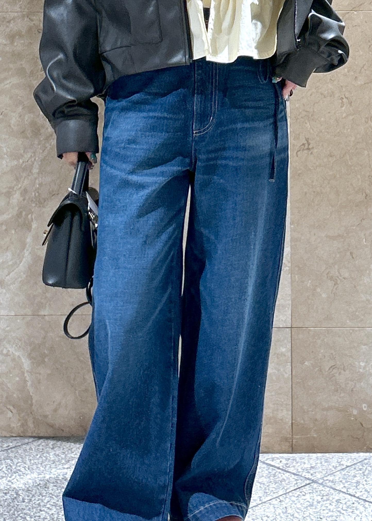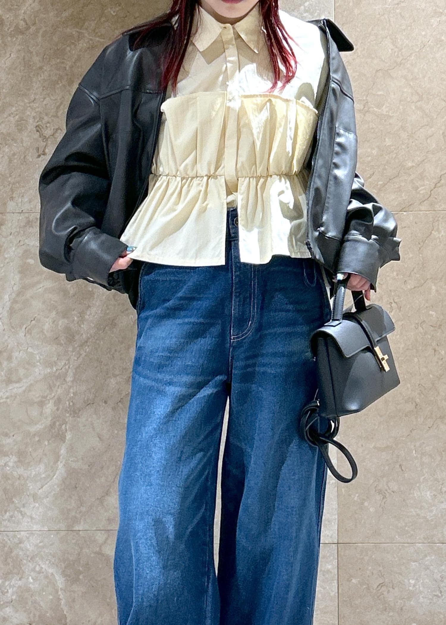ワイドですがストレートに落ちるシルエットで、カジュアルになりすぎず◎