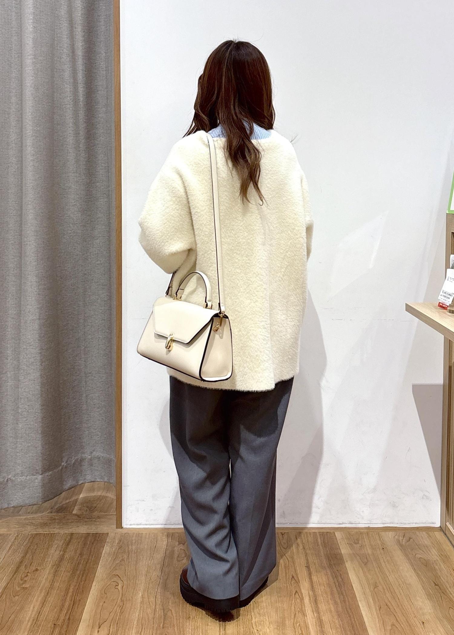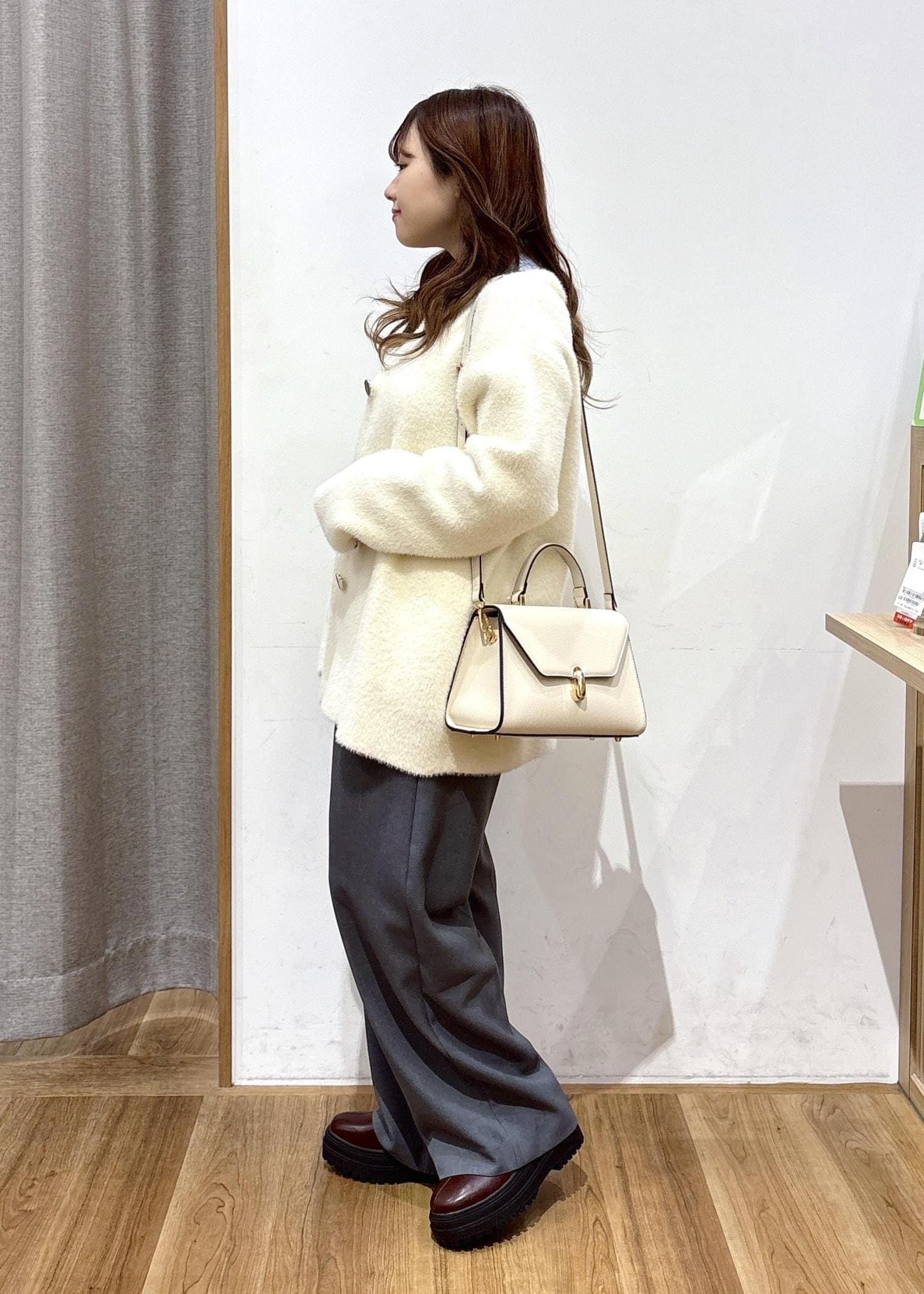 シンプルで着回しのしやすいグレーのスラックスに、ふわふわと暖かいファーのアウターと薄手でまだまだこれからも使えるニットトップスを合わせてみました。