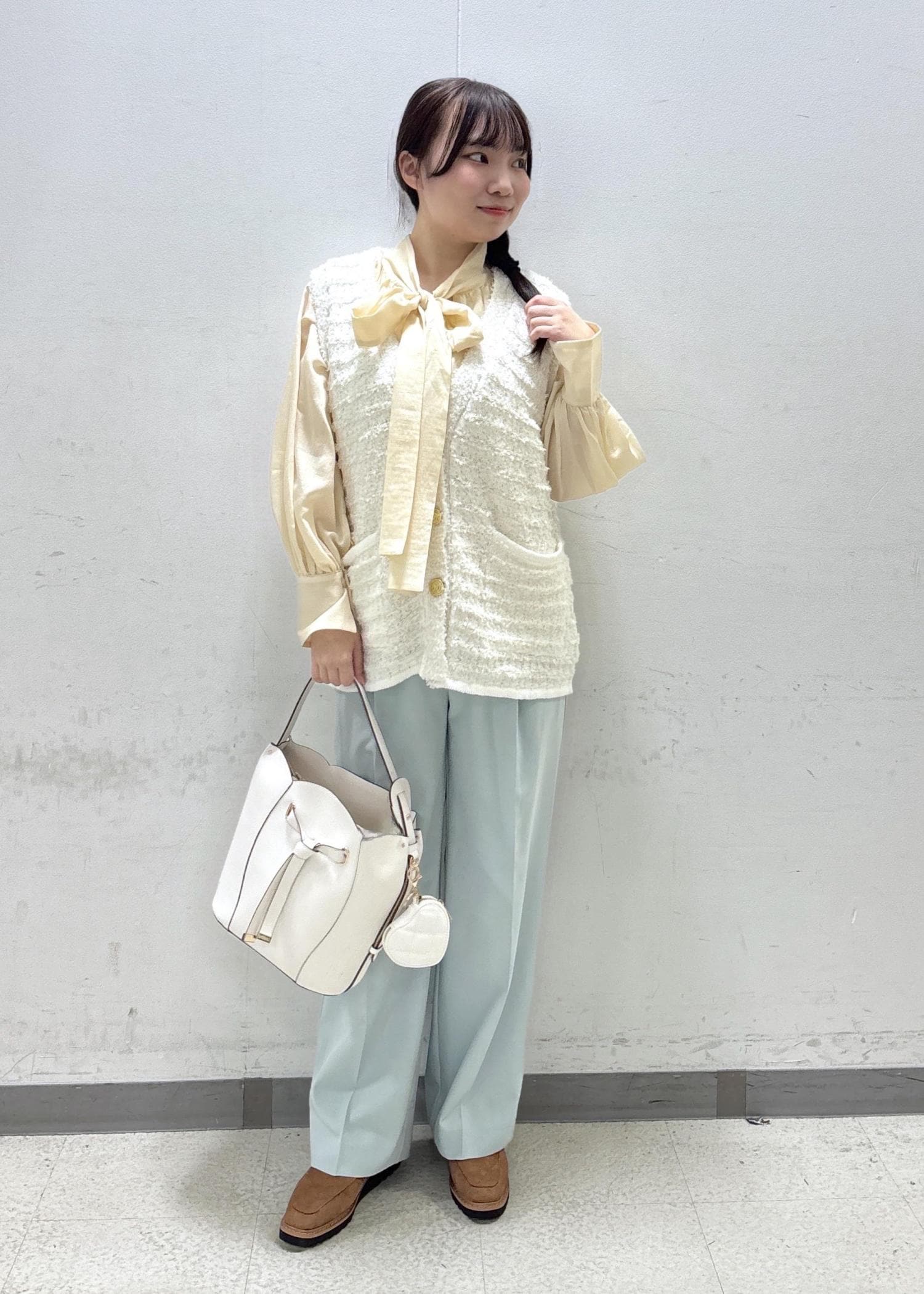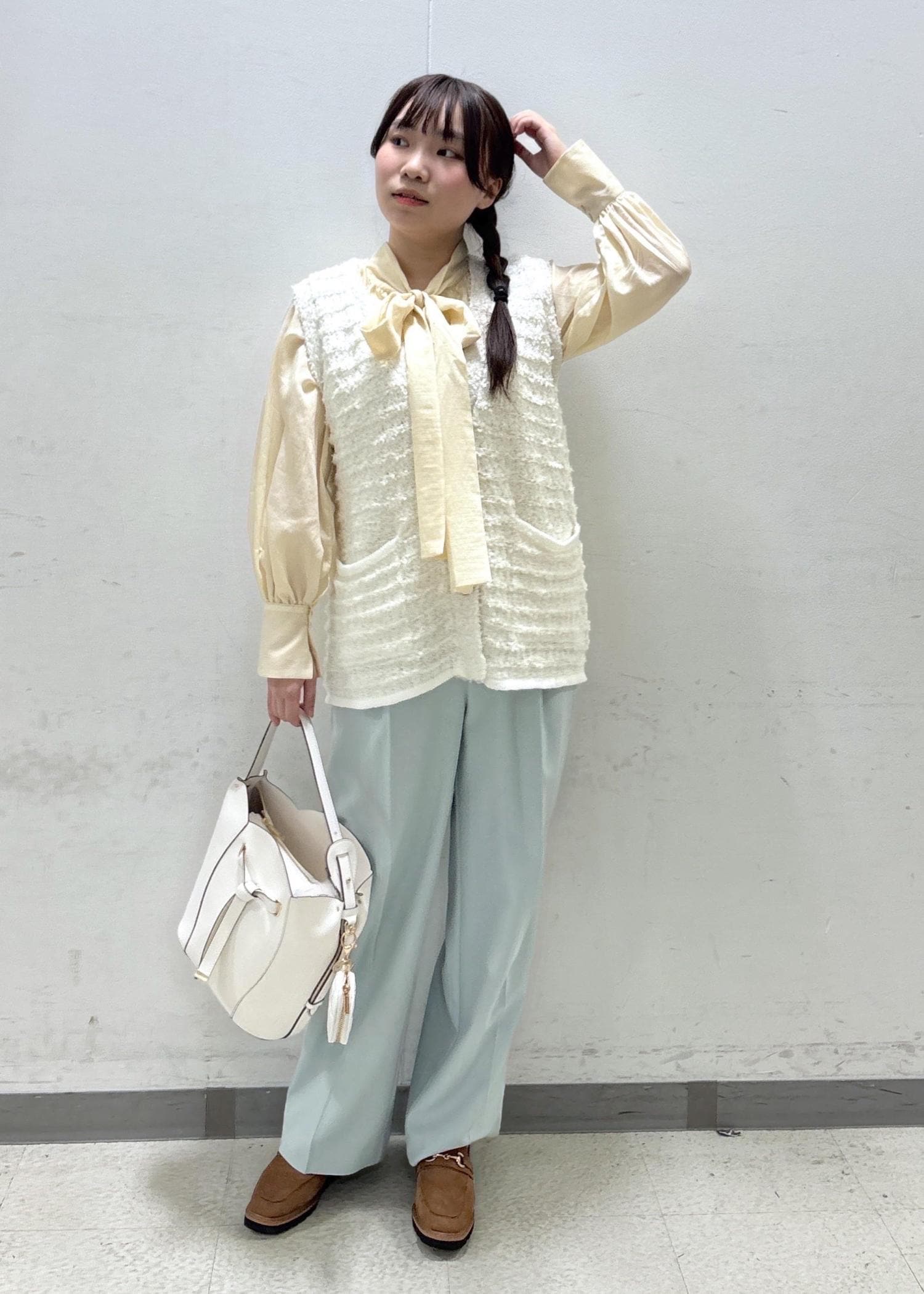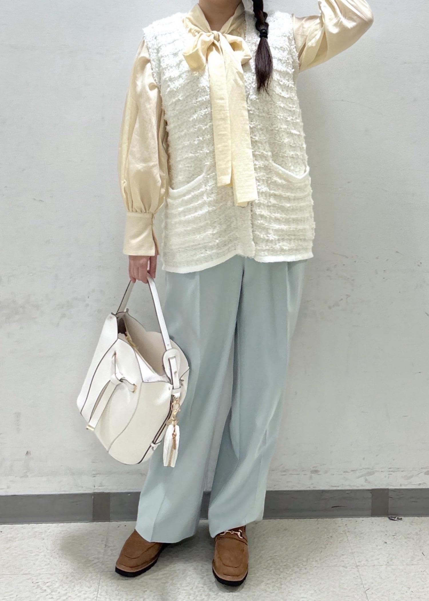 春先、ボウタイブラウスなどとのレイヤードコーデがオススメです^ - ^ -