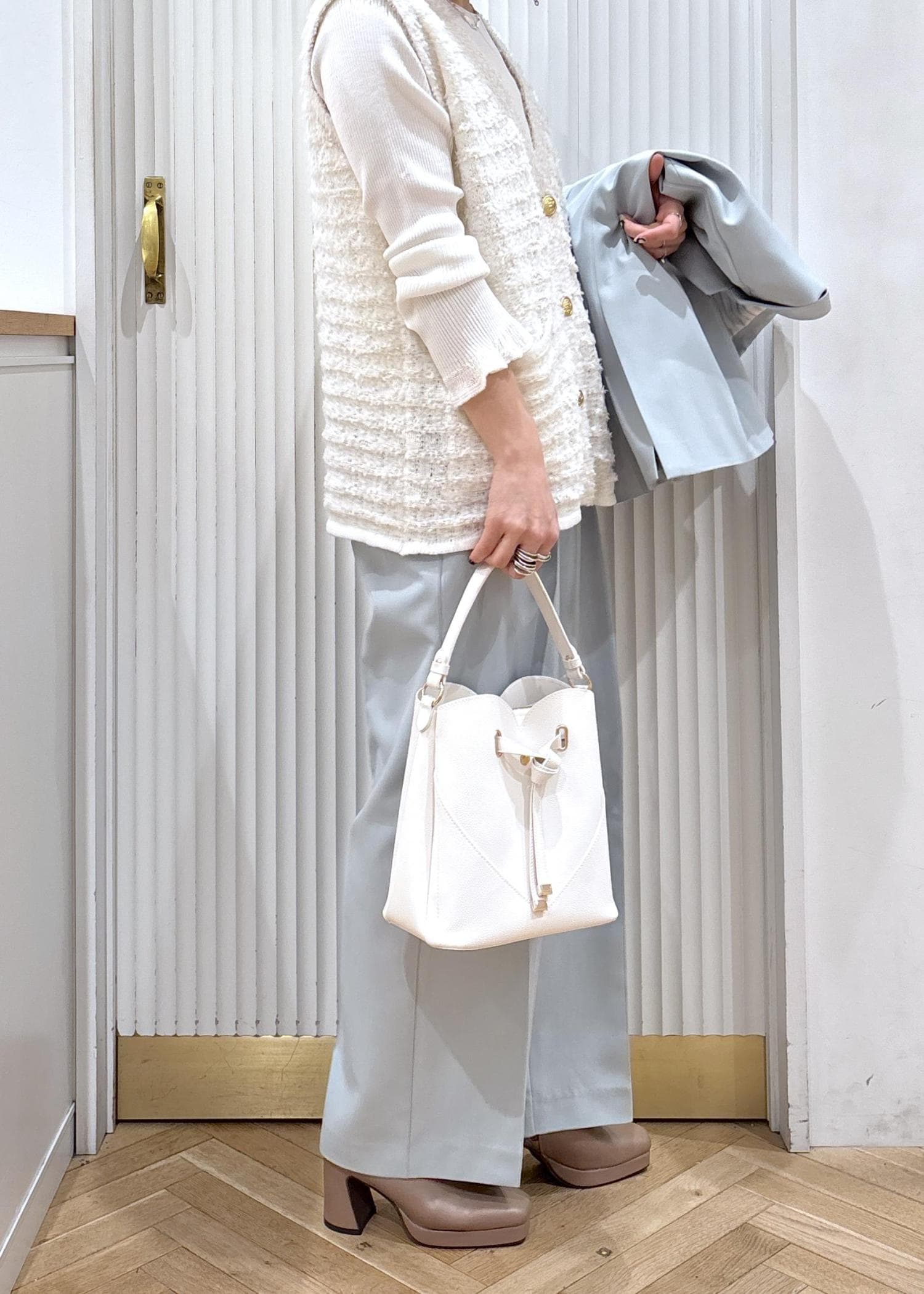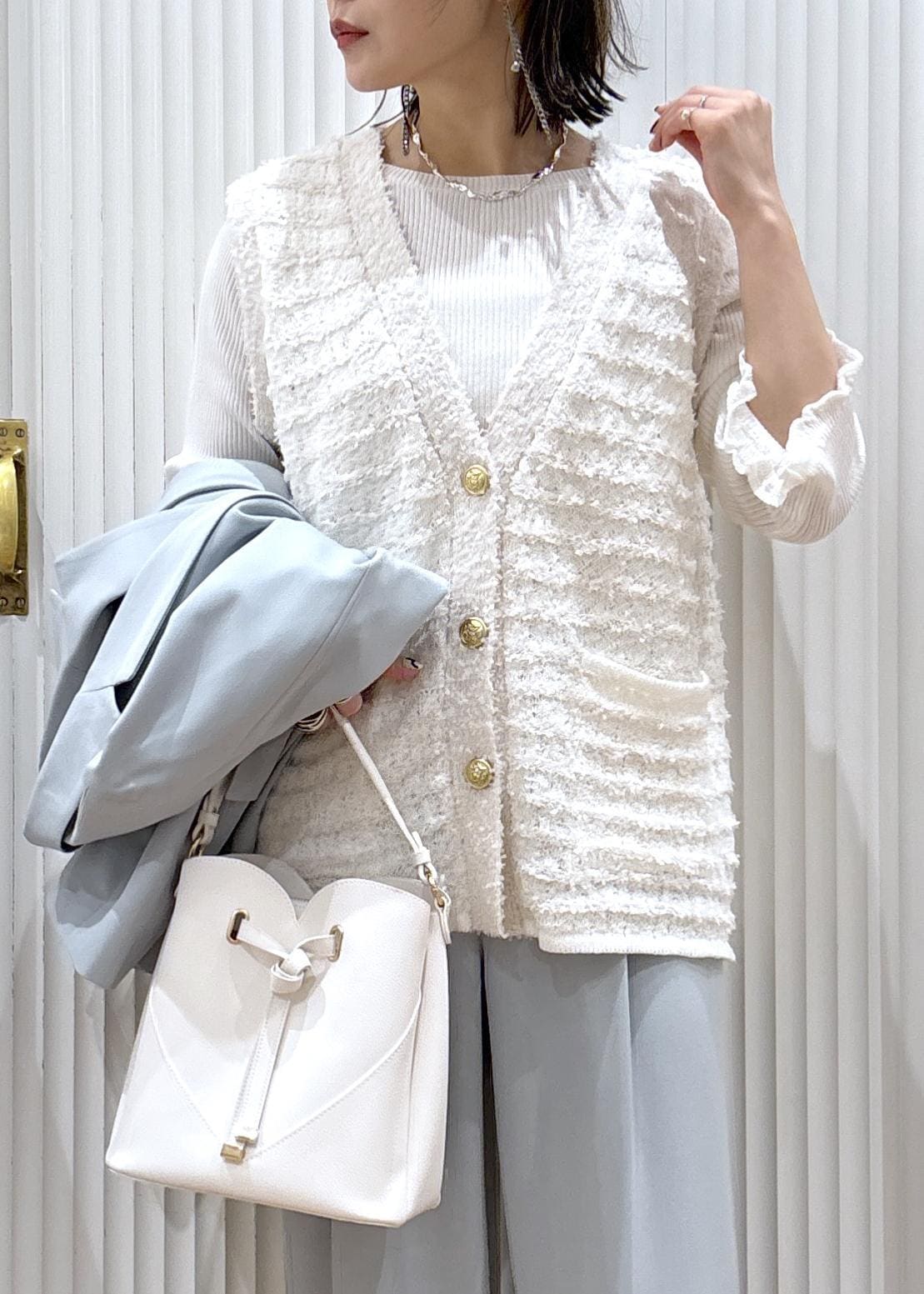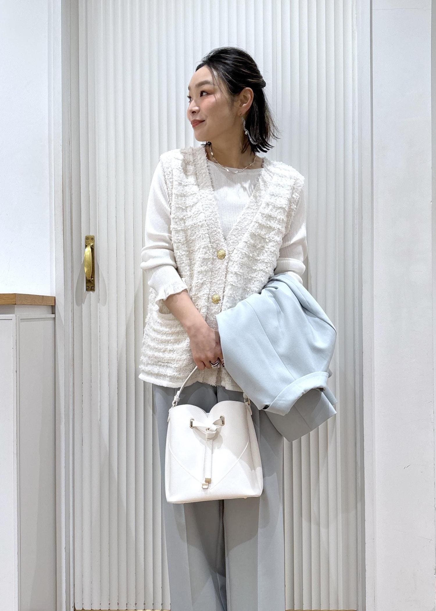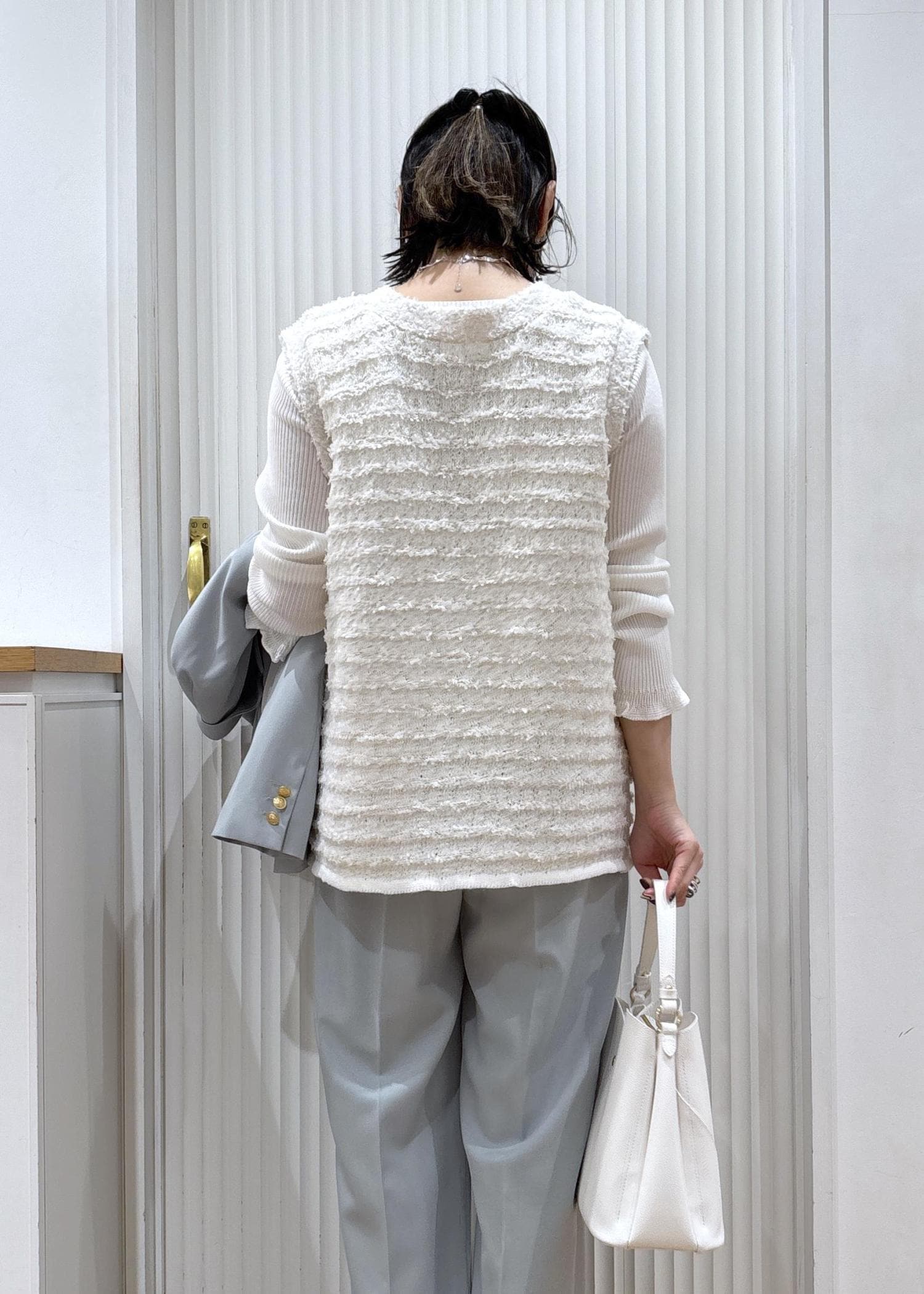 NEW!VISツイードニットベスト/イージーケアキナリ系 / F¥6,589レビュー丈感や身幅が安心感のあるサイズでインナーを選ばないツイードニットベスト。張りのあるブラウスやスッキリしたリブニット、どちらにも馴染みやすくキチンと感が出るのでセレモニーやお仕事、ご普段使いに幅広く対応。柔らかなドライタッチなニット素材で初夏まで長く使える生地です。