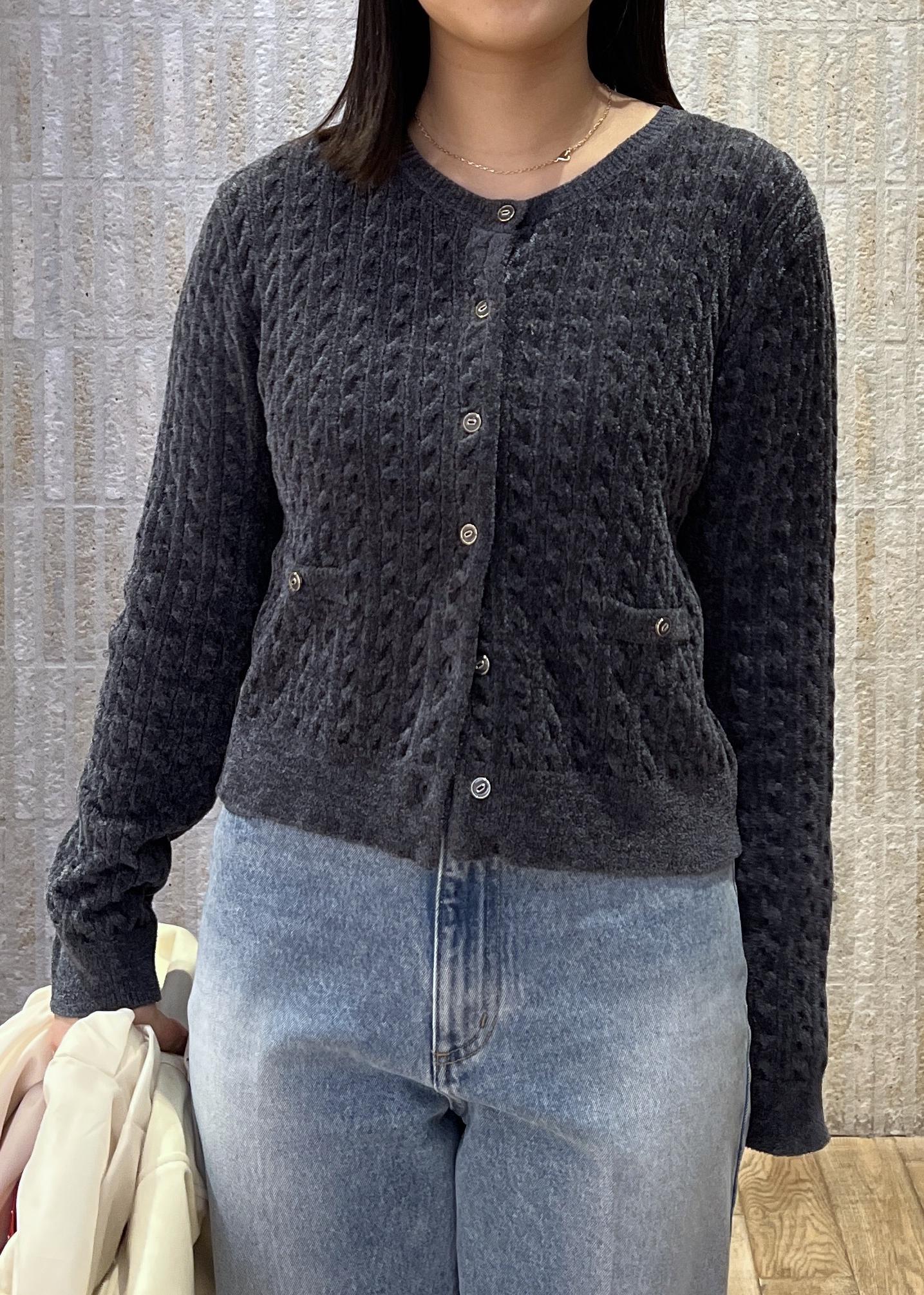 VISモールベロアケーブルカーディガントップス/イージーケアチャコール / F¥6,589レビューベロア素材が上品なカーディガン。コンパクトでフィット感がありますが首周りが空いていて抜け感が出せるので身体を綺麗にみせてくれます。