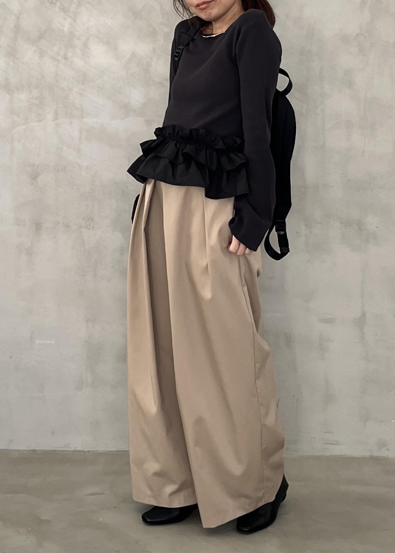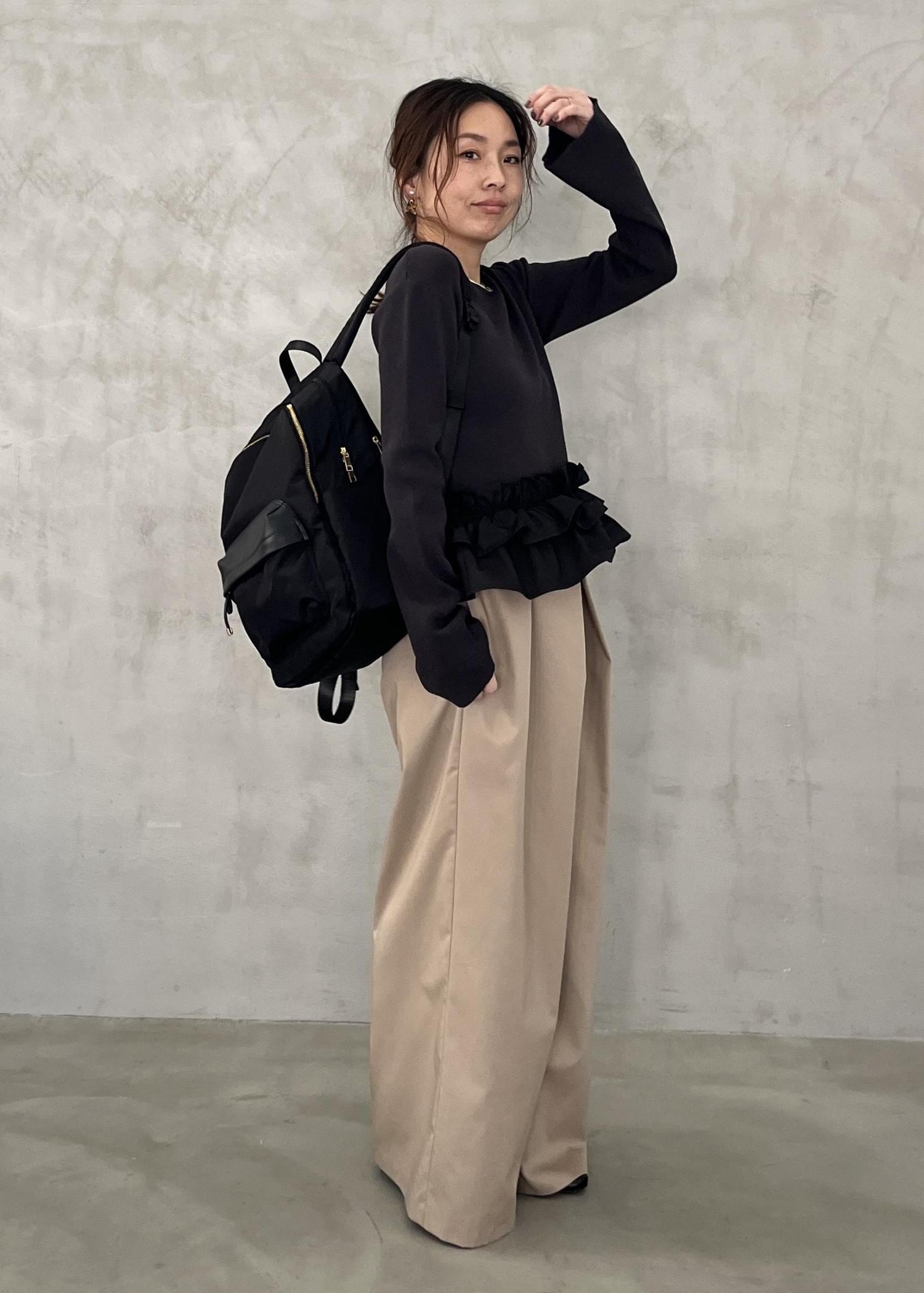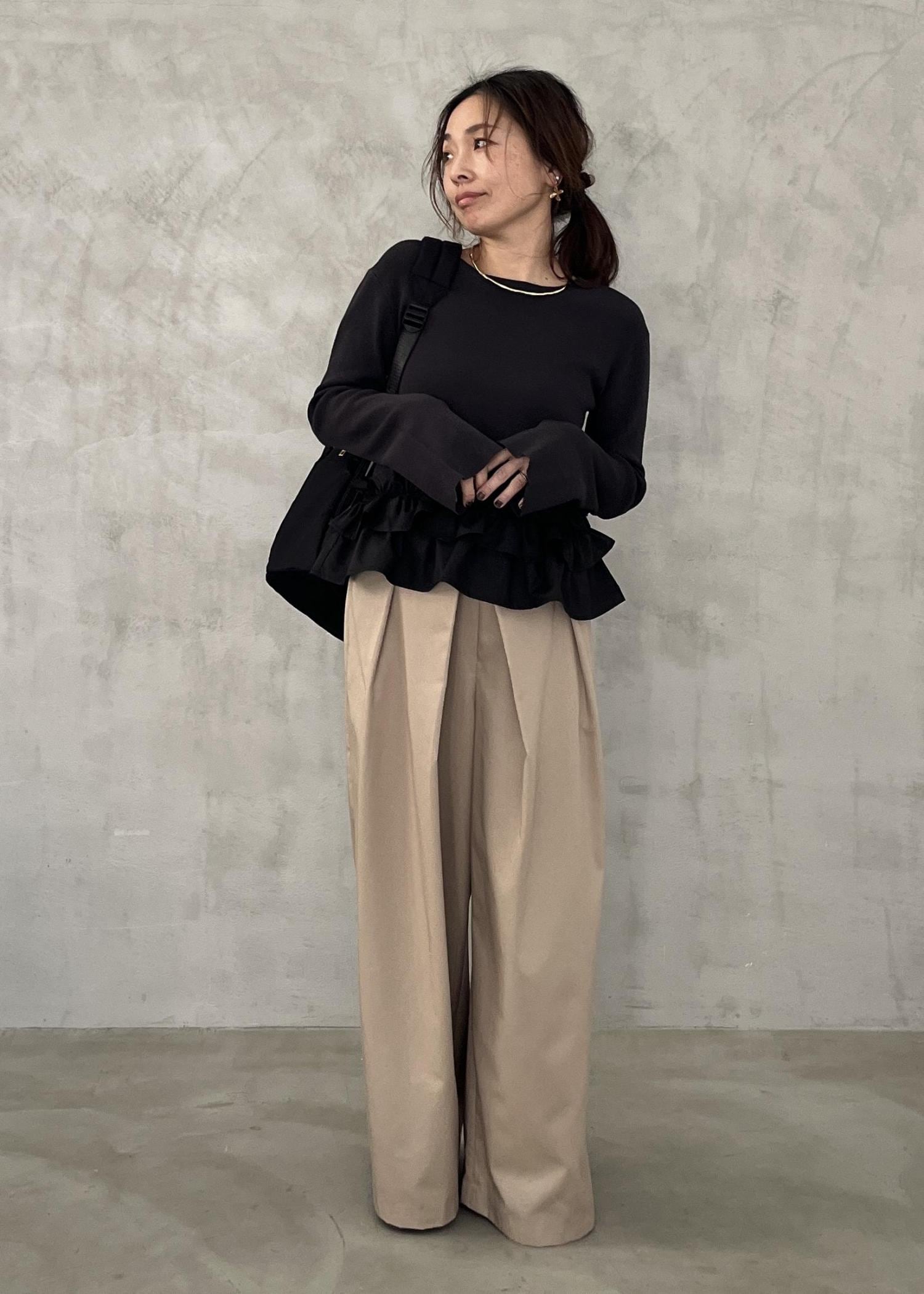 フリルの甘さは、+ワイドパンツで一気に大人見え。