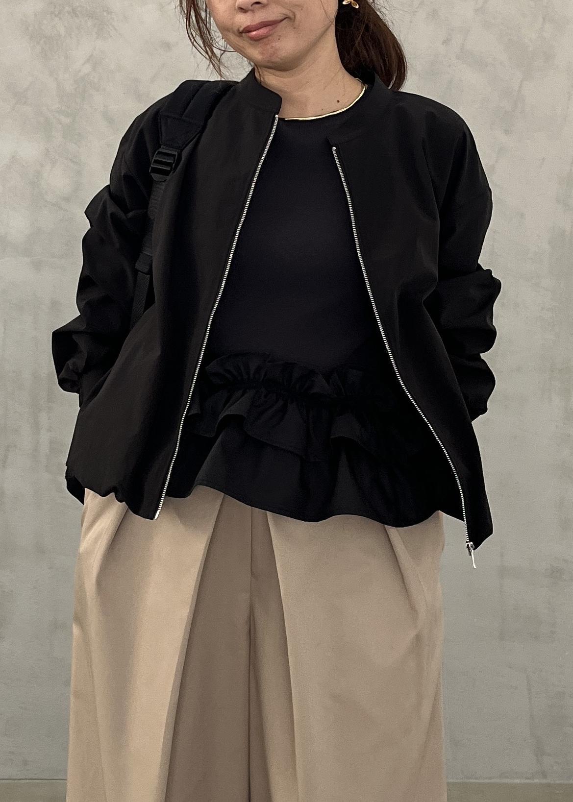 NEW! 予約VISボリュームバルーンブルゾン/UVケア・イージーケアブラック / F¥6,919レビュー152cmでFサイズ着用し、着丈は腰に少しかかる丈。ボリューム感あるシルエットで女性らしいライン。袖口にはゴムが入っているのでたくしあげて着てもOK。春先にぴったりな薄手の羽織りは1枚あると気温の安定しない時期にはとっても便利。折りたたんでバッグの中にいれてもシワになりにくいです。柔らかい素材感なのでボリュームがおさえられて、すっきり見えも叶えてくれます。
