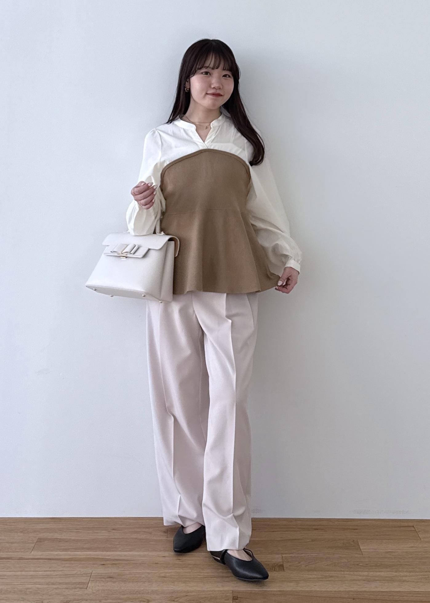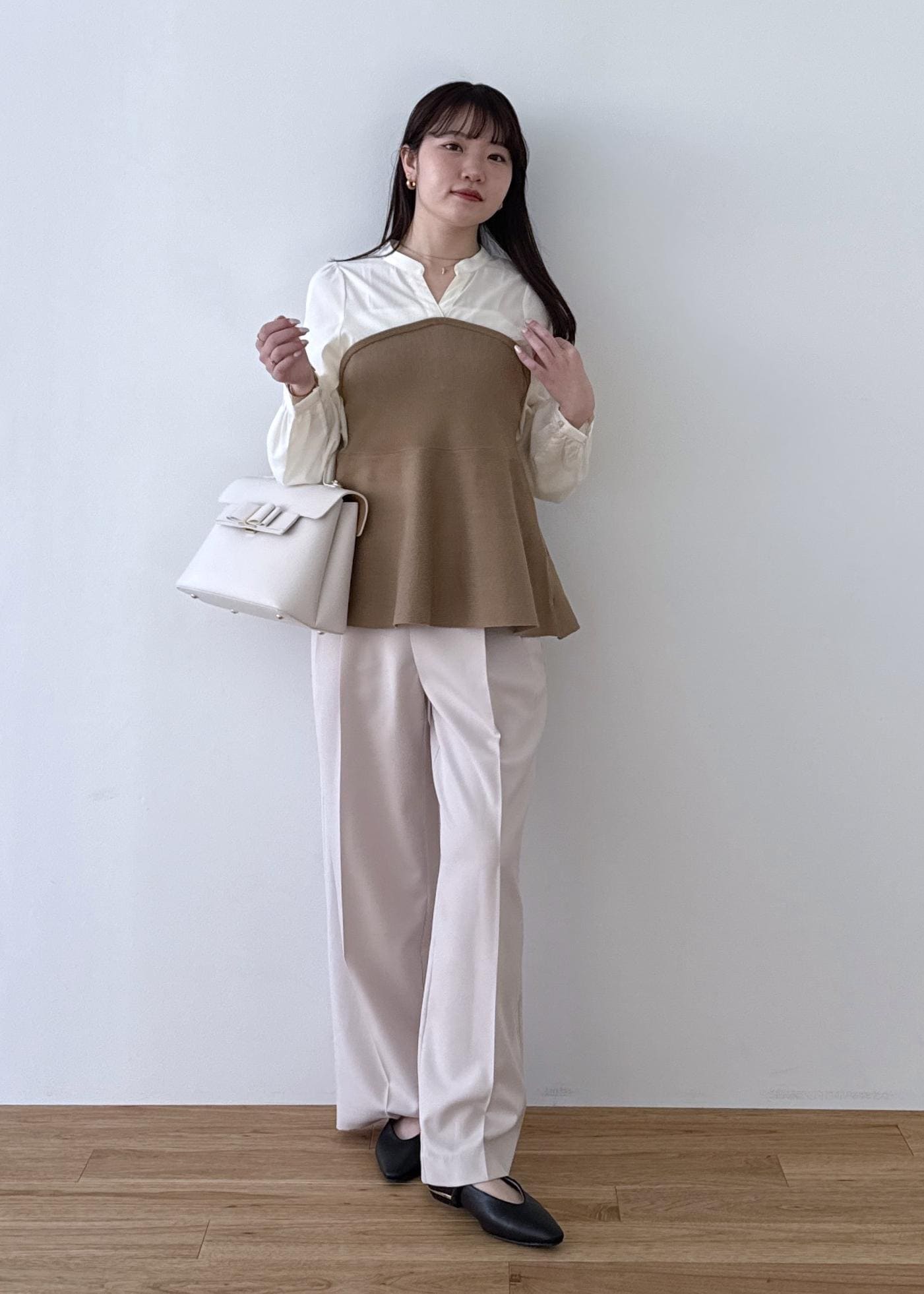 シャツドッキングトップスがメイン!春らしいベージュ×ブラウン暖色コーデ◎