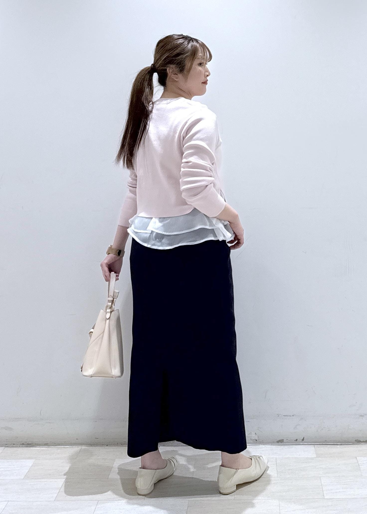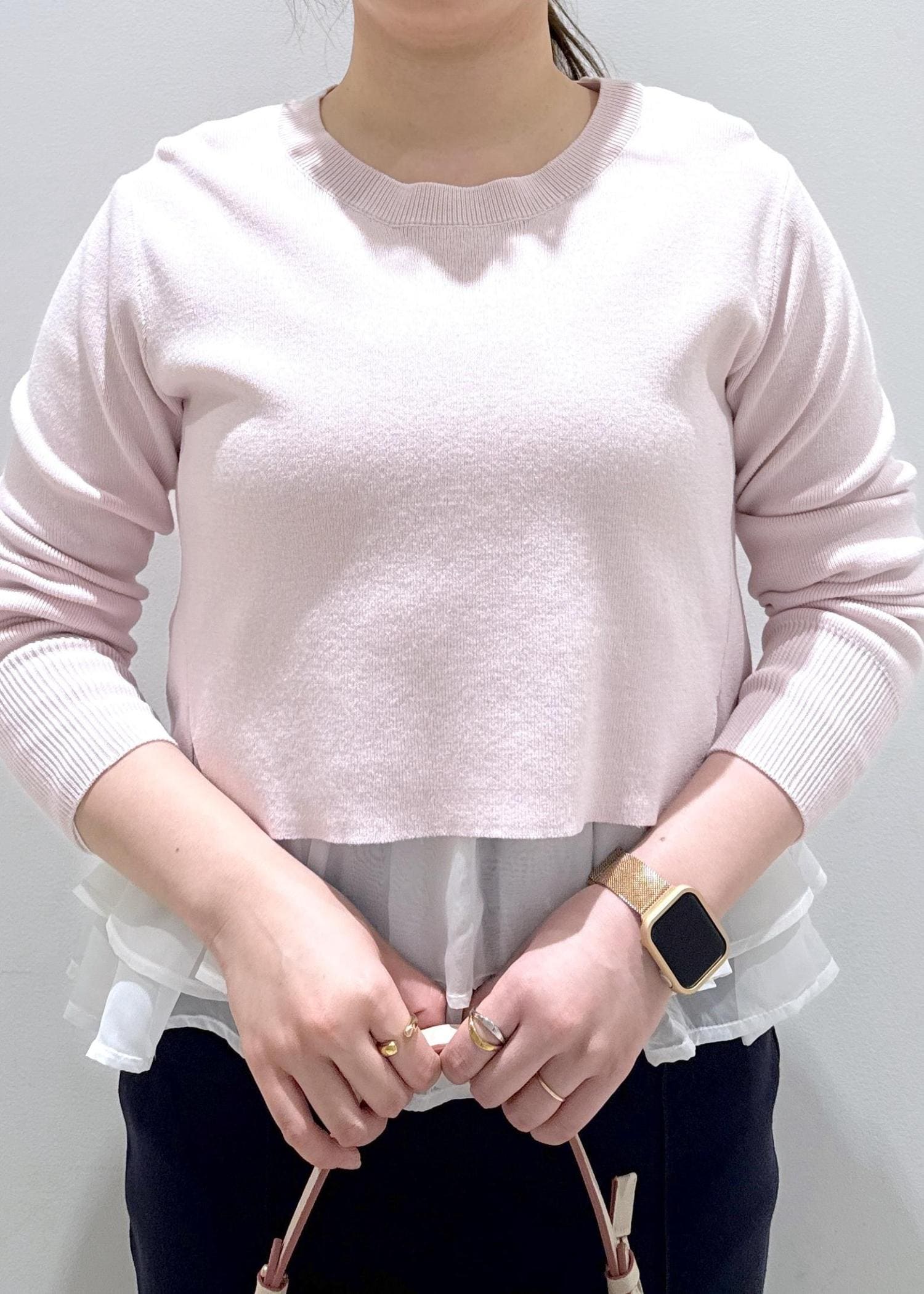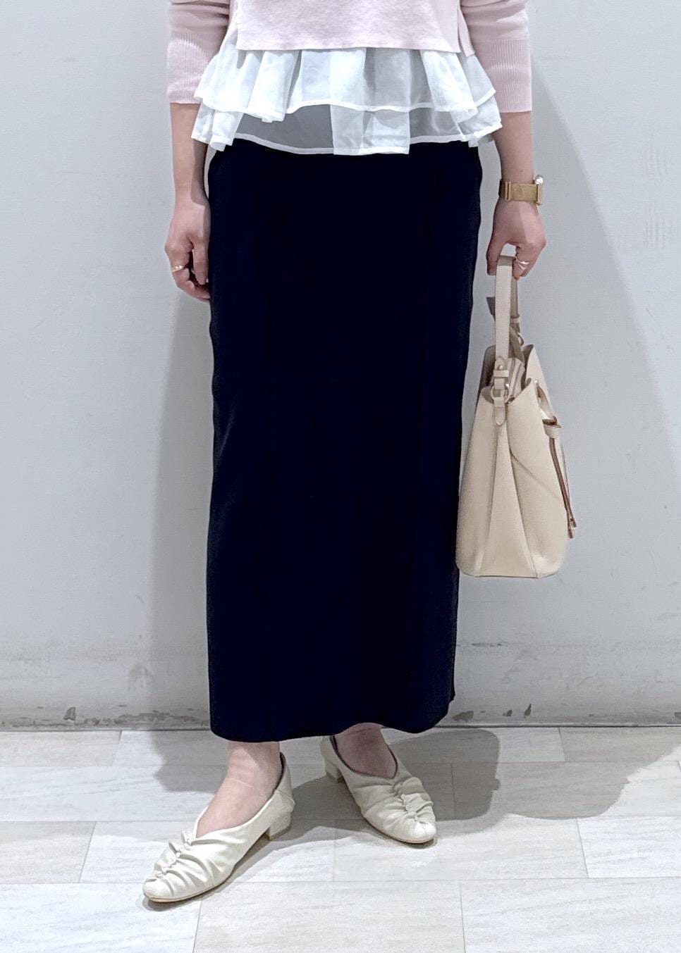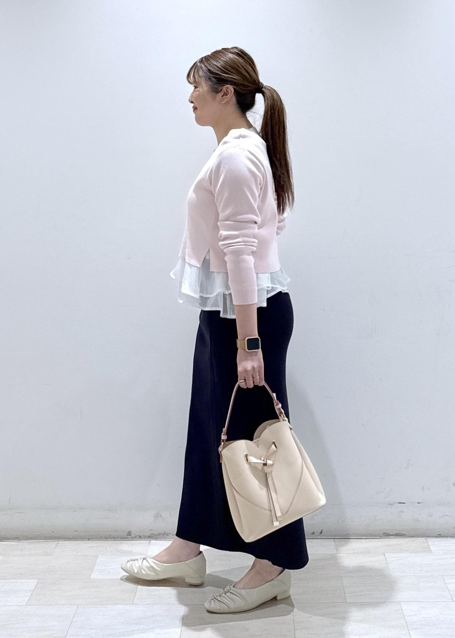 今回は新作で入荷しました1枚で楽に着れる、レイヤード風ニットにスカートと合わせてお仕事や普段にも使える綺麗めなコーディネートにしました。春らしい柔らかいピンクカラーなので今から春まで長く扱いいただけます。