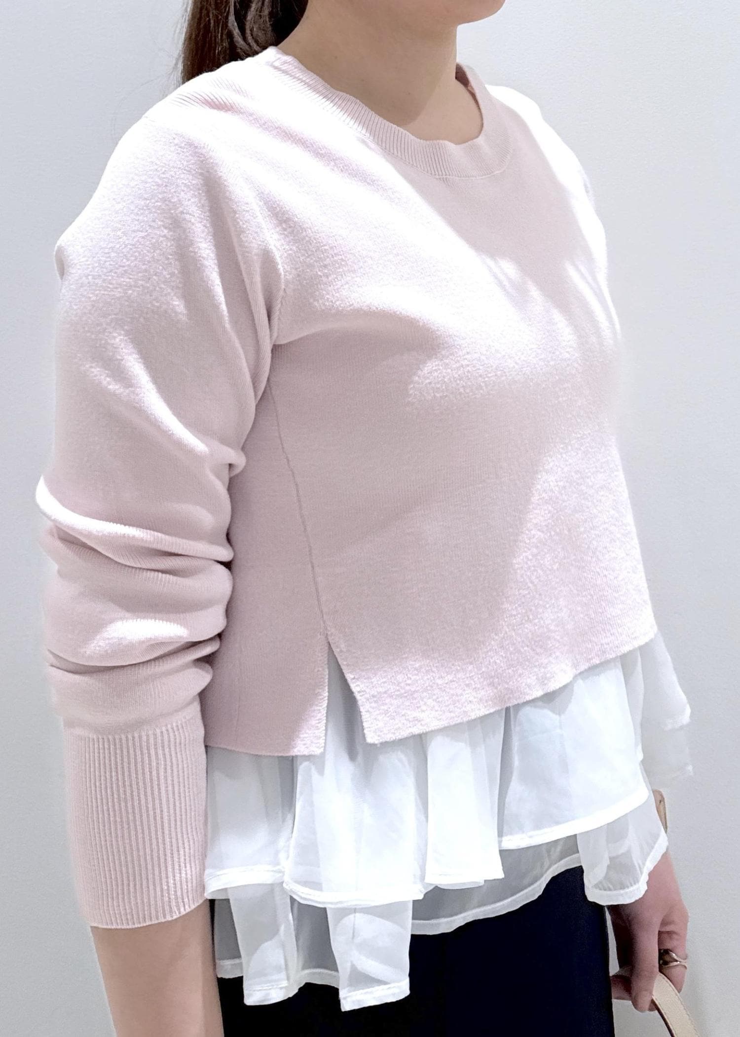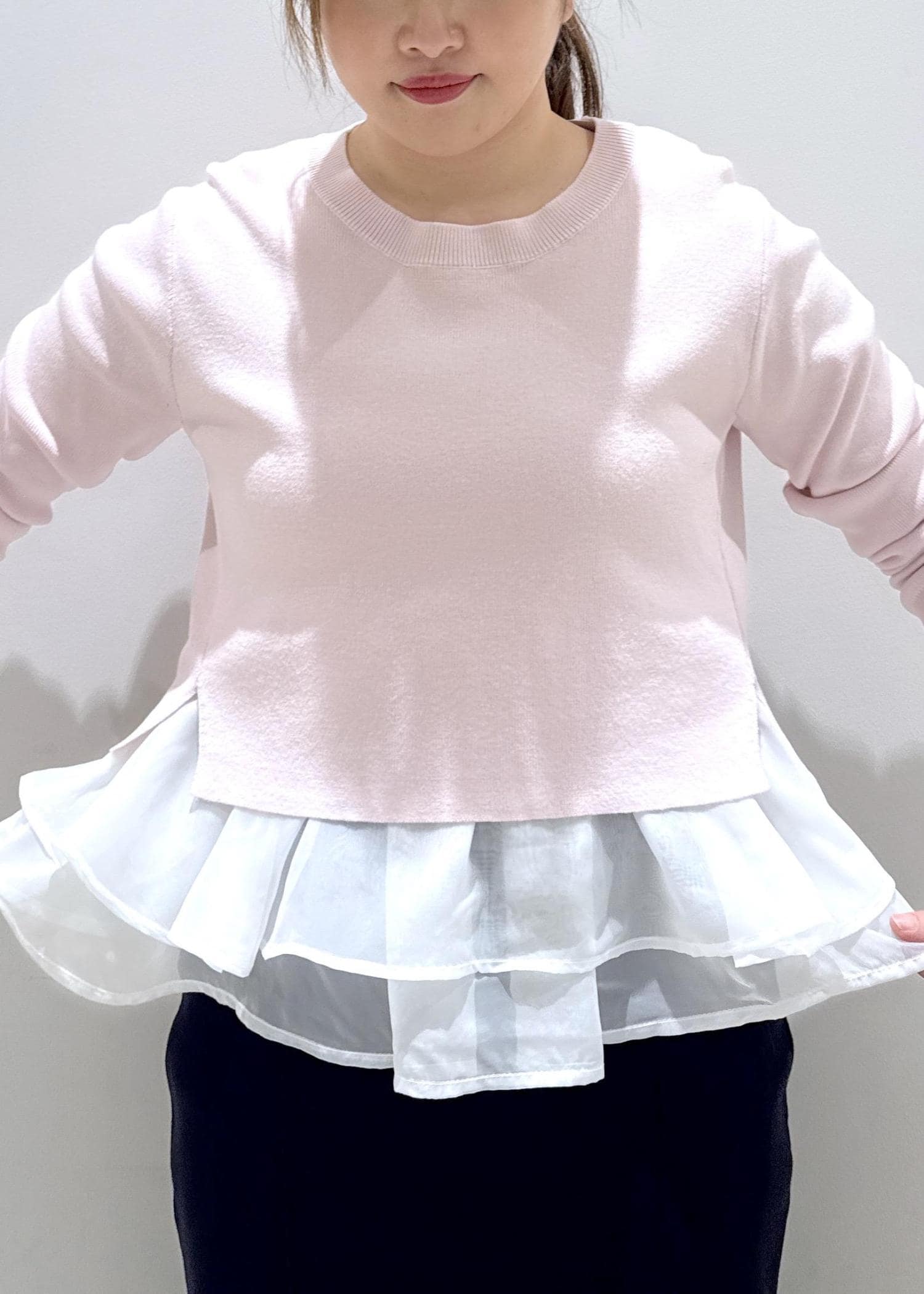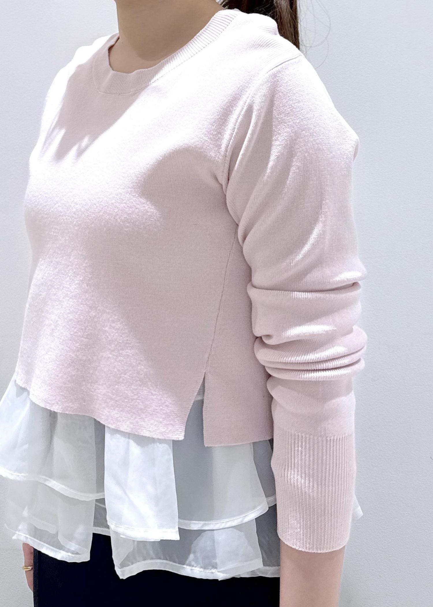 VIS【美得】ペプラムオーガンジードッキングニットプルオーバーピンク / F¥5,929レビュー中のフリルタンクトップとセットになったニットのトップスです。生地は薄過ぎず分厚過ぎずに今から春まで長く着れそうです。首元も開きすぎず、身長157cmでちょうどお腹周りが隠れるデザイン◎1枚で楽にレイヤードが楽しめるので忙しい朝の時短になります!オススメです。
