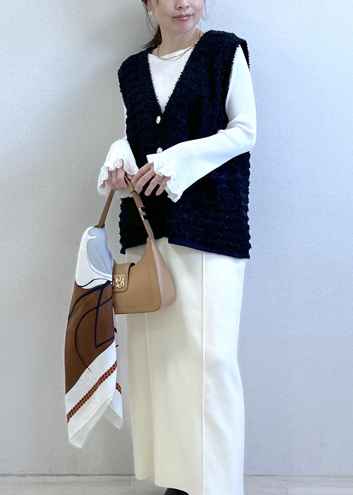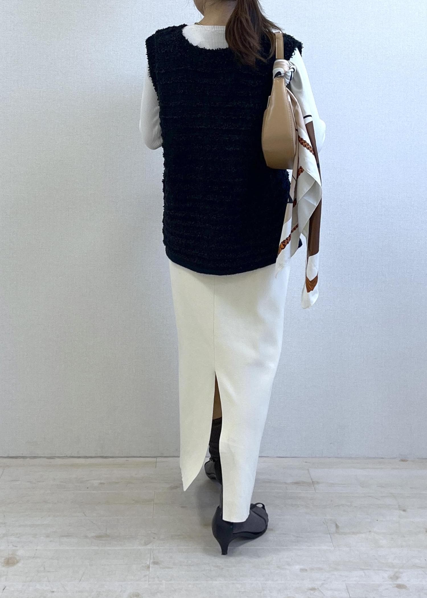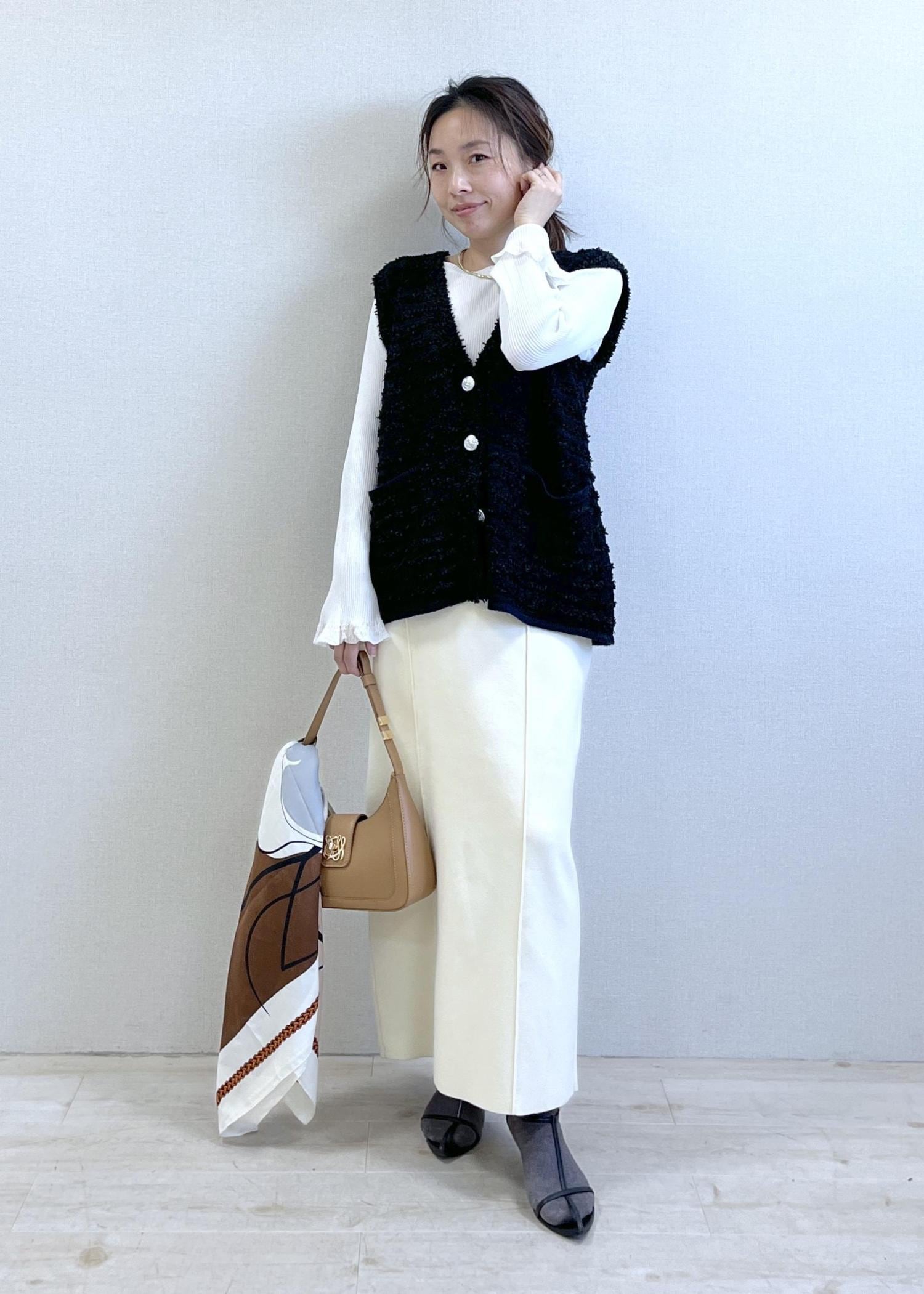ツィード素材のベストで程よくきちんと感を出しつつ、