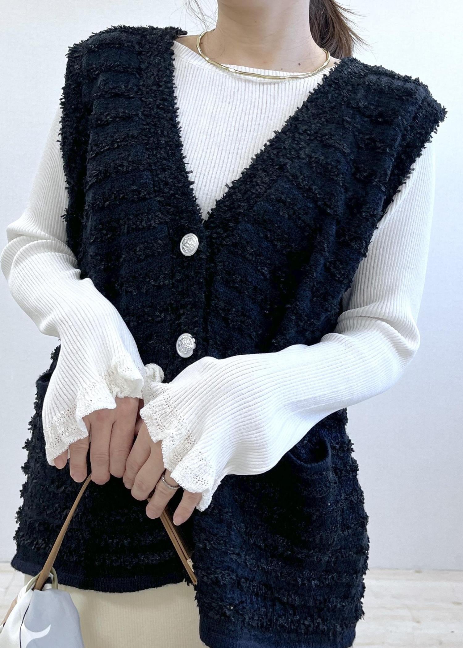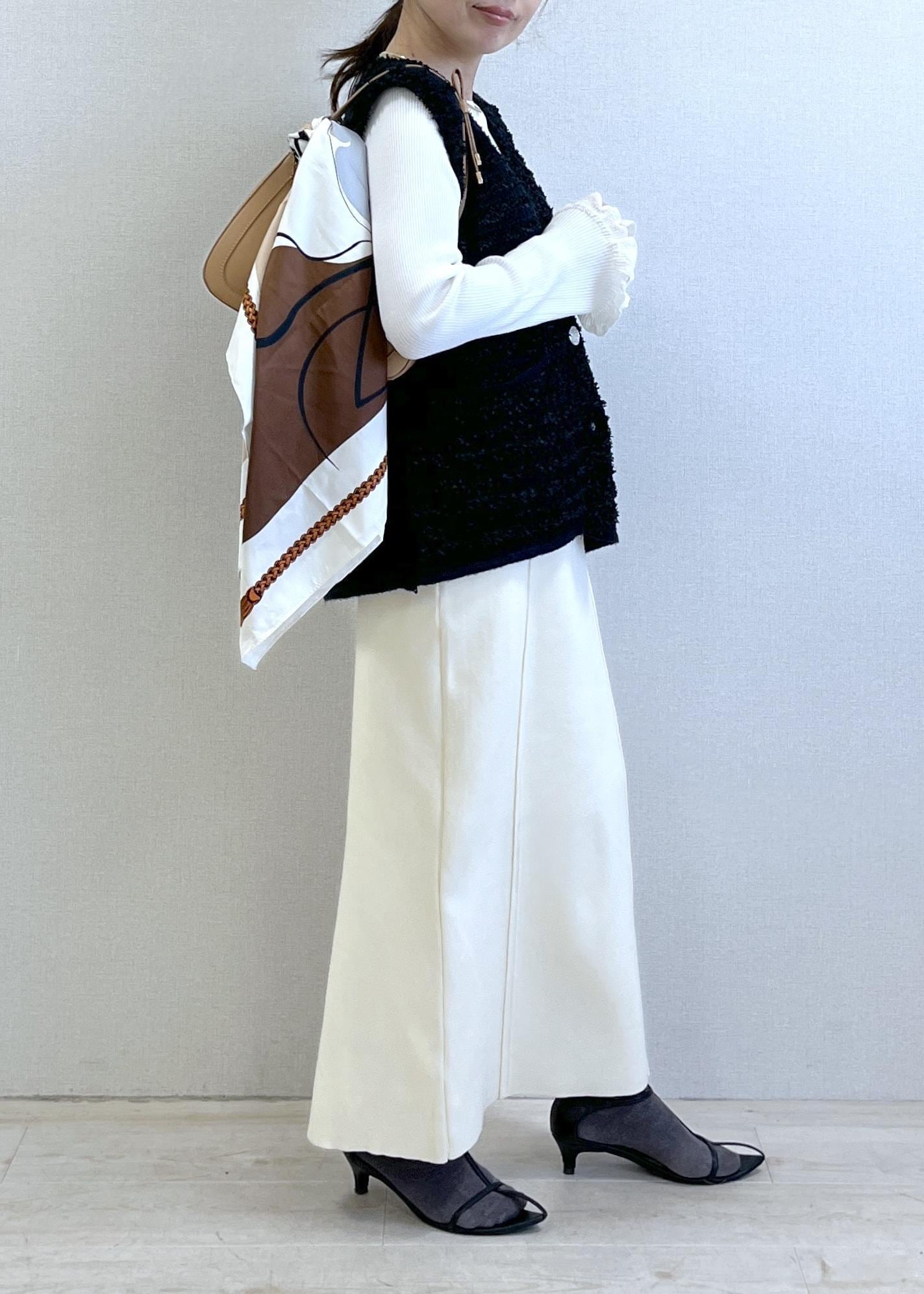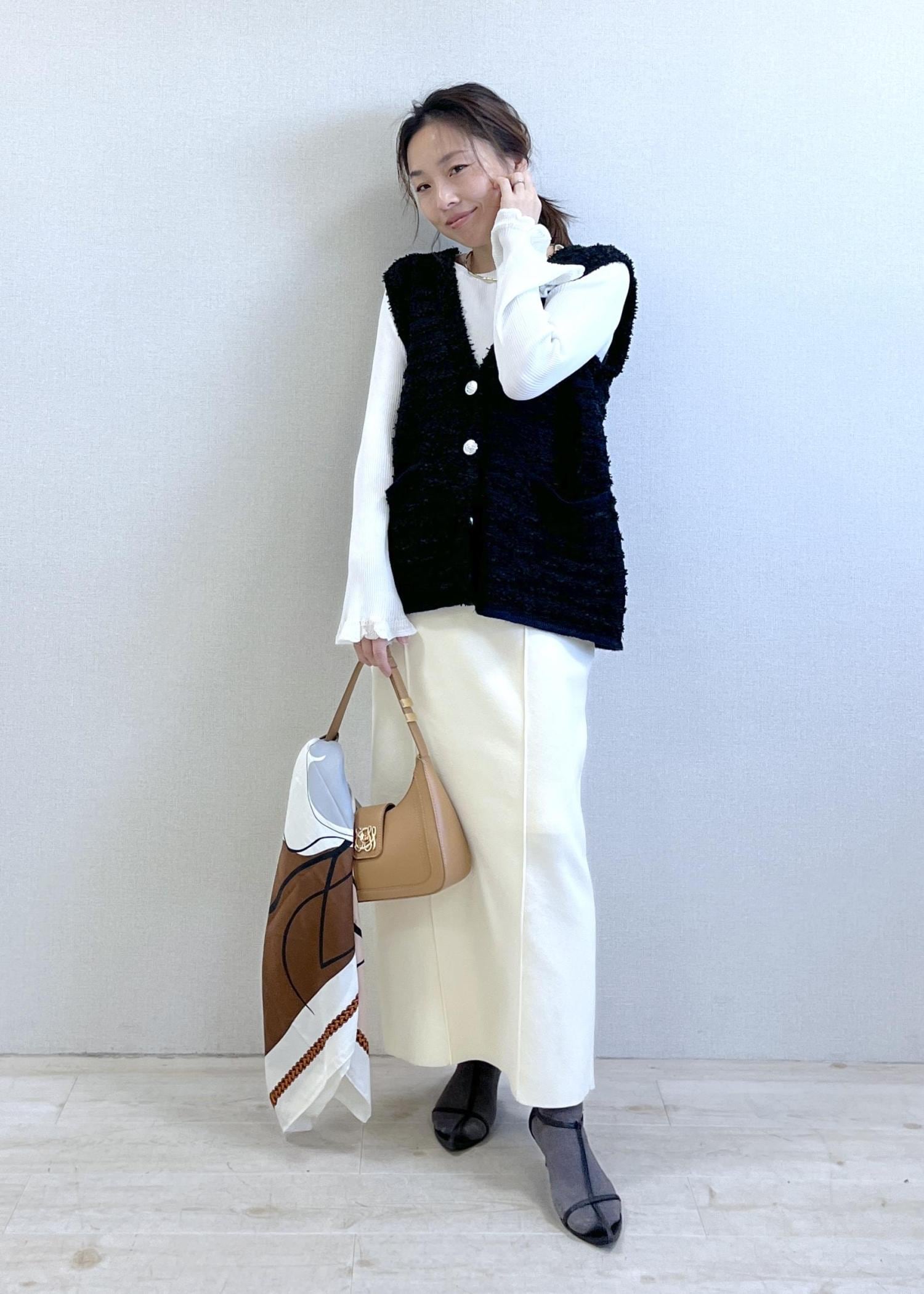 ツィード素材のベストで程よくきちんと感を出しつつ、