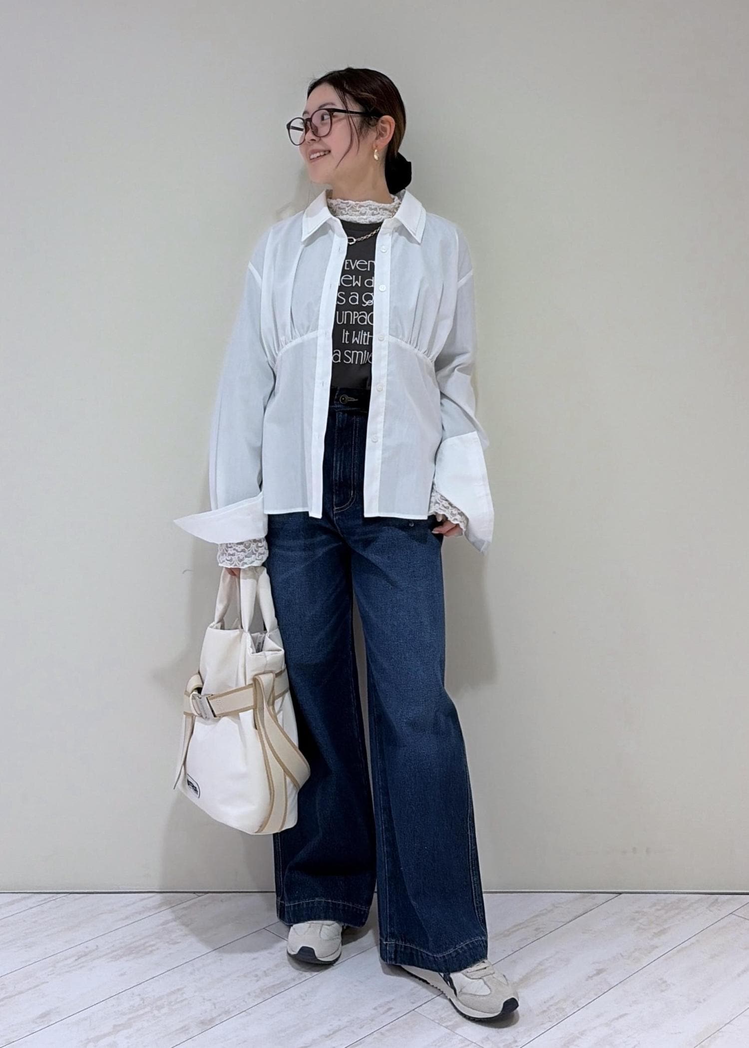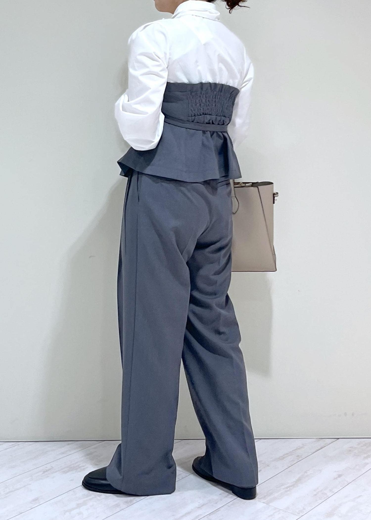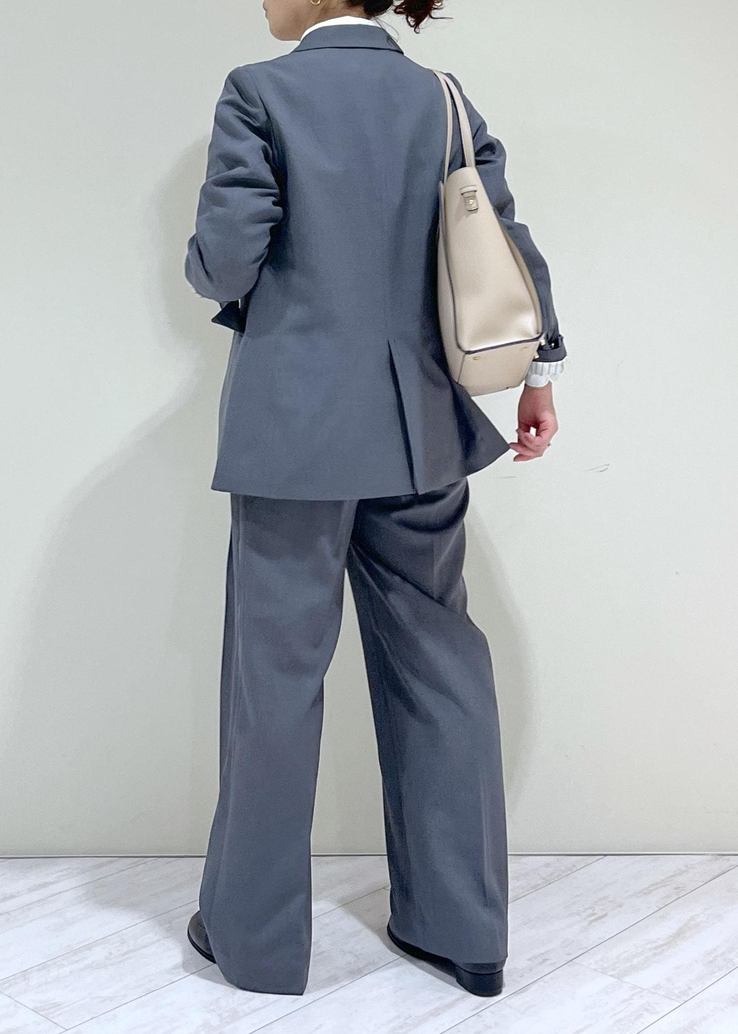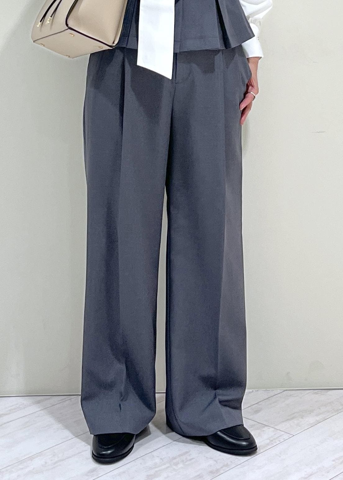 素足だと床に少し付いてしまいます。少しヒールのある靴やスニーカーだと安心ですし、脚のラインもきれいに見えます。 -