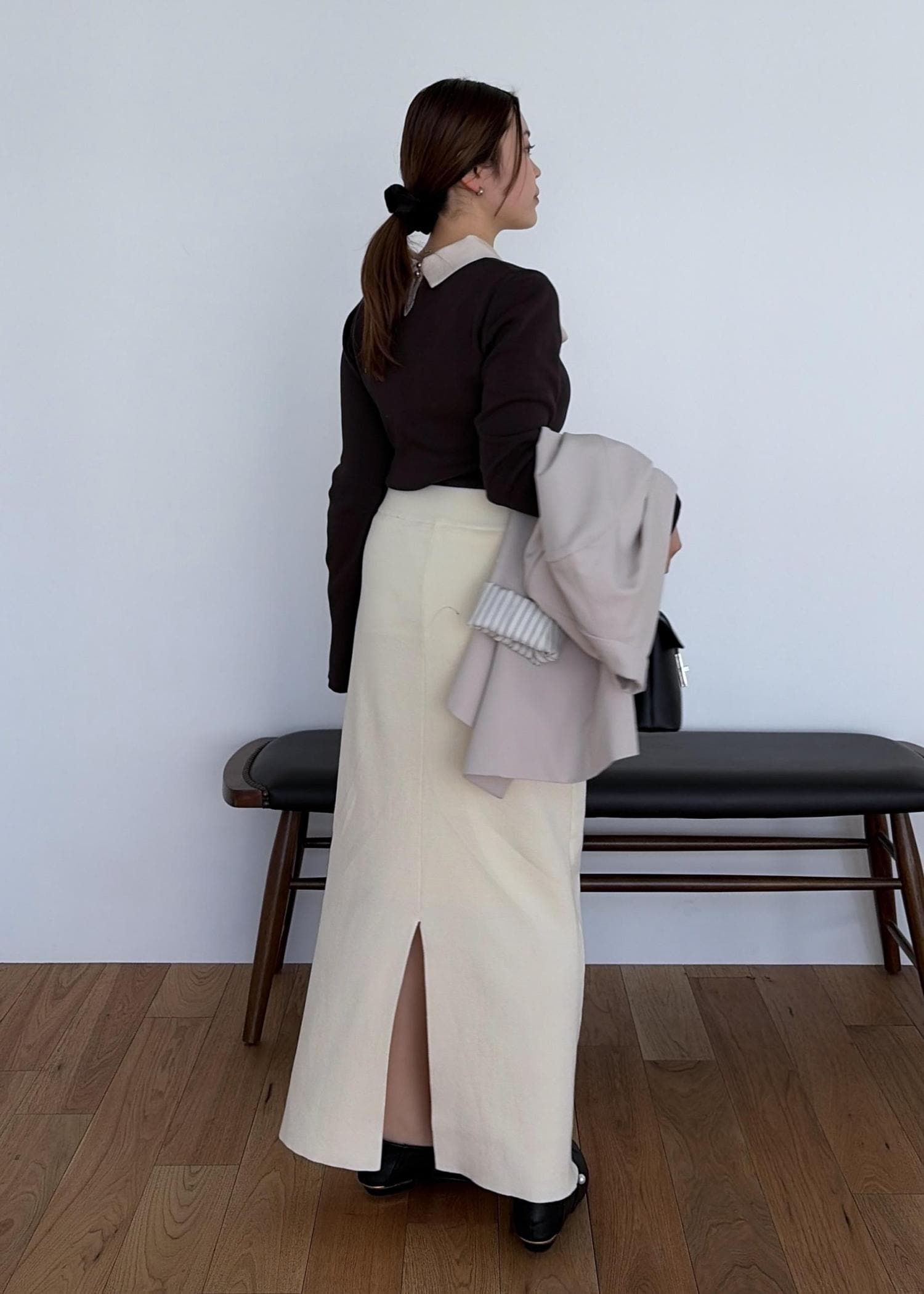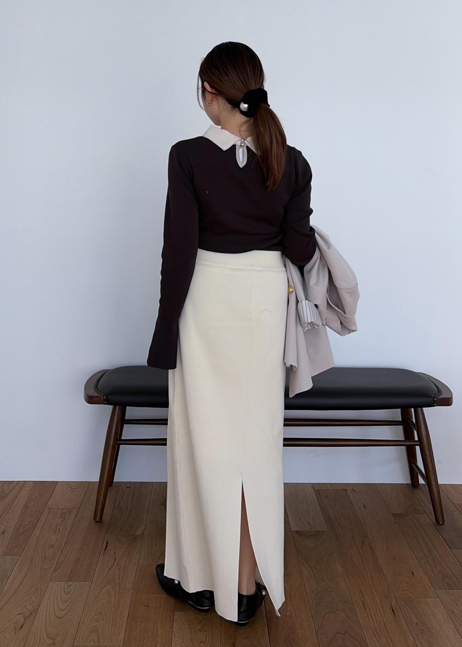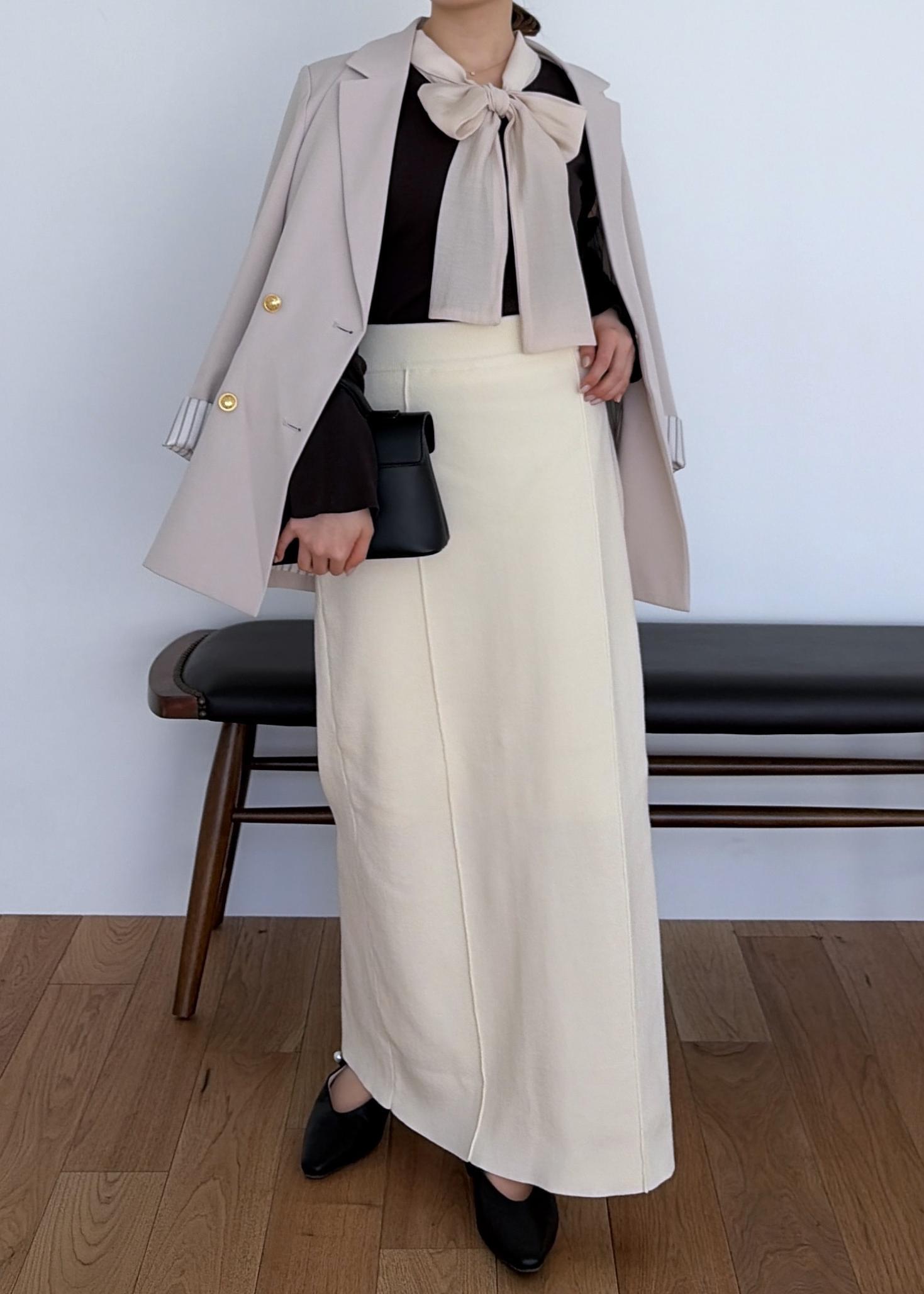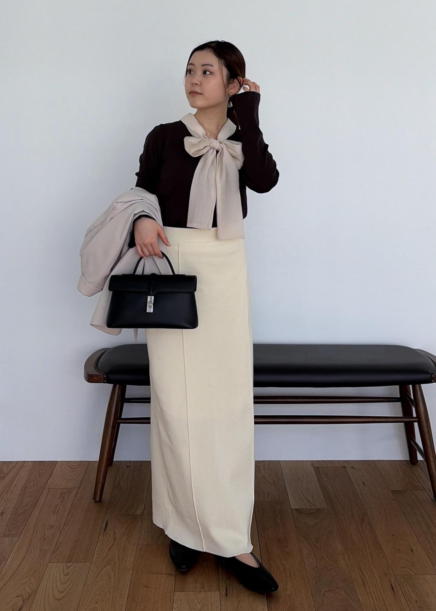 VISピンタックデザインニットスカートオフホワイト / F¥5,929レビュー身長150センチ、フラットシューズ合わせでも床つかない丈感で、くるぶし隠れるくらい