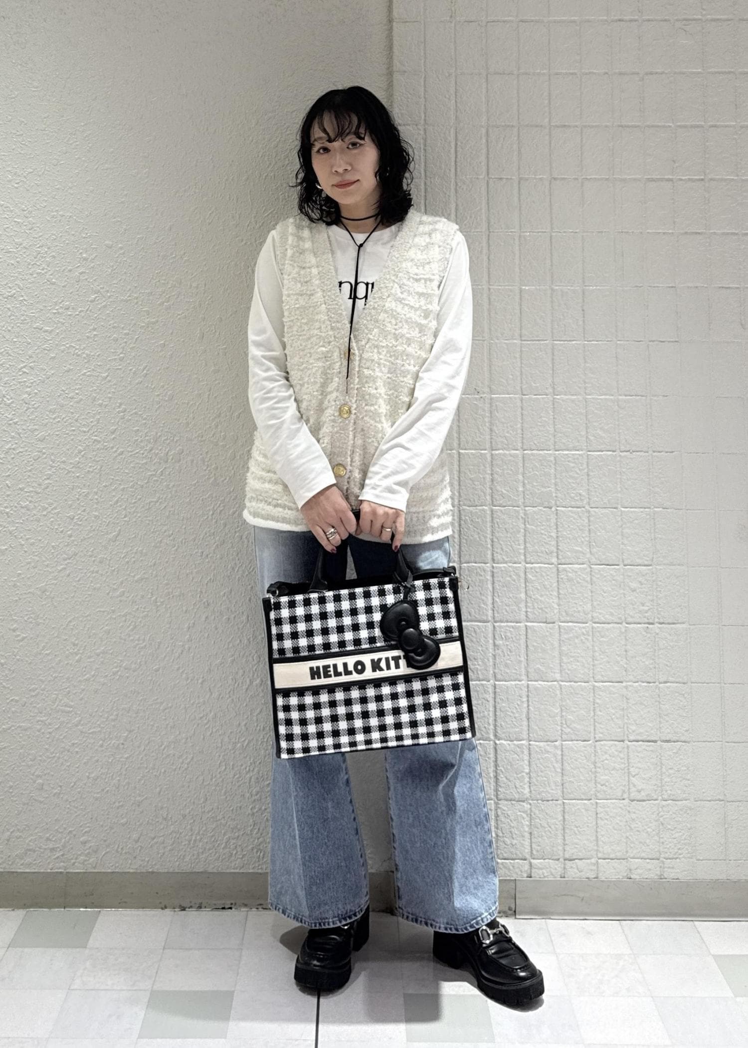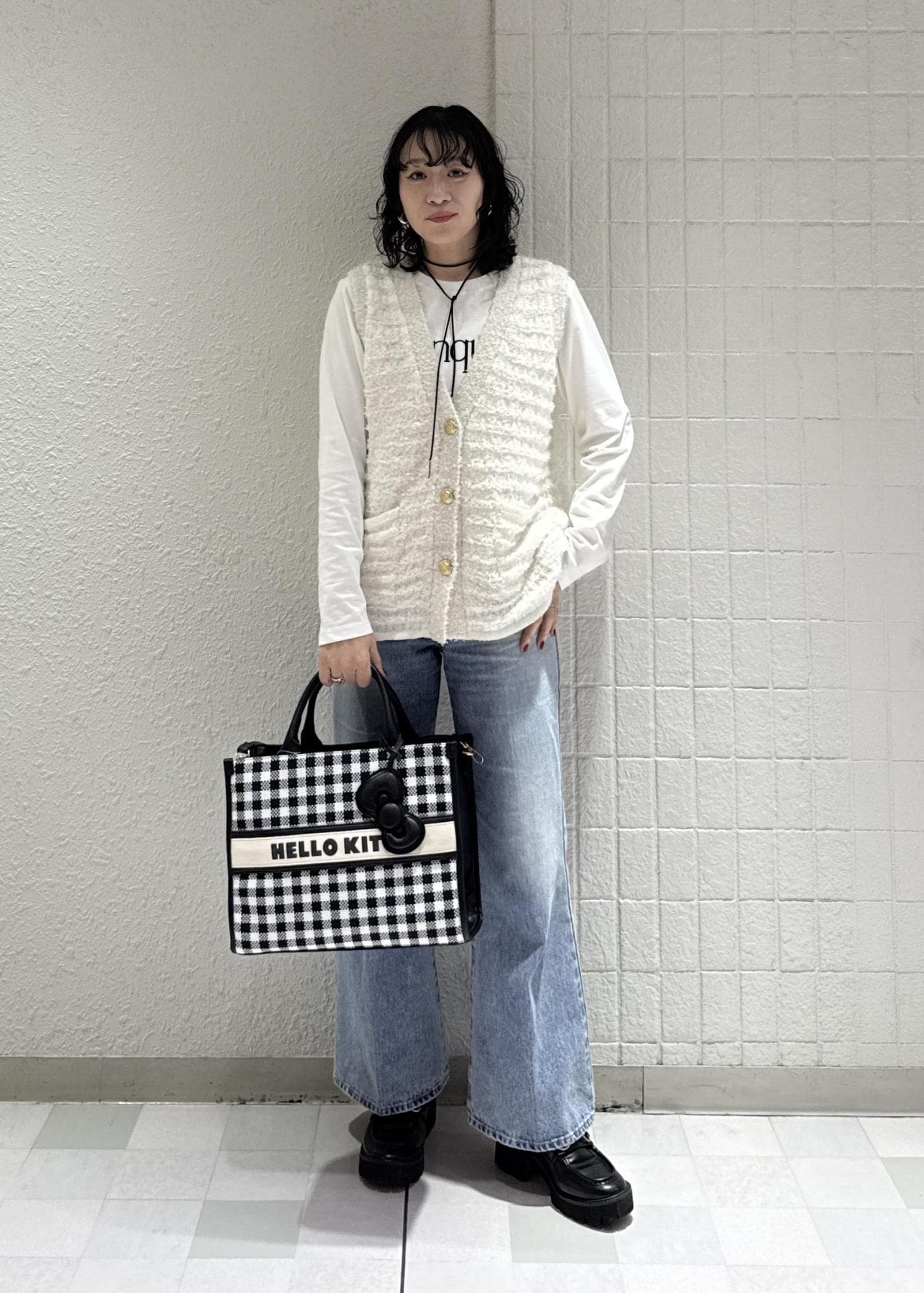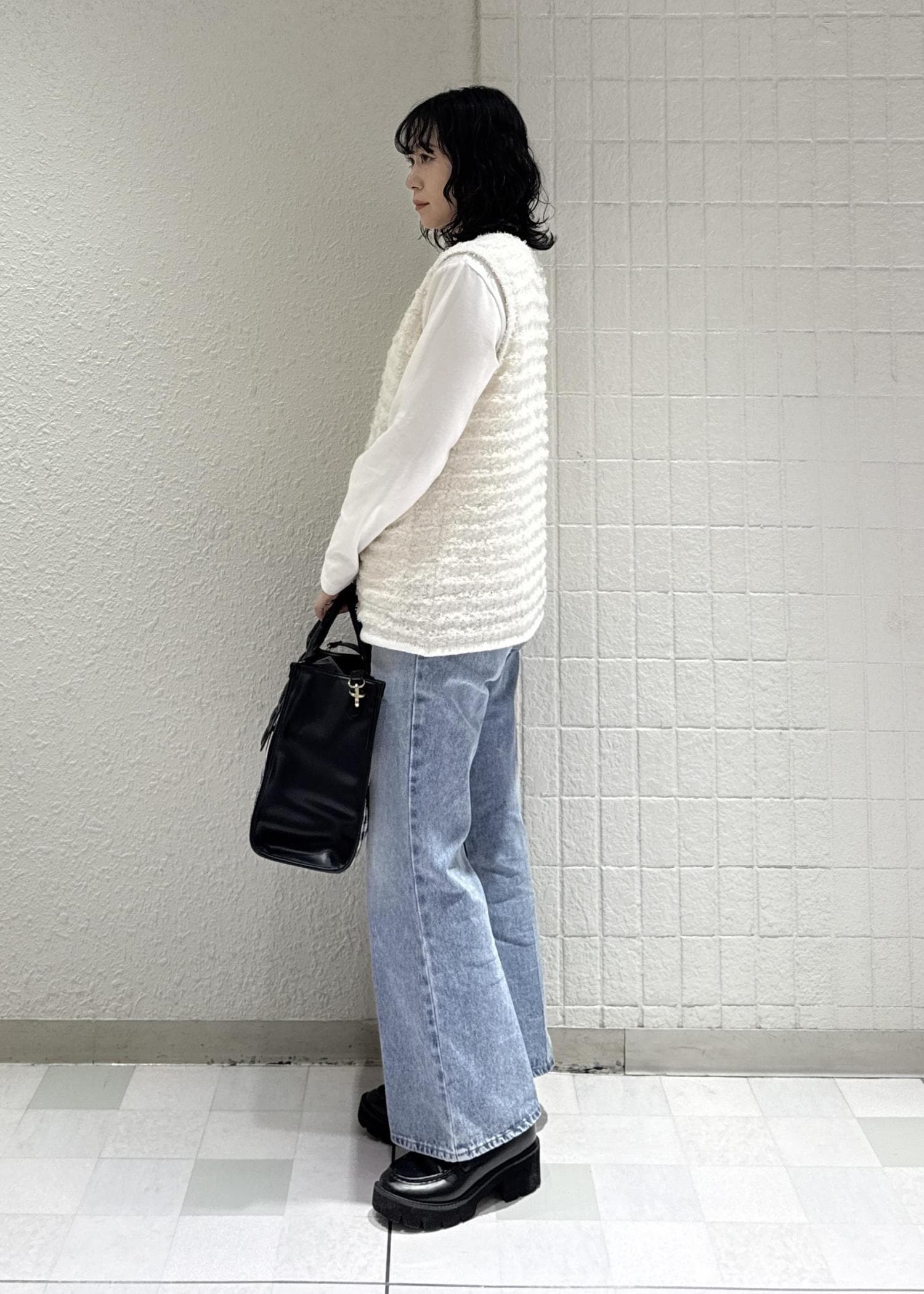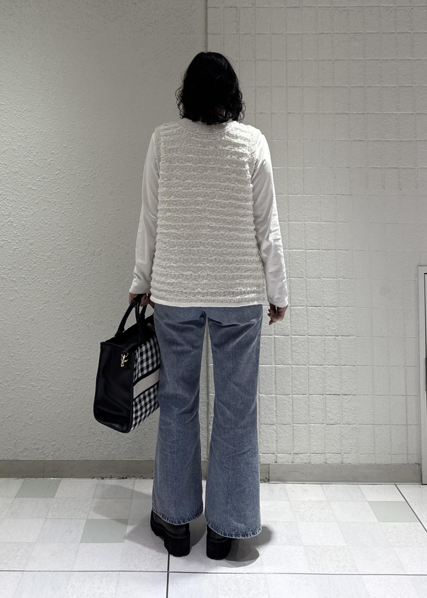 セレモニーでも使えるツイードニットベストをデニムで合わせたカジュアルコーデに!