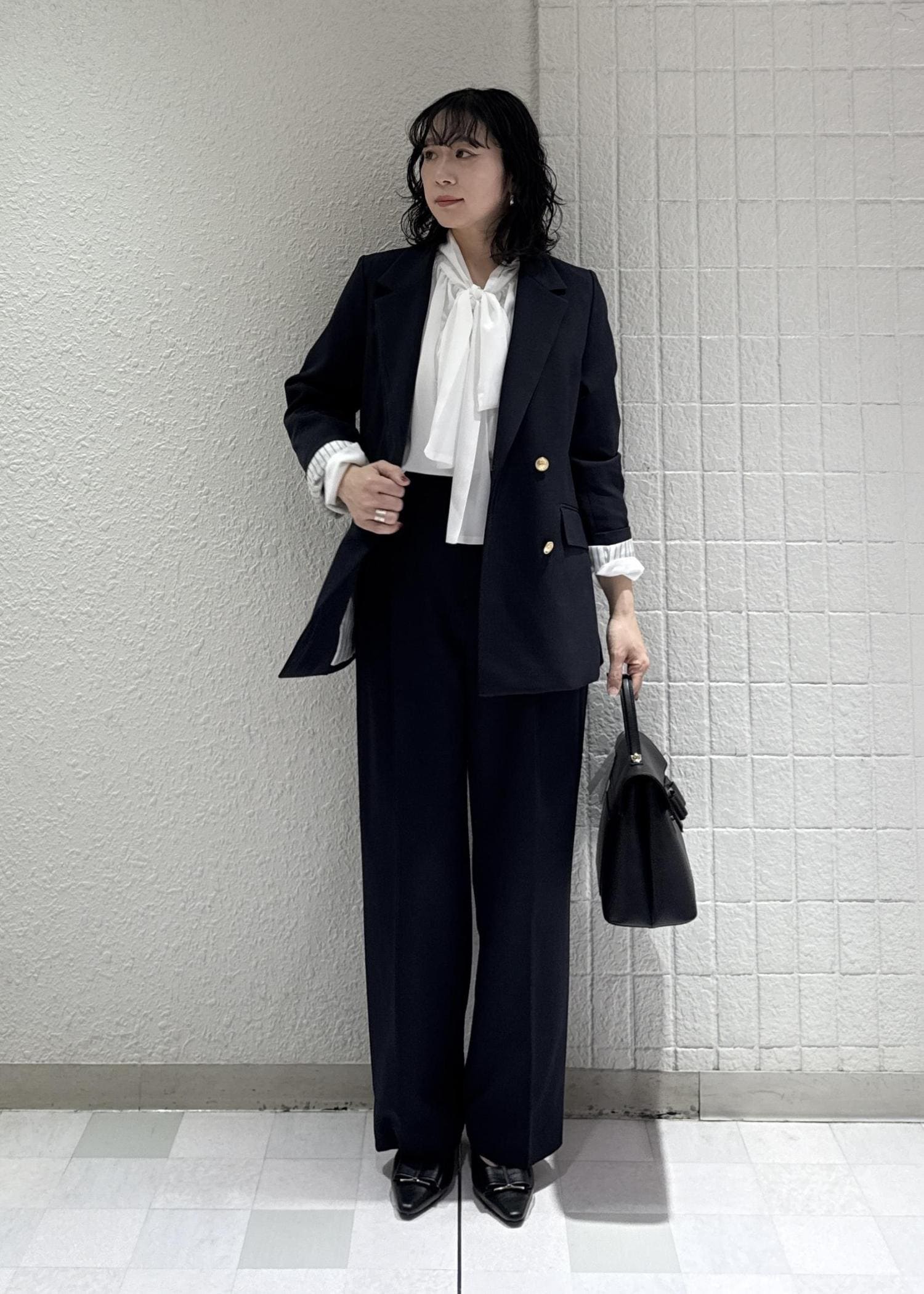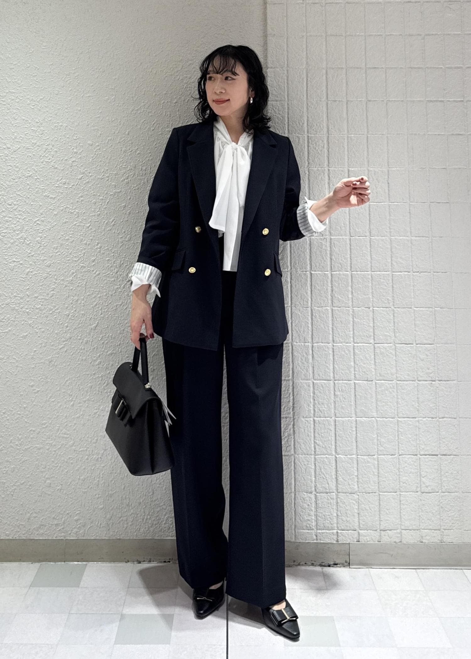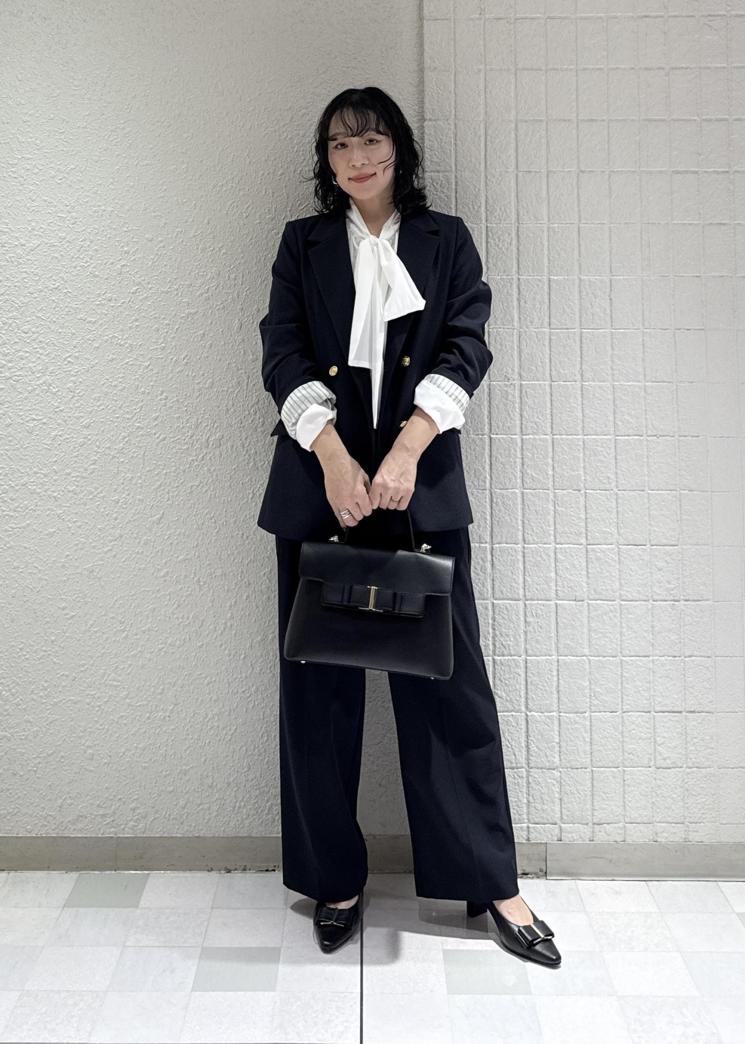 春に大人気のセットアップ、セレモニーコーデにしてみました。ネイビーのセットアップは普段着使いからセレモニーまで