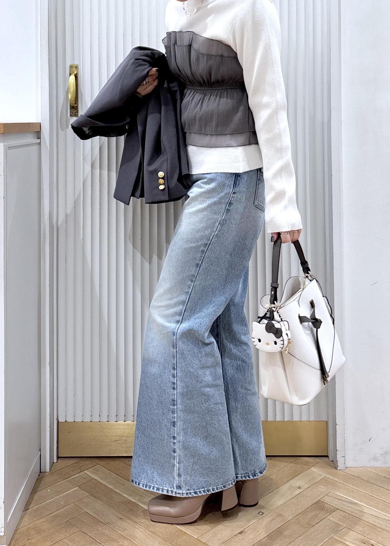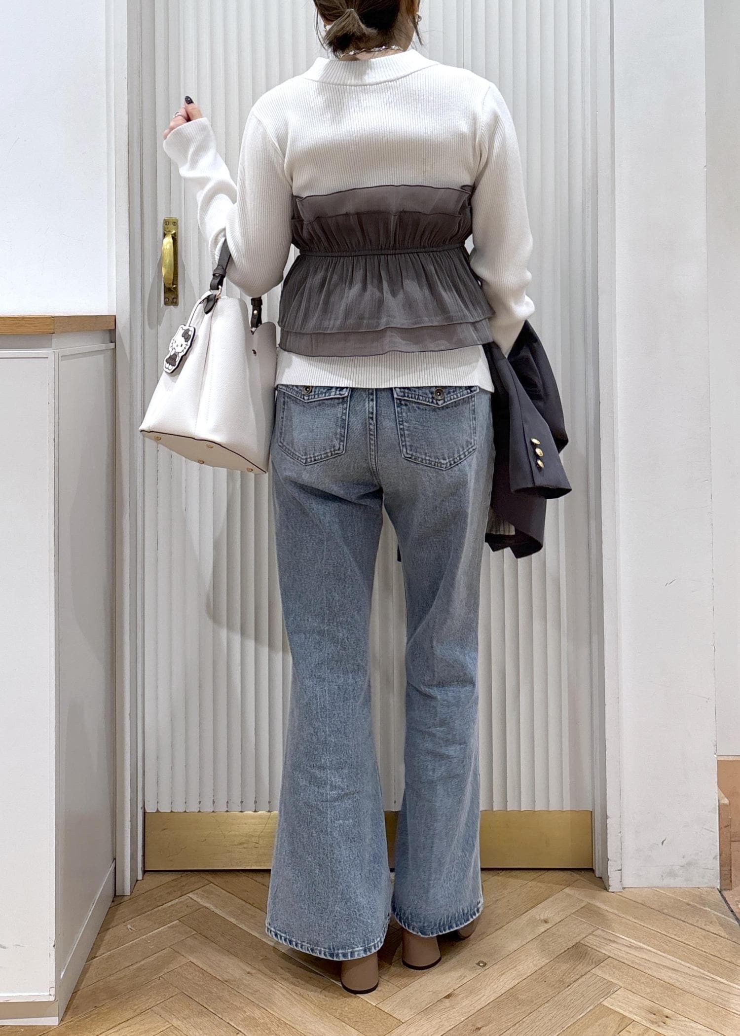 157cm、Mサイズをリアルバイ。膝下からフレアーががっておりヒールを履かなくても自然にスタイルアップ出来るデニムです。Sサイズは丈が短かめでウエストや太もものラインもピッタリでした。