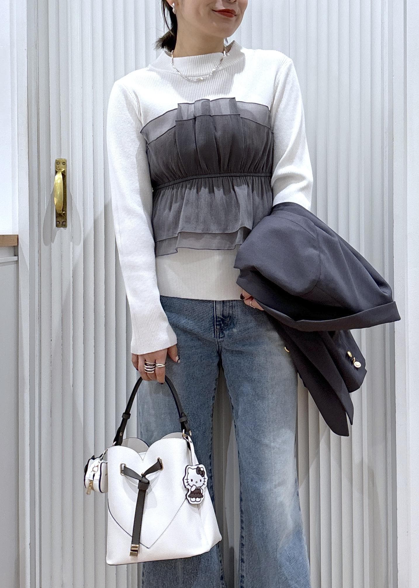 大人っぽくグレーをポイントにワントーンでまとめてデニムでラフに合わせてみました。よくこのニット、裾出して着ますか?しまいますか?とご質問頂くのですがどっちもOK!