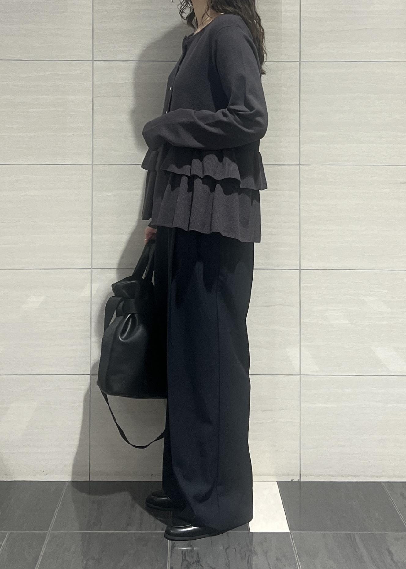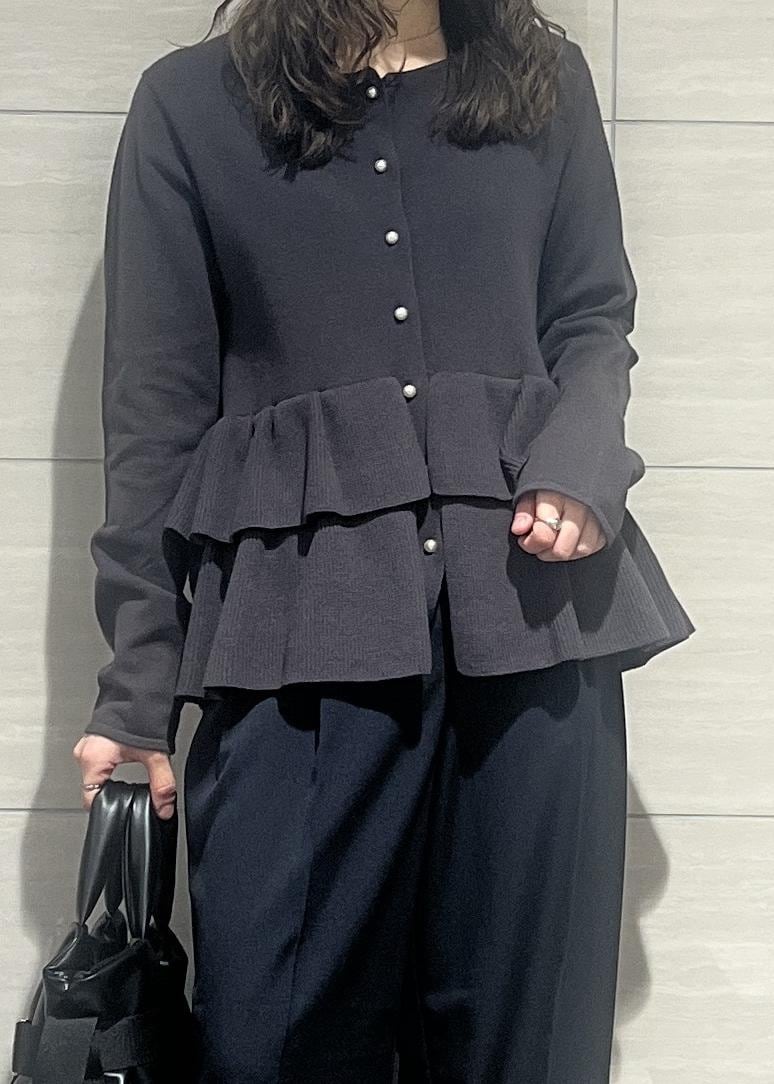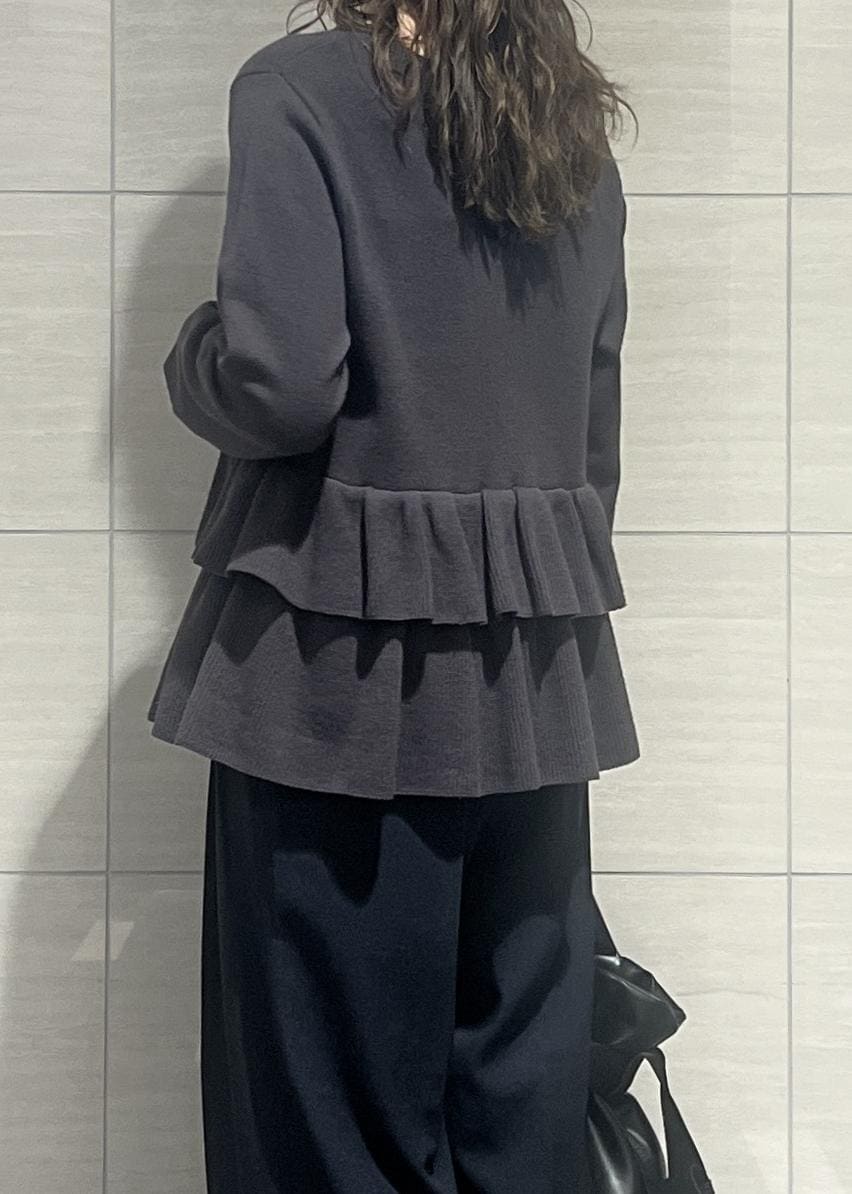 VISティアードペプラムニットカーディガンチャコール / F¥6,589レビューティアードのデザインが可愛く、腰回りをカバーしてくれるのが嬉しいポイント✨ストレッチのきいたニット素材で着心地が良いです!