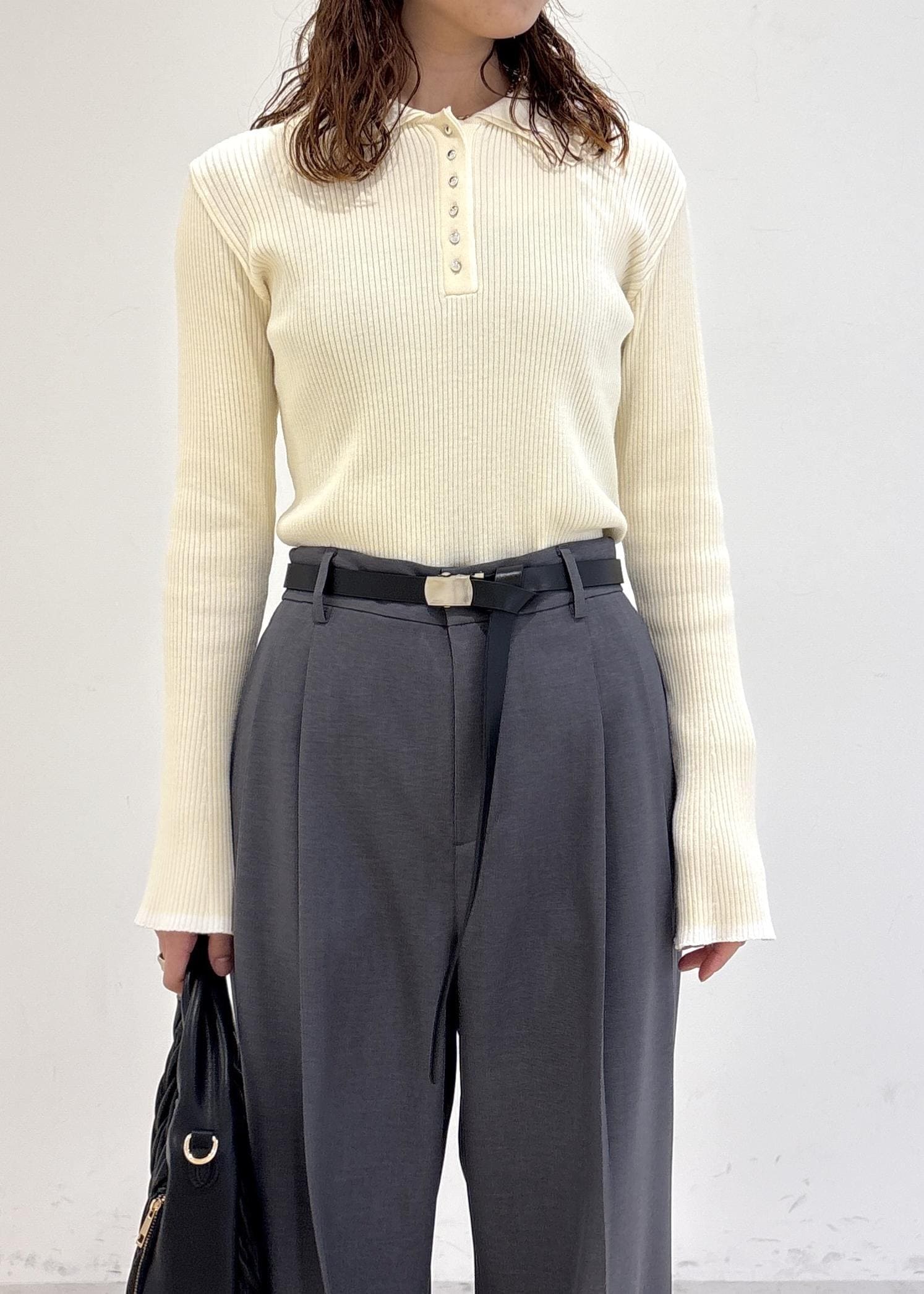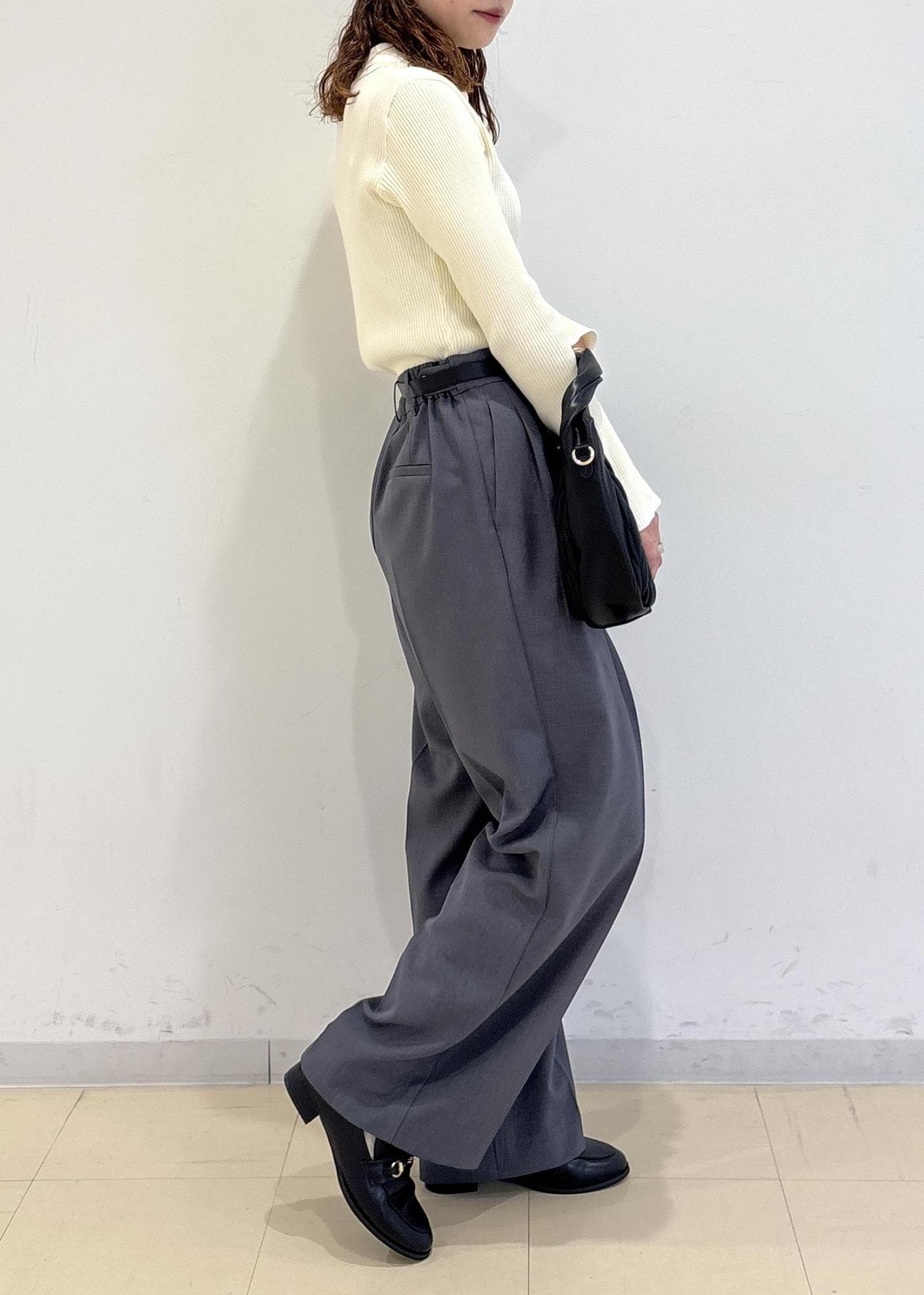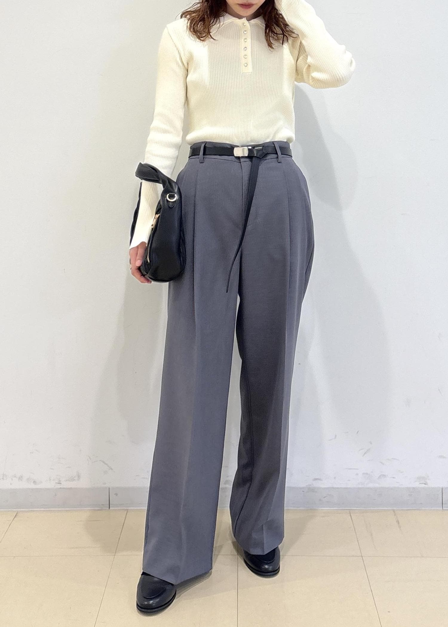 ポロ襟ニットとストレートワイドパンツを組み合わせた