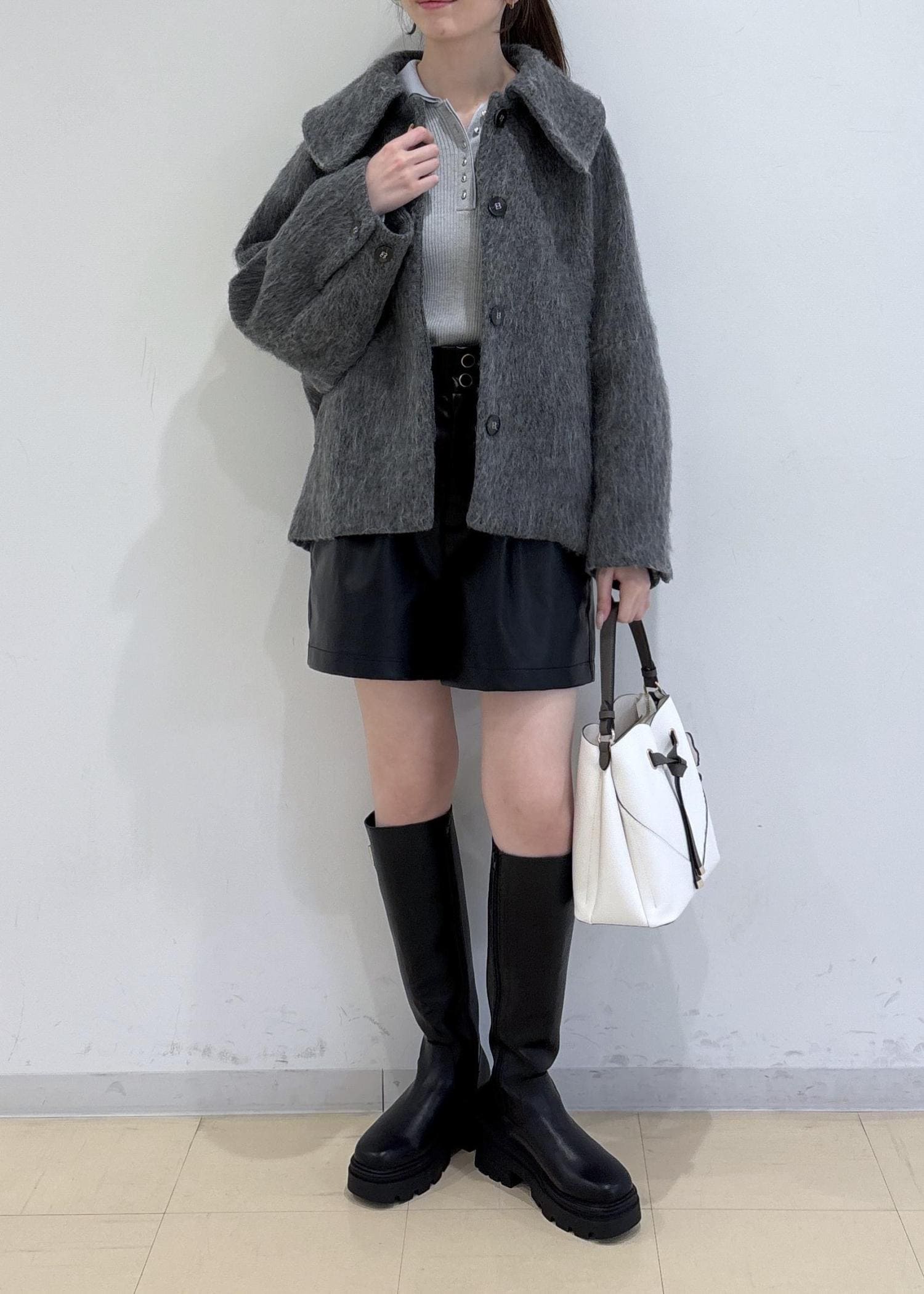 ショートパンツはレザー素材なので甘くならず、丈も短すぎないので大人な印象です。