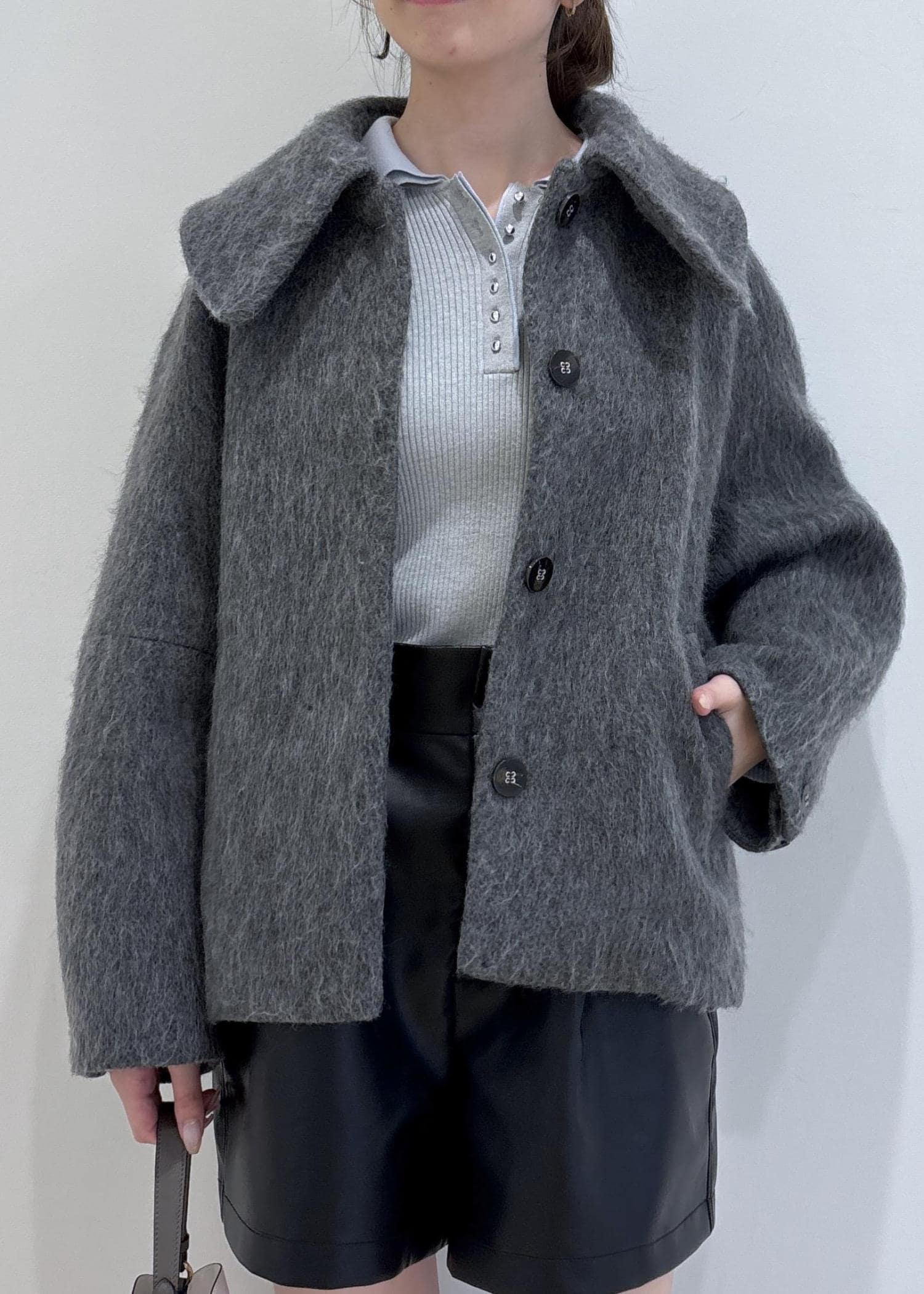 VIS【アウター総選挙1位】ビッグカラーモモンガシャギーショートコートグレー / M¥8,791レビュー163cmでMサイズ着用。緩やかにカーブしたシルエットが可愛い!羽織心地も軽いのでストレスフリーで着ていただけます◎