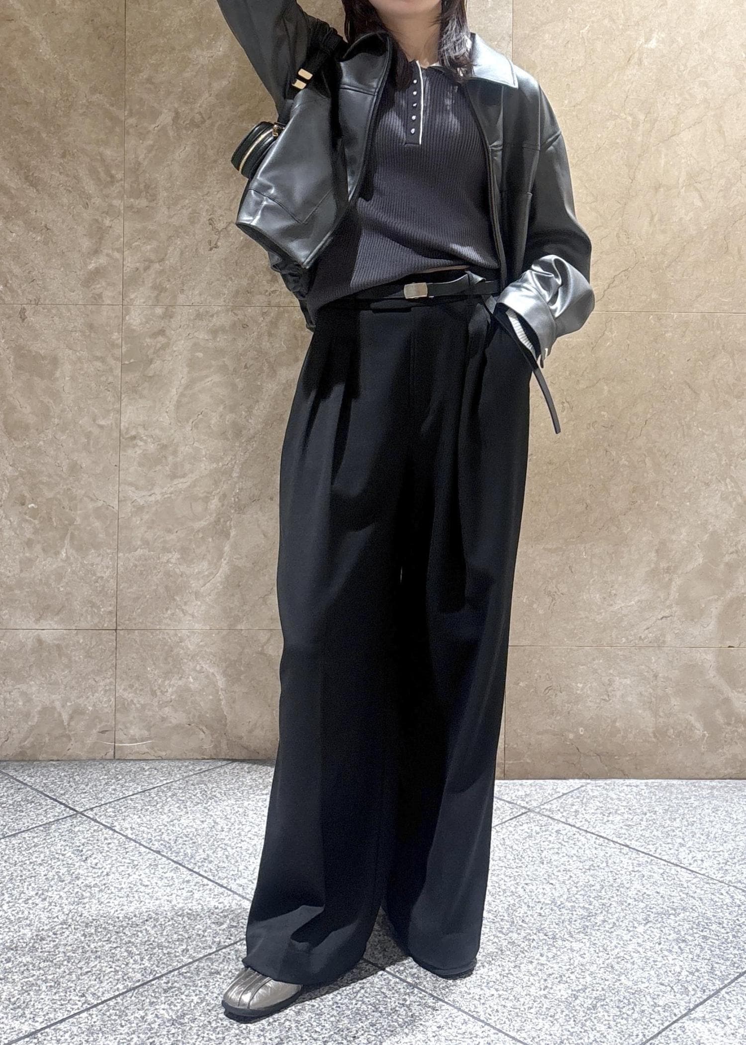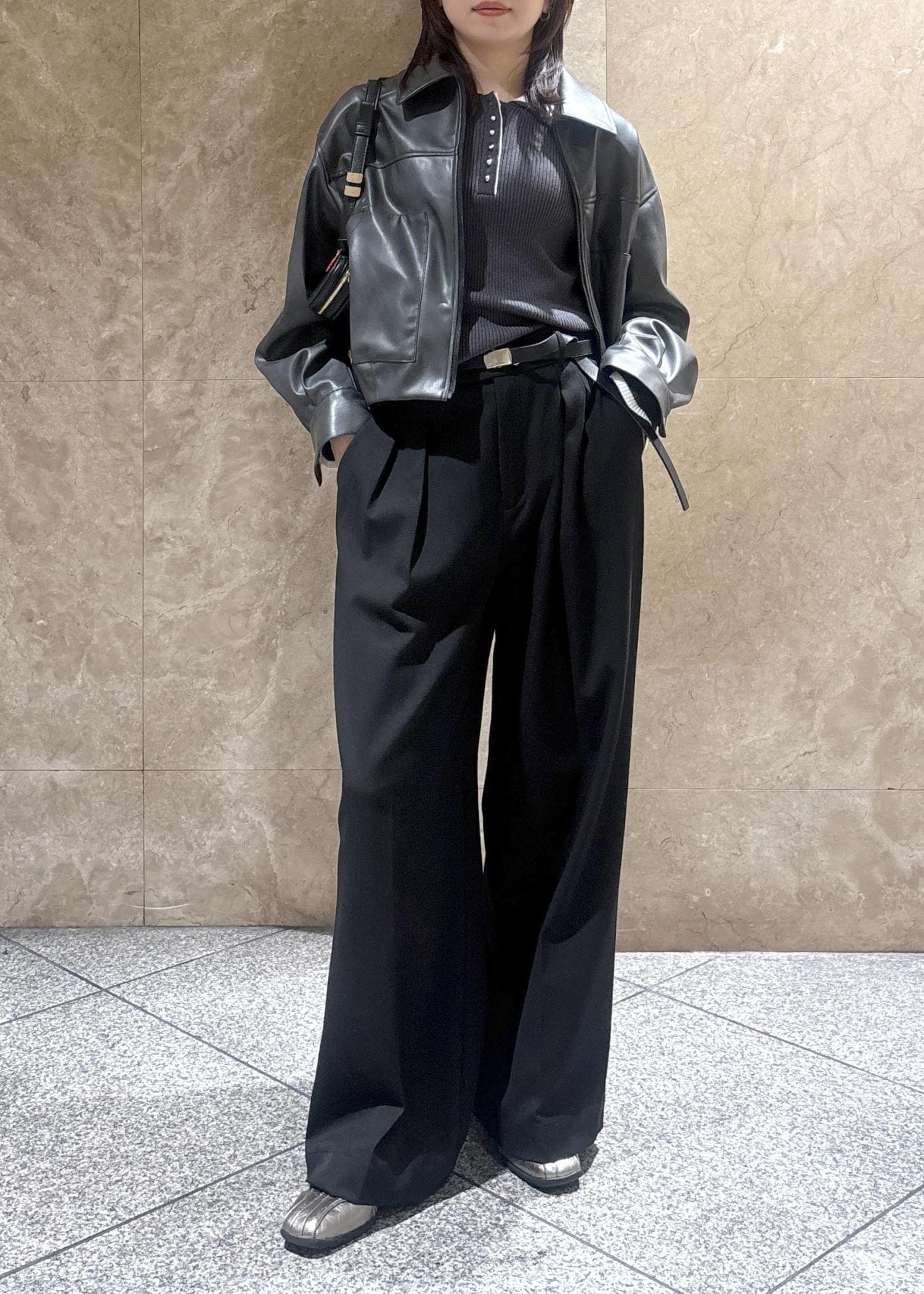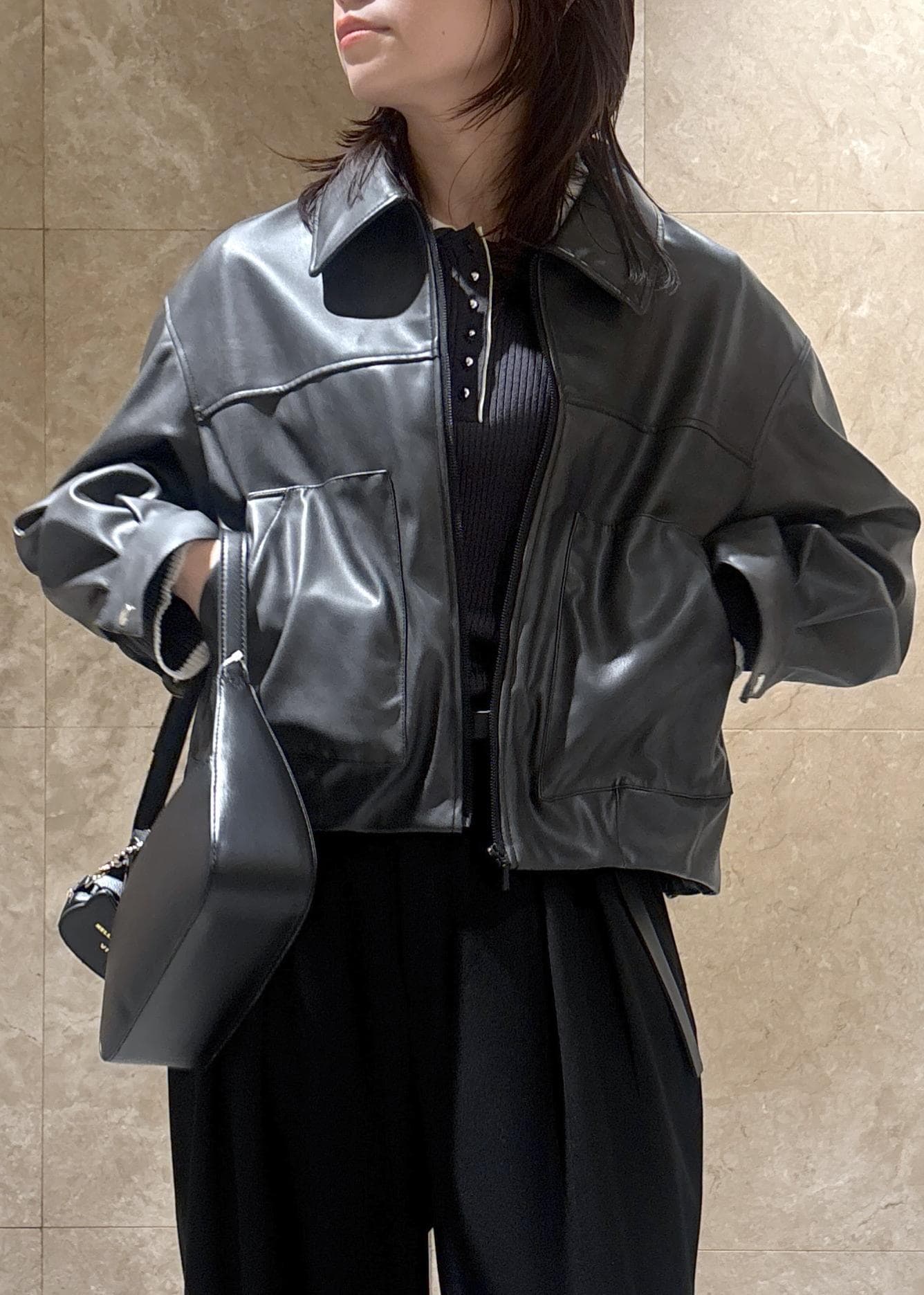 VISアウトポケット合皮ブルゾンブラック / F¥10,989レビューコンパクトなサイズ感ですが、脇周りや身幅にはある程度ゆとりがあり、厚みのあるニットの上からでも羽織りやすいです。