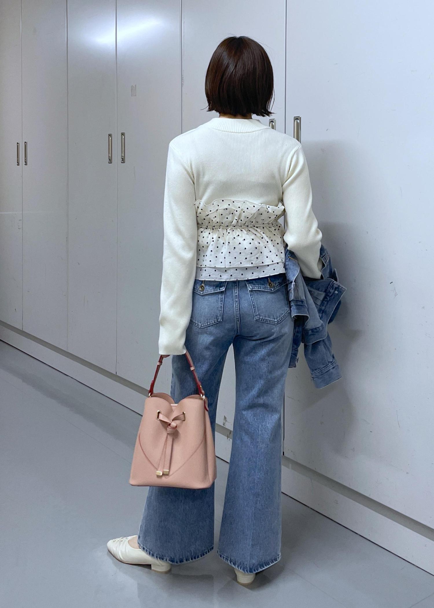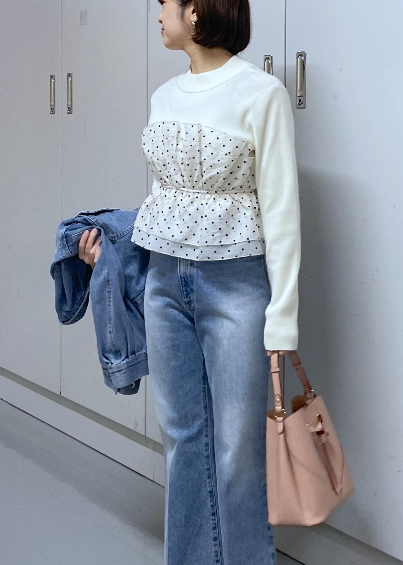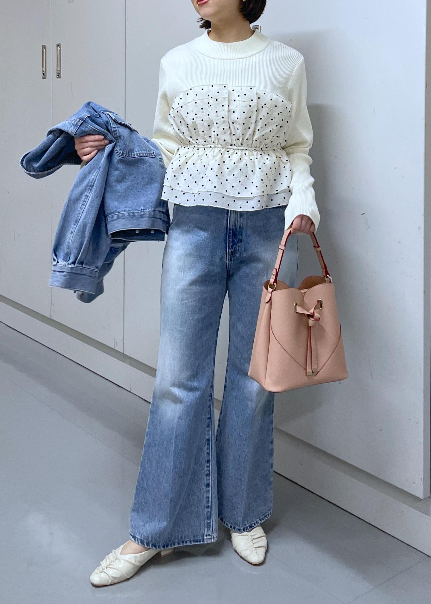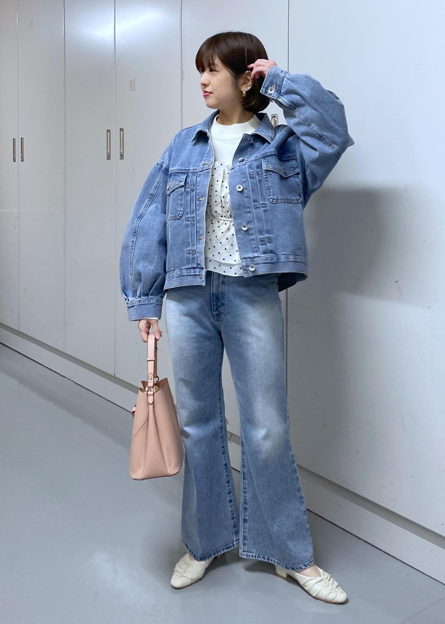 身長156cmで腰丈のコンパクトな着丈なので、小柄さんもバランスよく着やすいです。