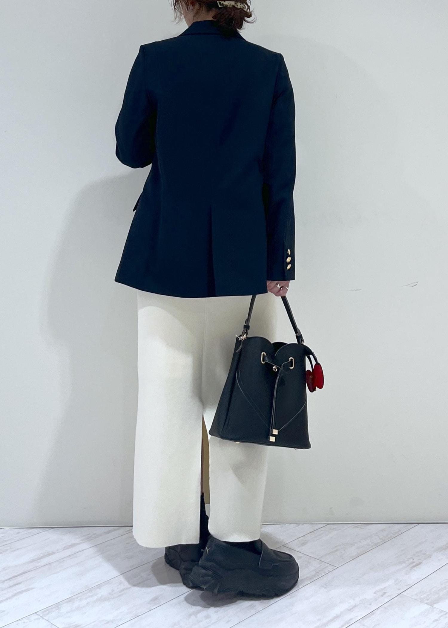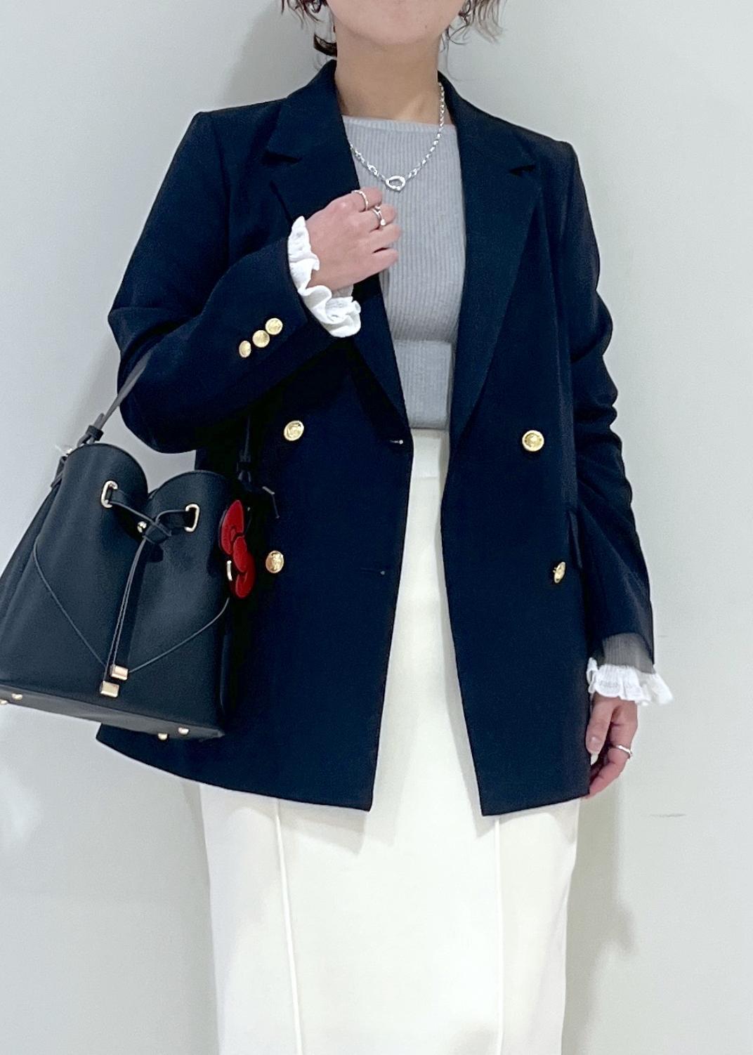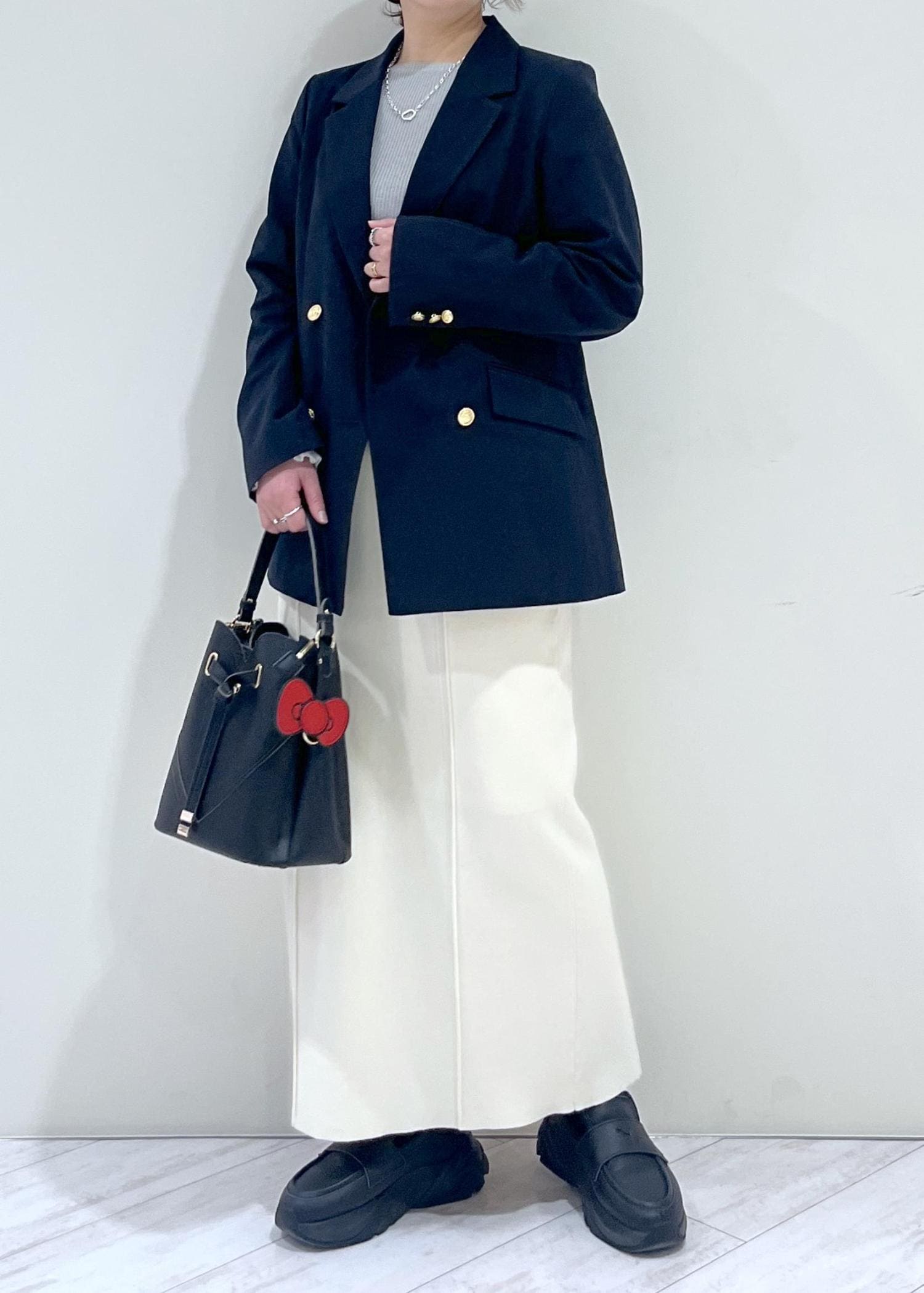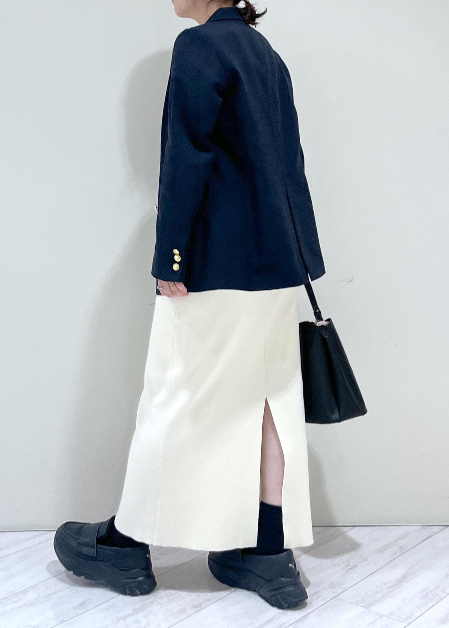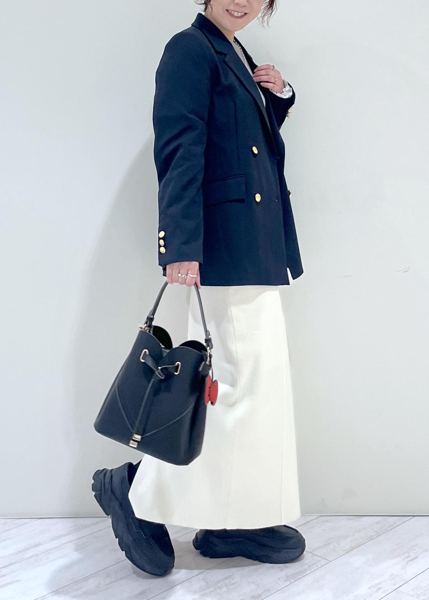 春の定番、紺ジャケットに大人っぽく白のニットスカートを合わせました。