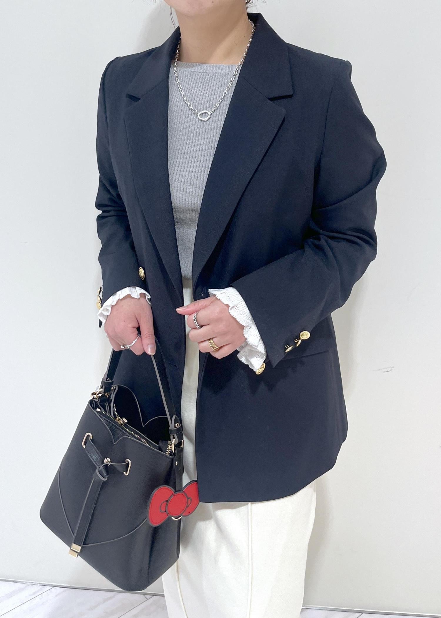 ジャケットのインナーもシンプルにまとめつつ、ちょっぴり遊び心も入れてハローキティコラボのハートバッグでアクセントを入れました♡