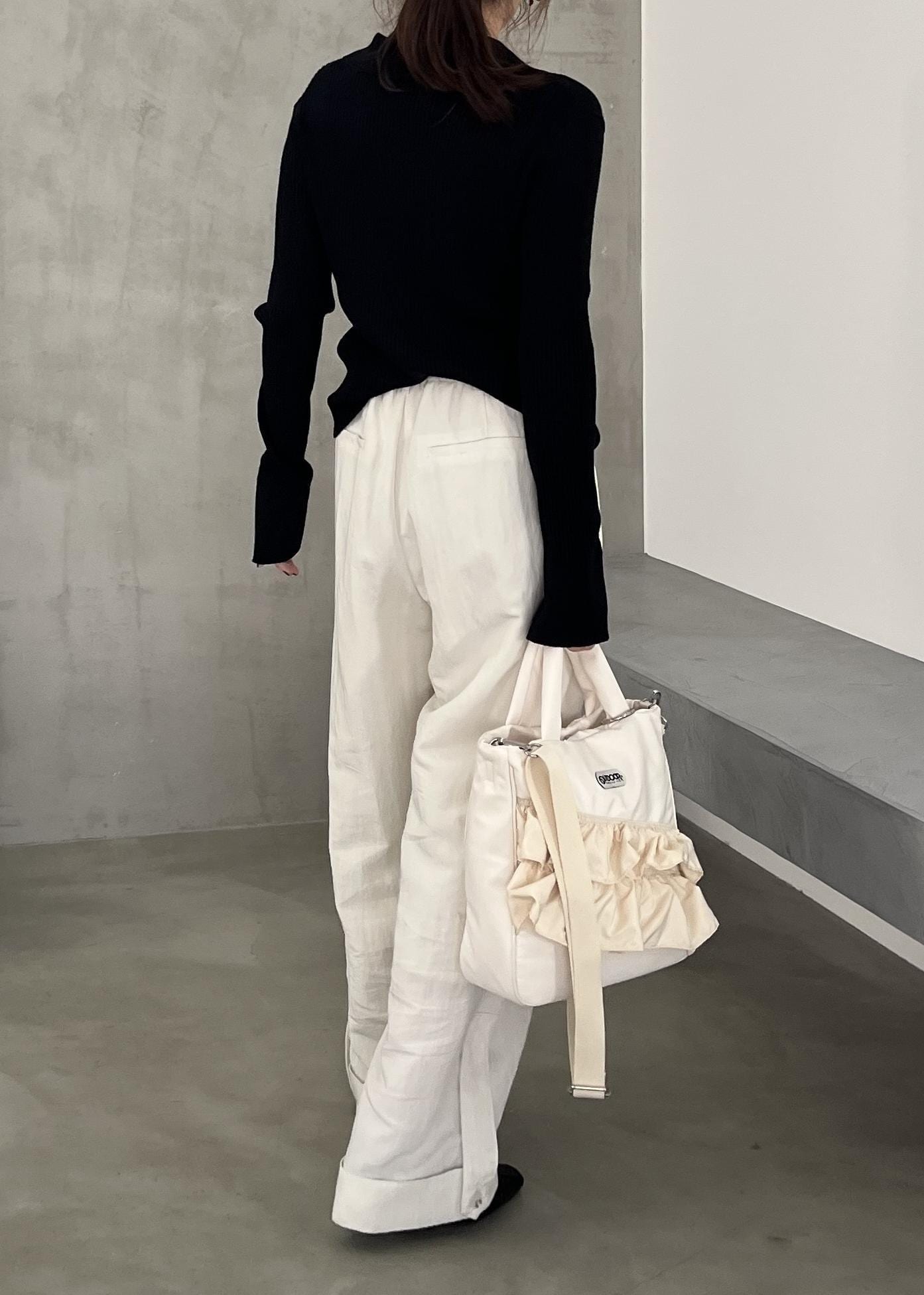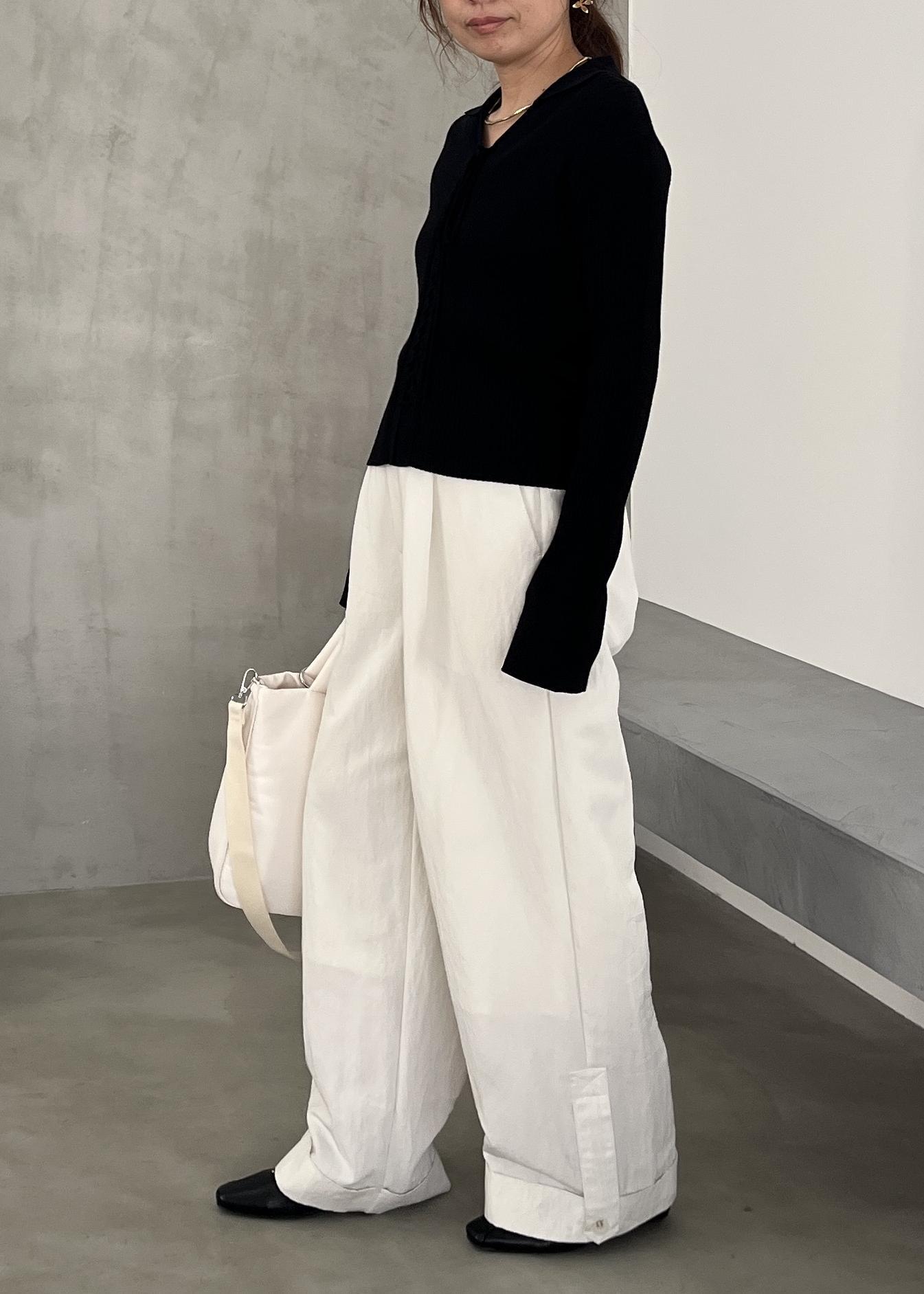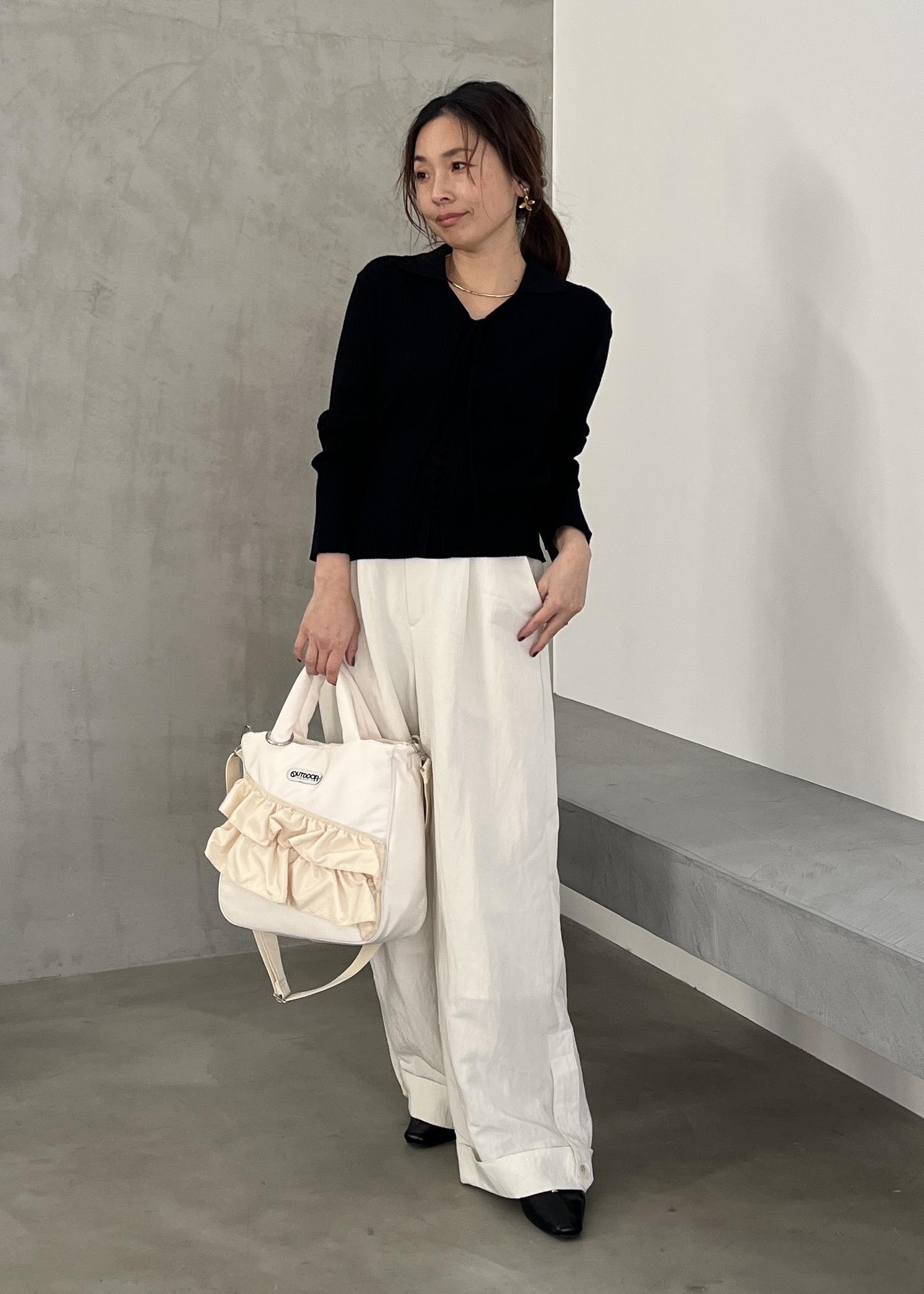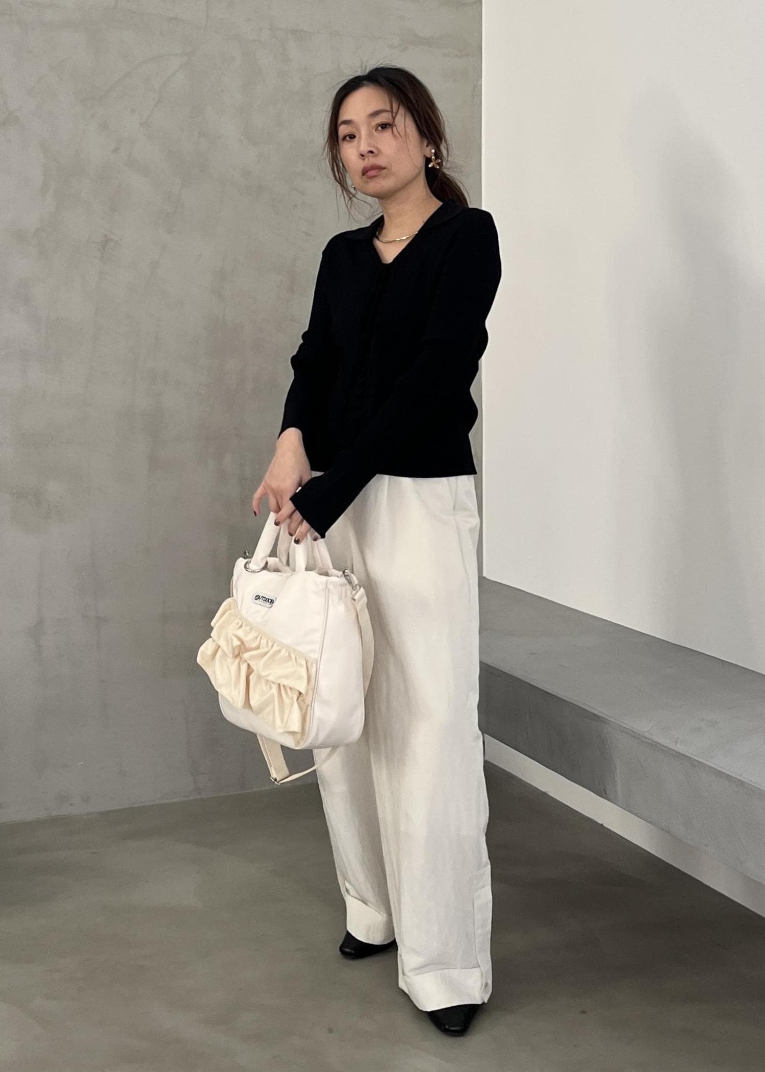 ブラックのトップスに、落ち感きれいなホワイトパンツを合わせた