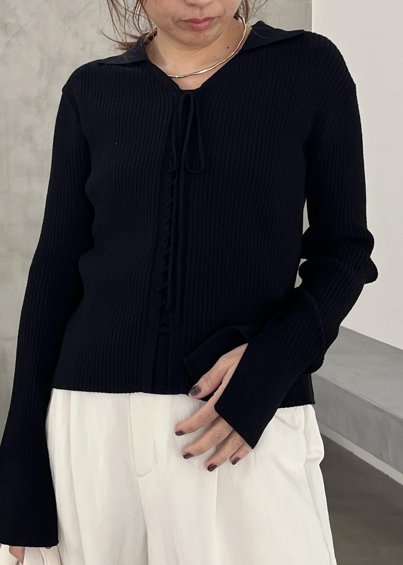 NEW! 予約VISレースアップリブニットブラック / F¥5,929レビュー152cmでFサイズ着用し、着丈は腰にかかるくらいの丈。とても柔らかく収縮性のあるニットで肌あたりもモチモチで着心地◎身体のラインを拾いすぎず、程よくフィットしてくれるコンパクトシルエット。小柄さんの強い味方!IN.OUTどちらのスタイリングにも使いやすいです。