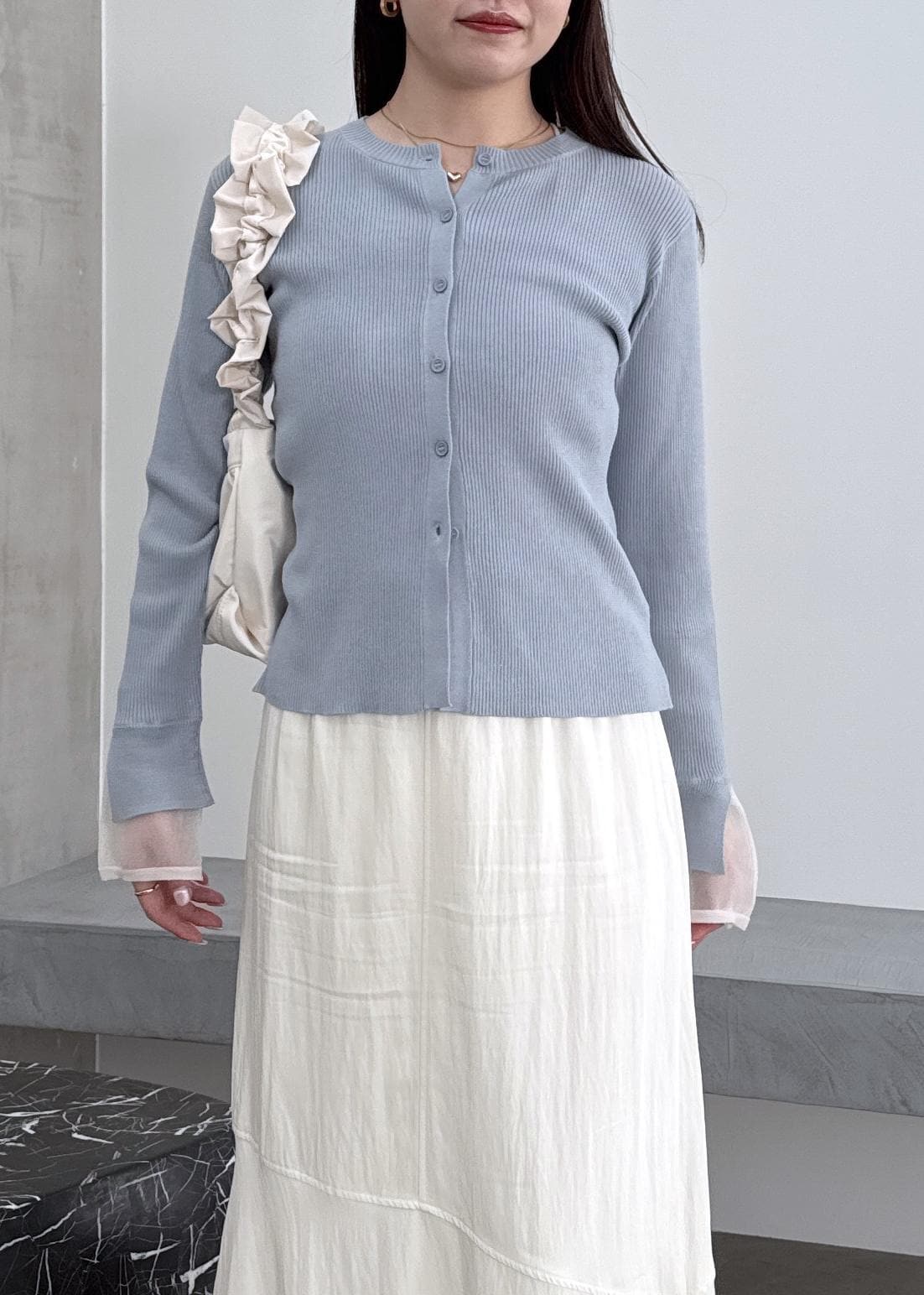 NEW!VIS【WEB限定】袖フレア配色レイヤードカーディガンサックス / F¥6,589レビュー袖のチュールがポイント!春におすすめカーディガン◎