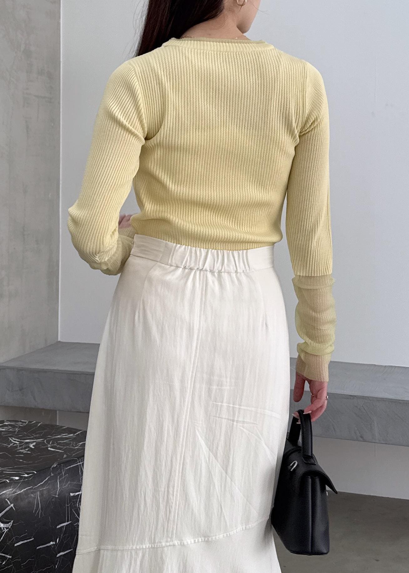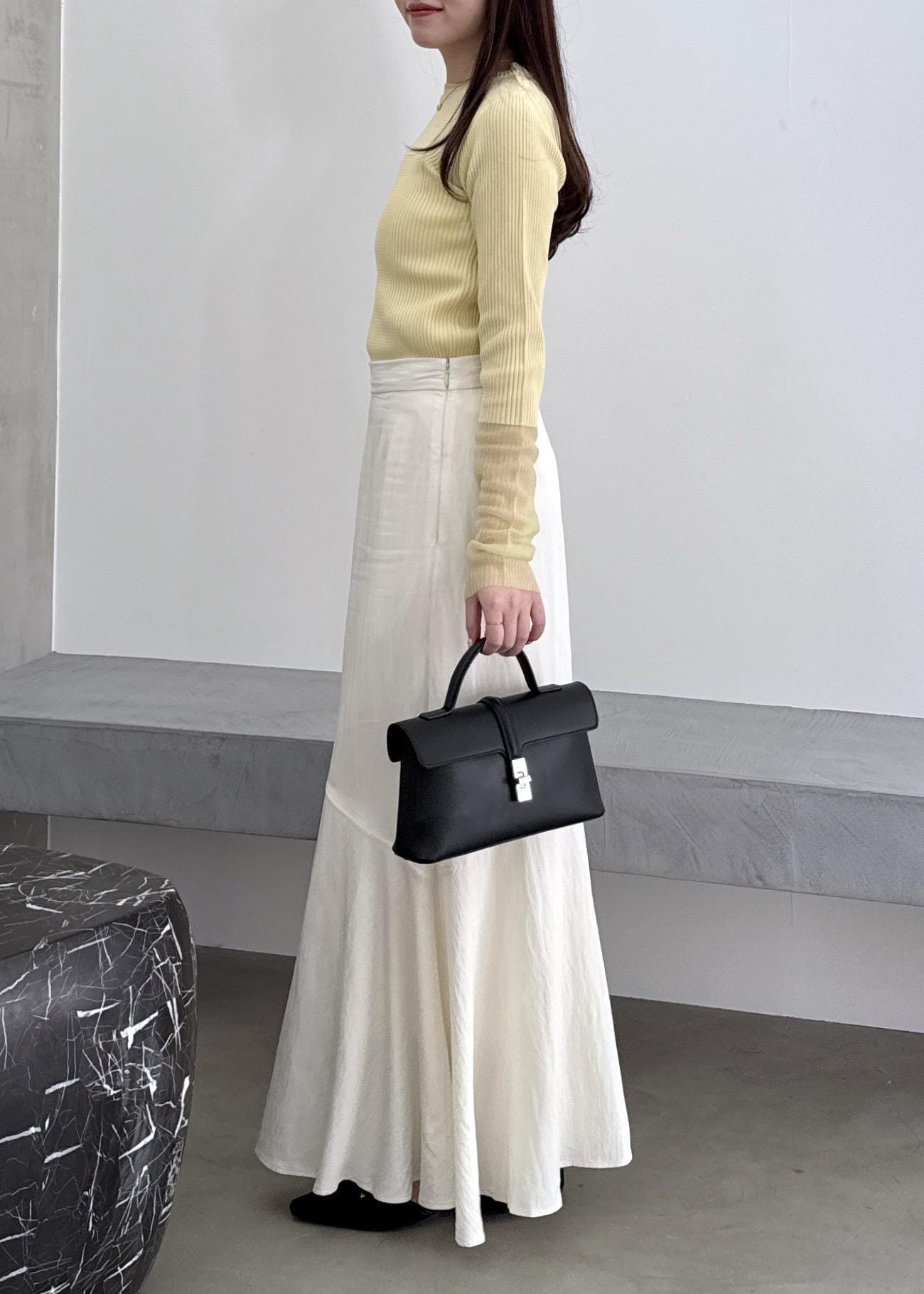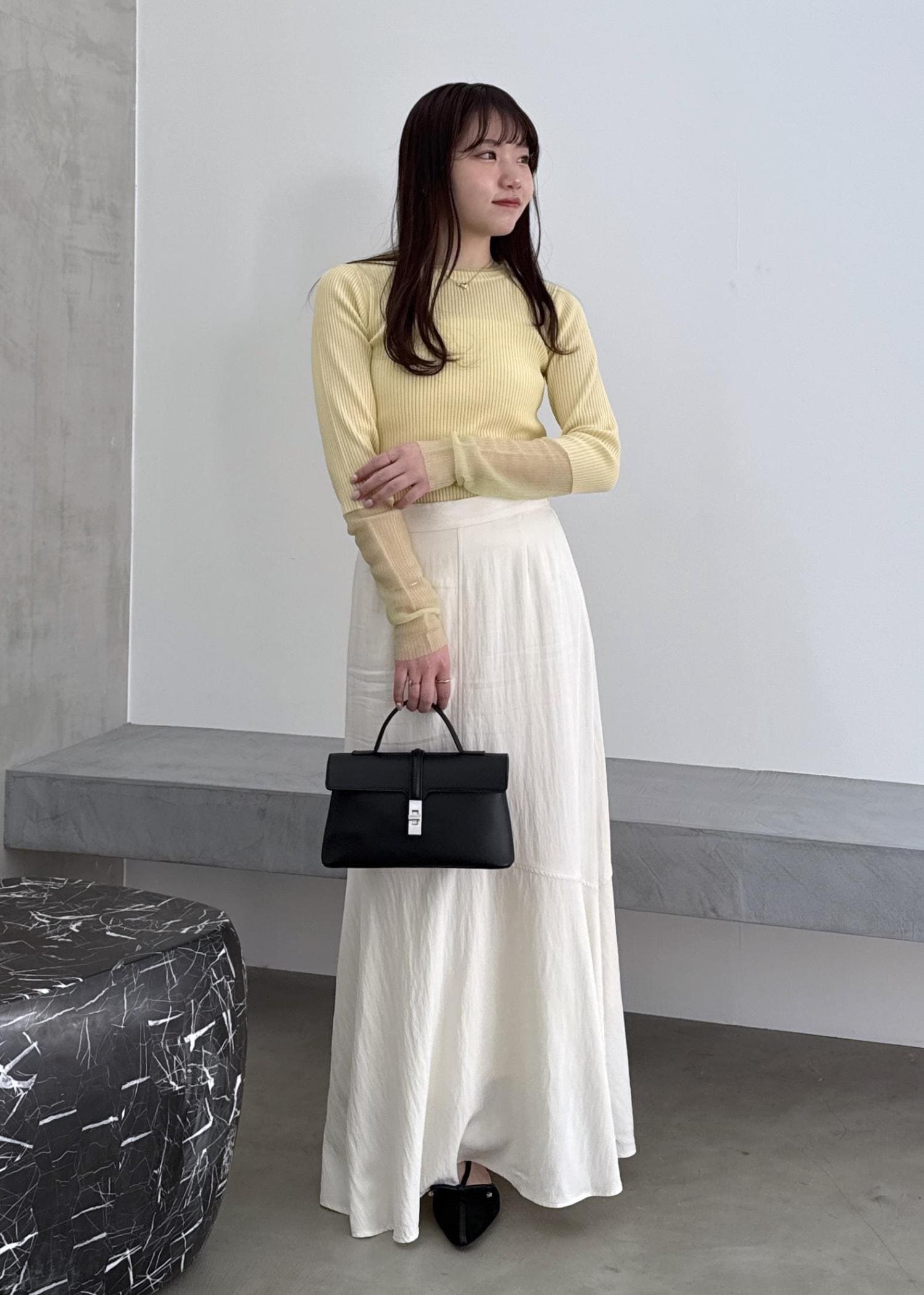 イエローカラーがポイントのニットトップスに、スカートで華やかコーデに◎ 小物は、大人っぽくブラックでまとめてみました!
