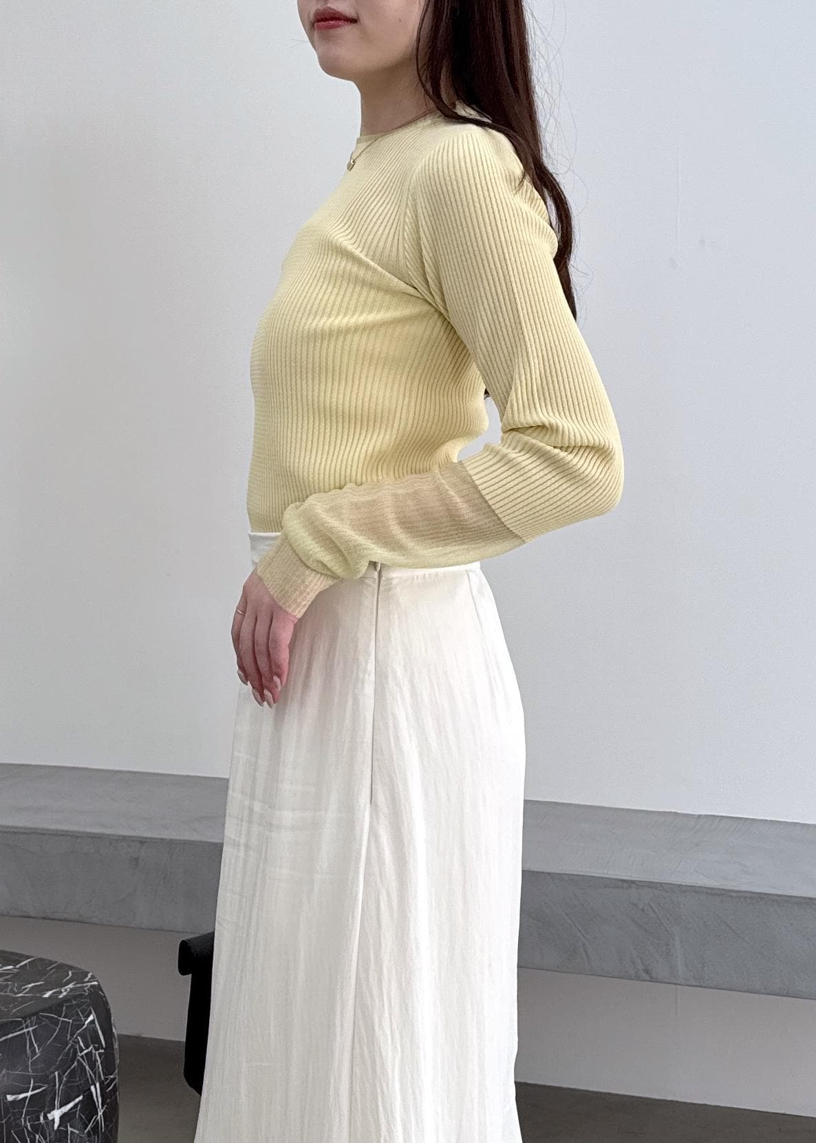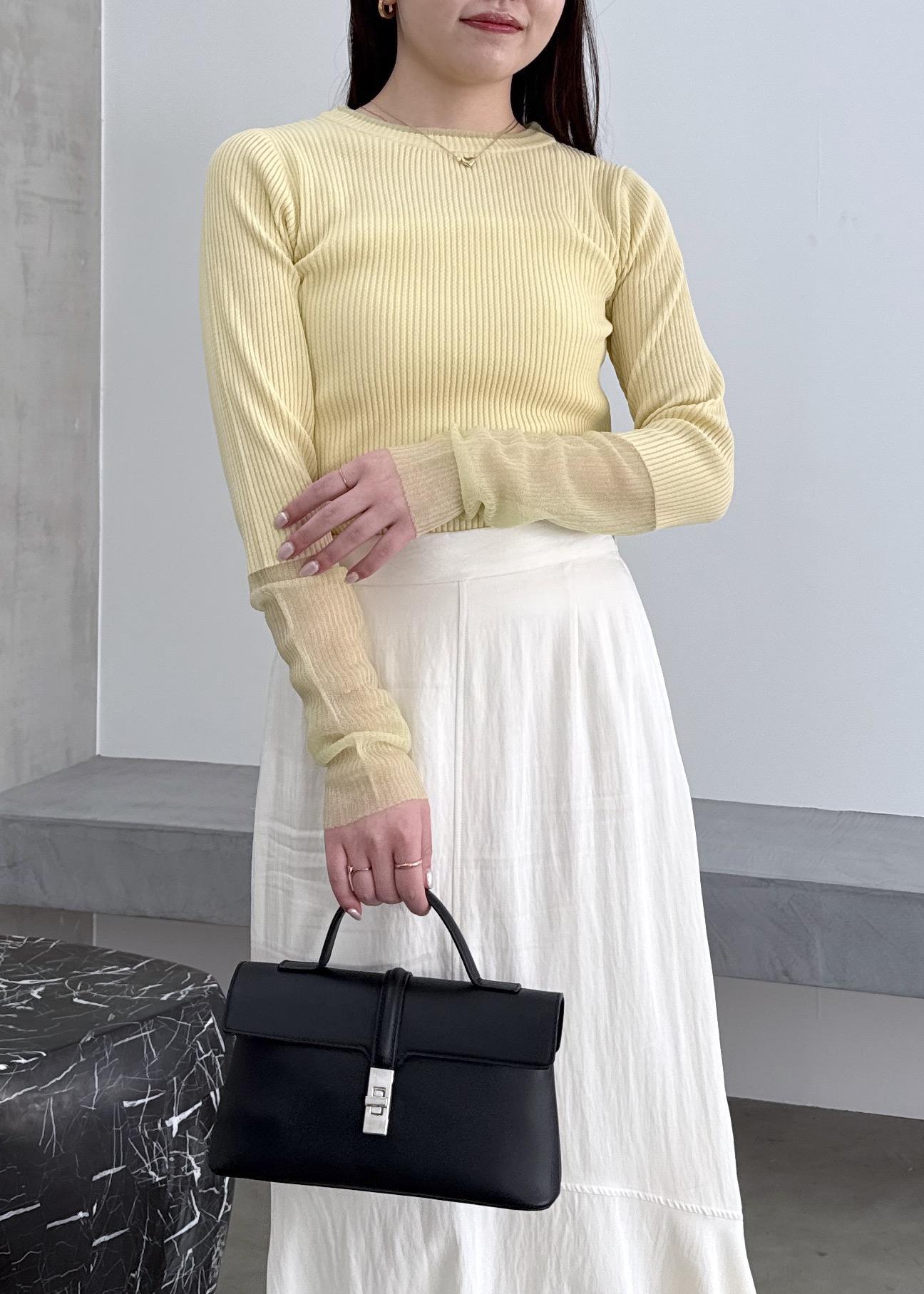 NEW! 予約VIS【WEB限定】袖シアー切り替えリブニットプルオーバーイエロー / F¥5,489レビュー袖のシアー部分は、肘下辺りから切り替えになっていて、サイズ感としては、ややコンパクトサイズです!