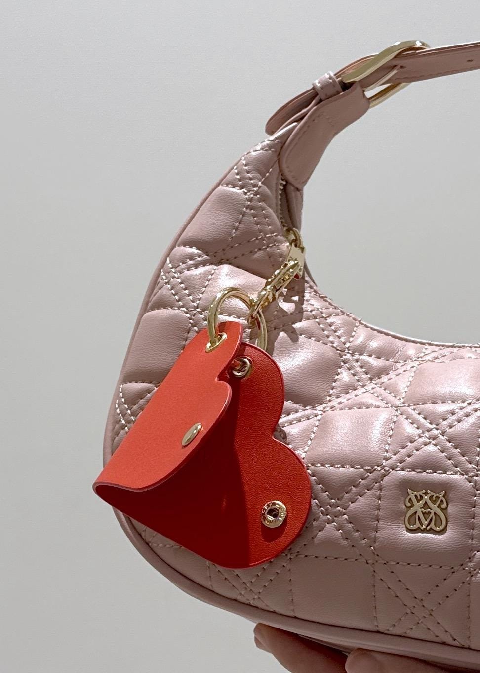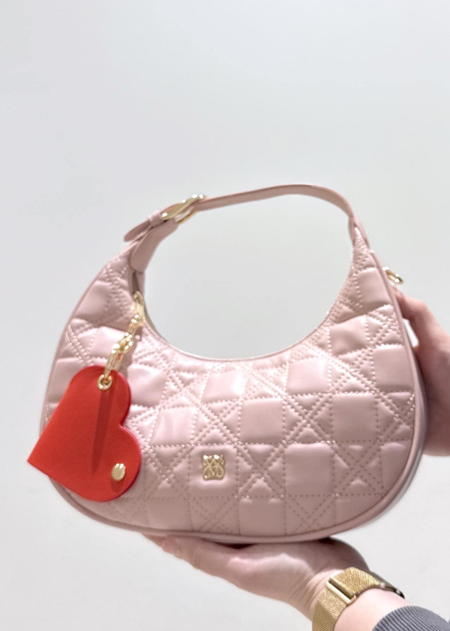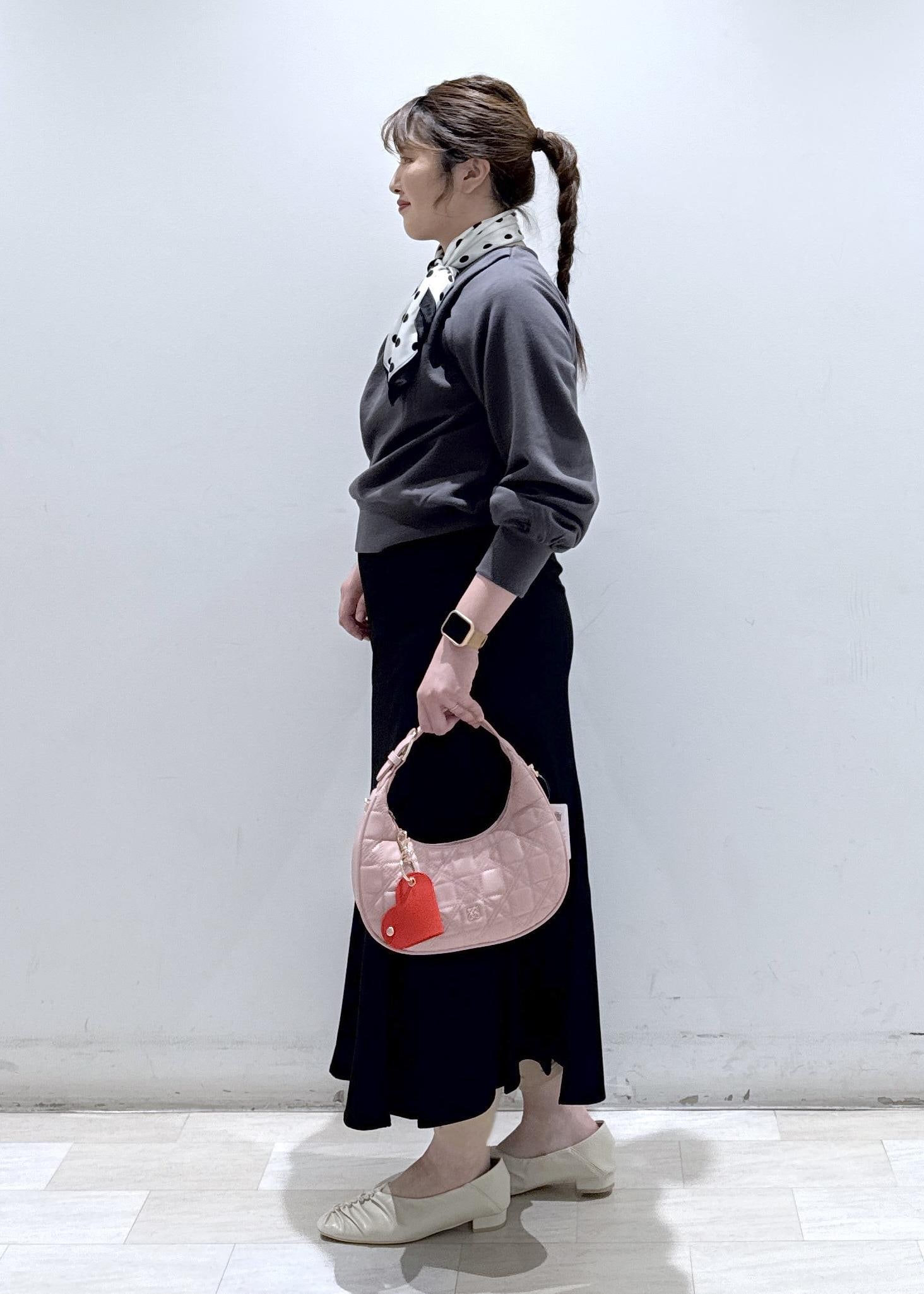 VISハートチャーム付き2WAYキルトバッグピンク系 / F¥6,919レビューキルティング柄の三日月型のバッグです。見た目は小さめではありますが、350mlのペットボトルや折り畳み財布、ハンドタオルやAirPodsなどが入ります。ハートのモチーフのチャームもワンポイントになってて可愛いです!