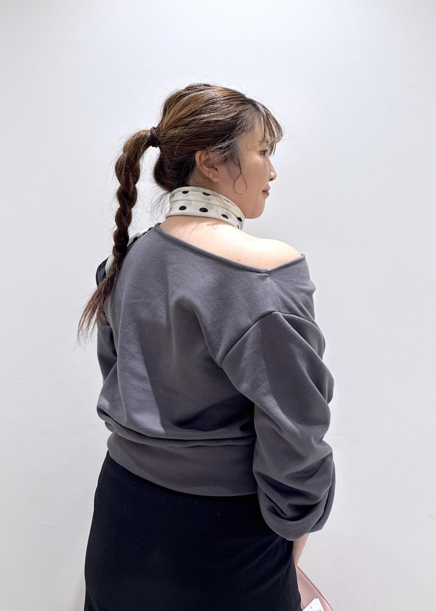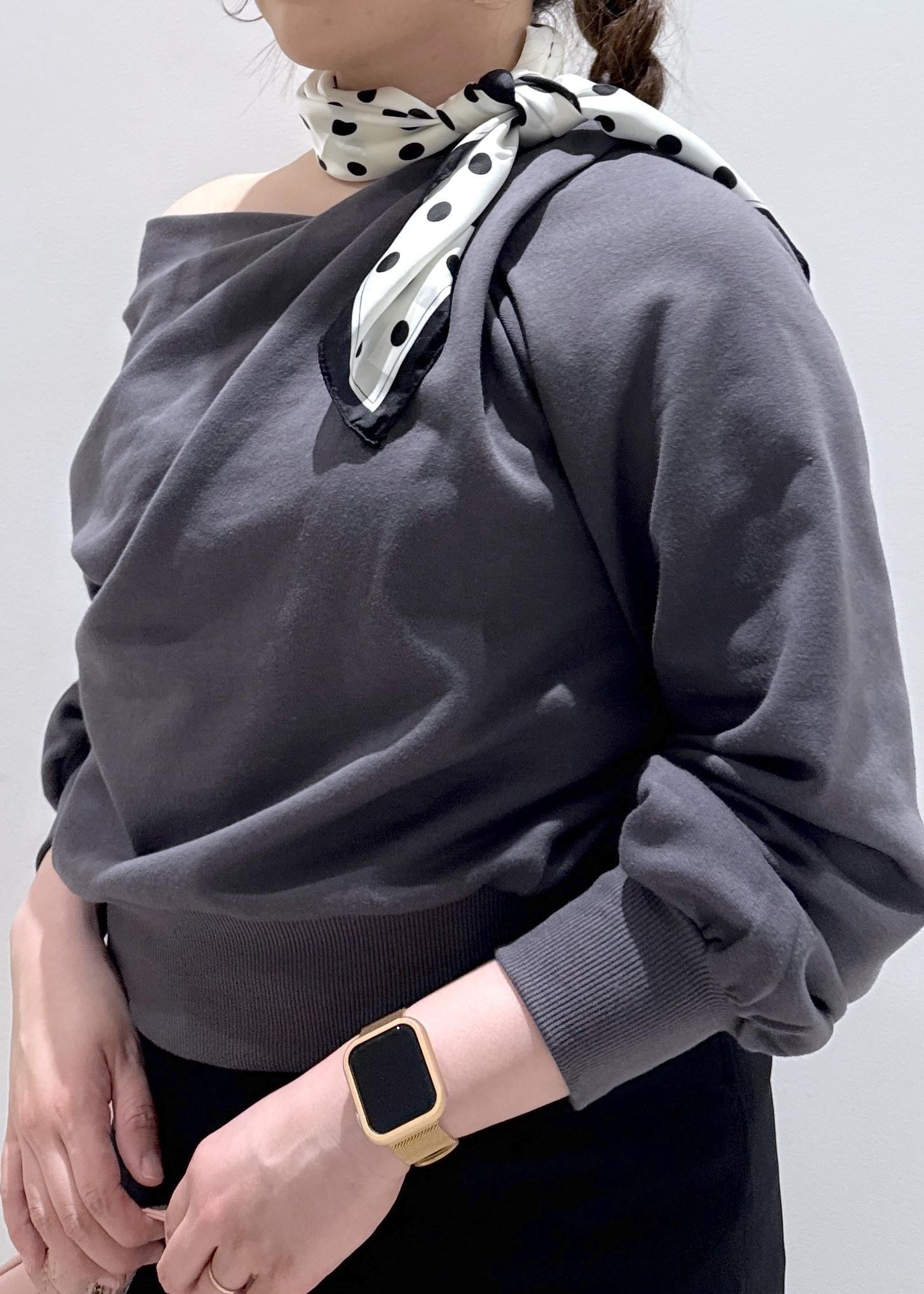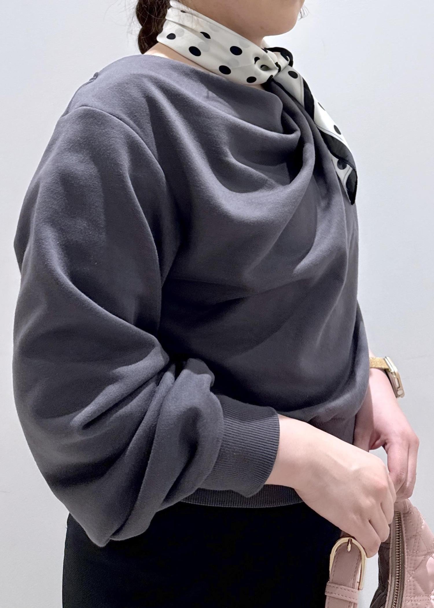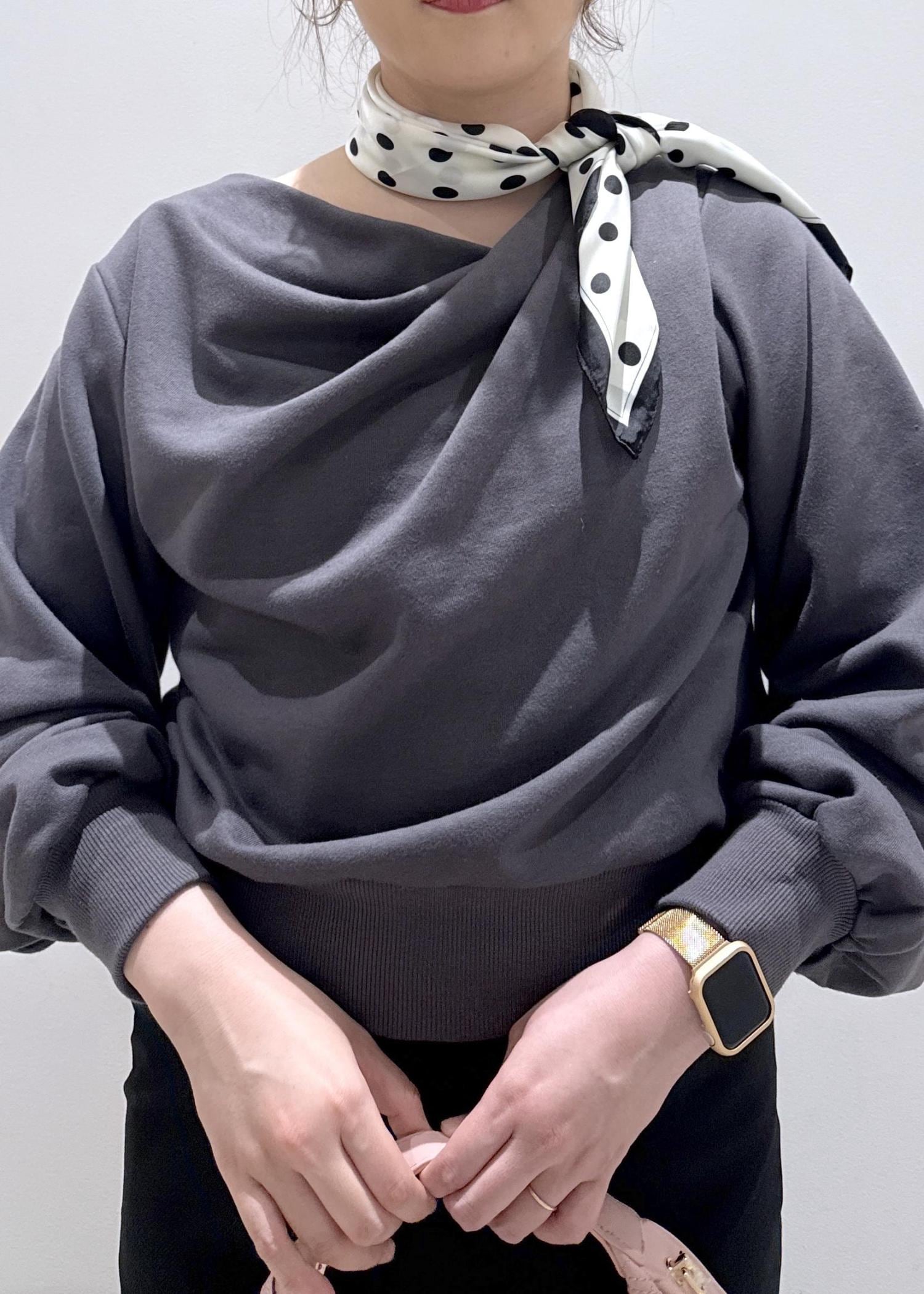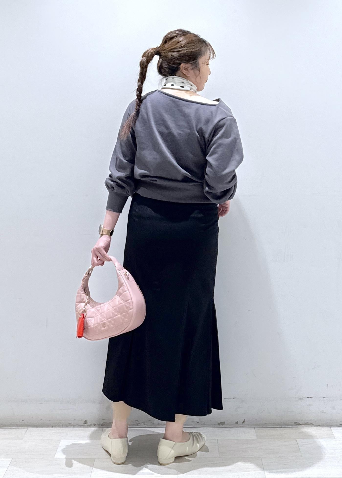 今回は新作で入荷しました、韓国でも流行っているドレープデザインのスウェットを綺麗めにして、スカートと合わせました。ゆったりとして体型カバーも出来るトップスなのでオススメです。