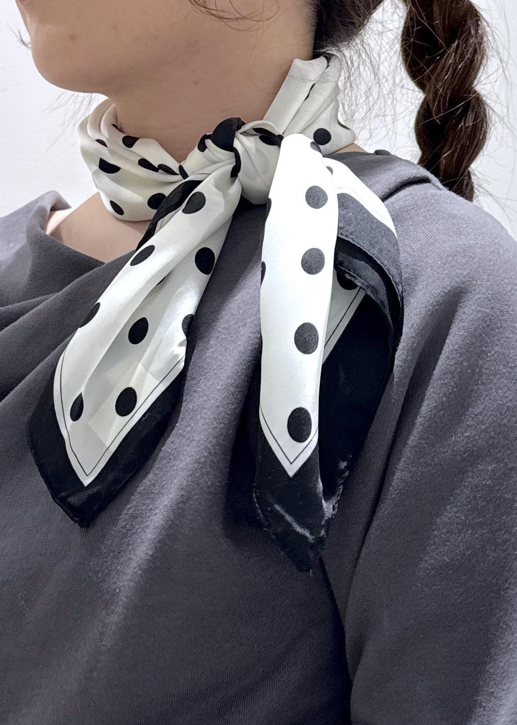 VISドット柄スカーフ 70×70cmホワイト系 / F¥2,189レビューサテン素材のサラッとしたドット柄のスカーフ。柔らかいので首に巻いたり、腰に巻いたりアレンジ自由⭐︎シンプルなお洋服こそ、柄物を入れるだけで雰囲気が変わるのでオススメです!