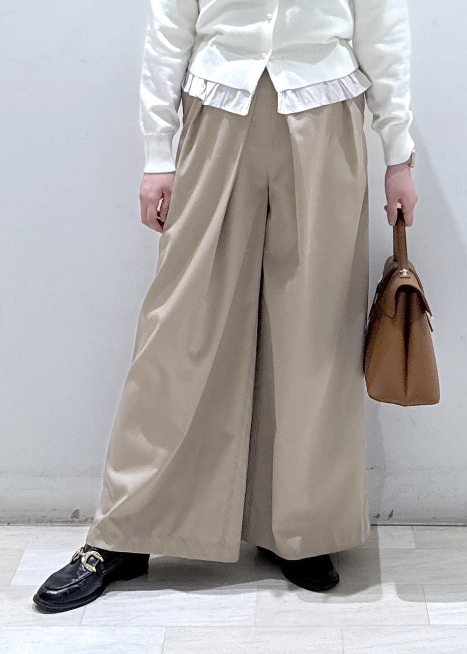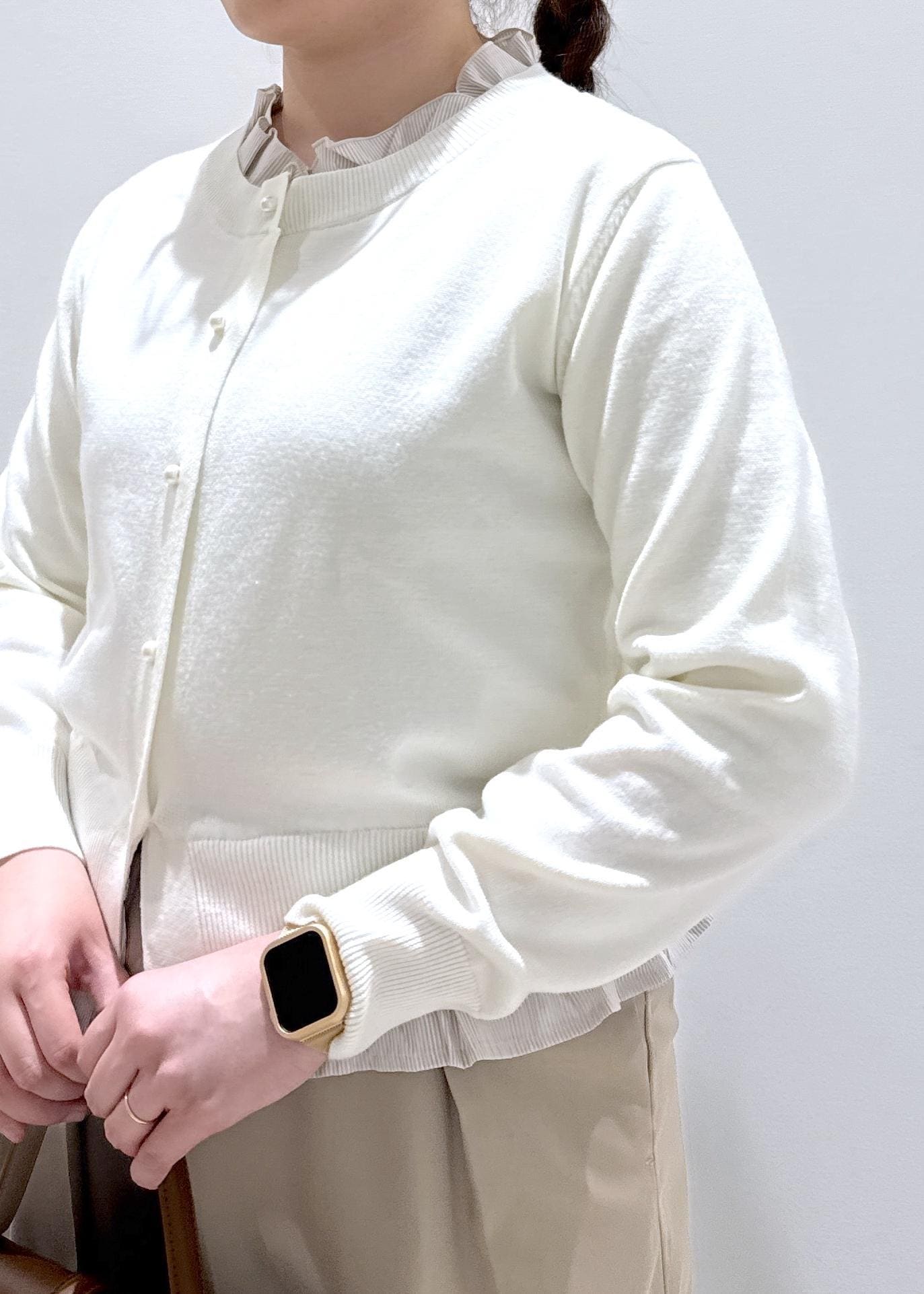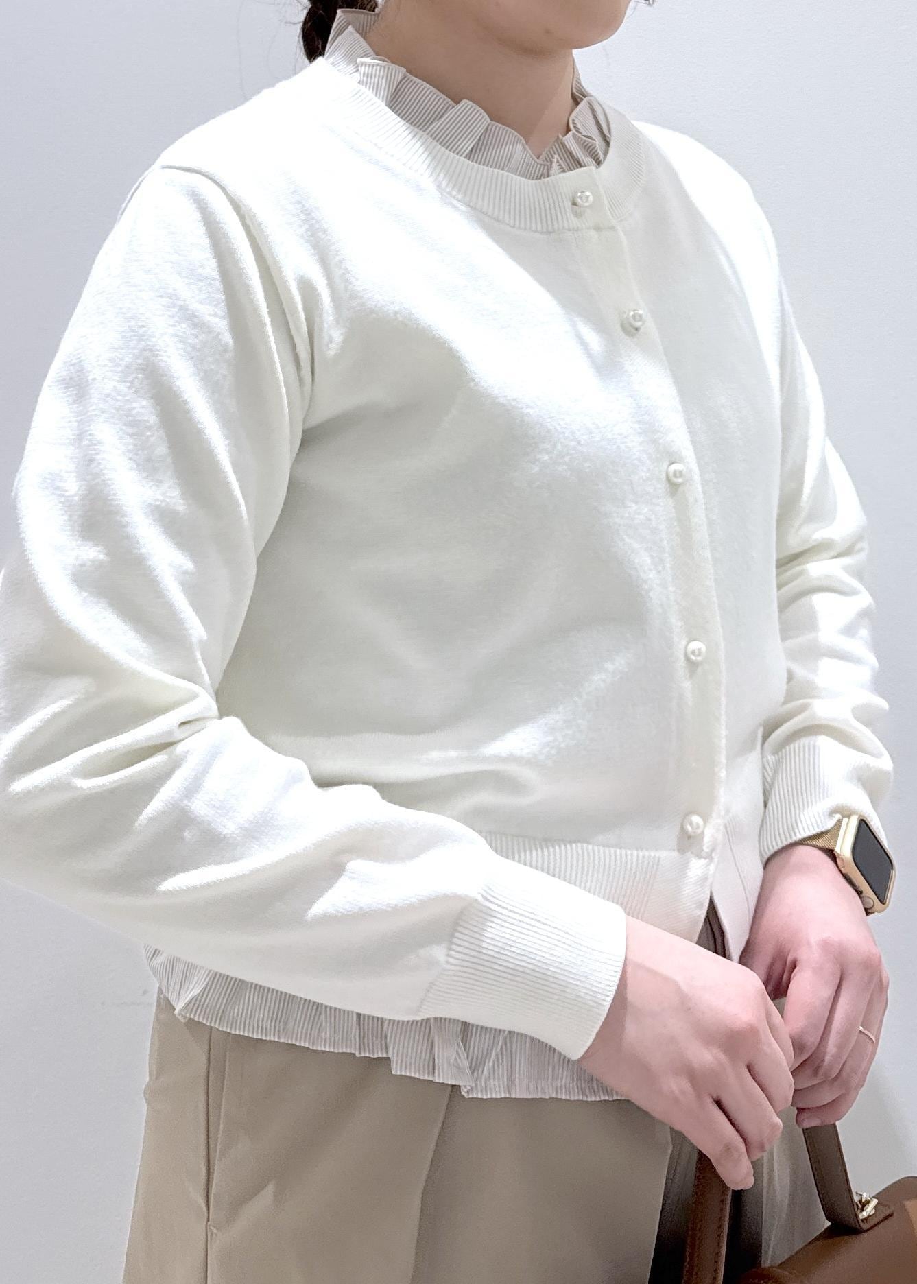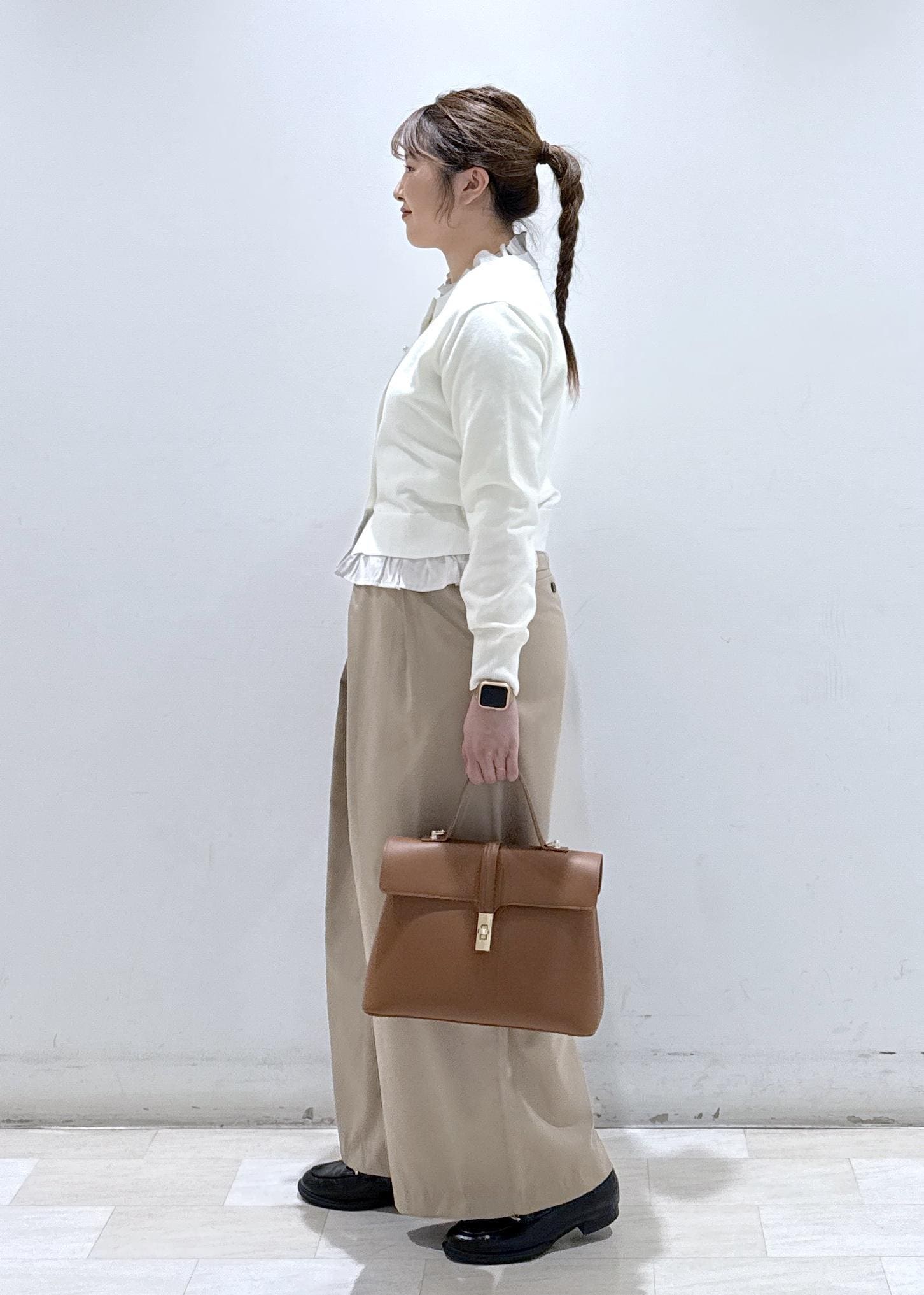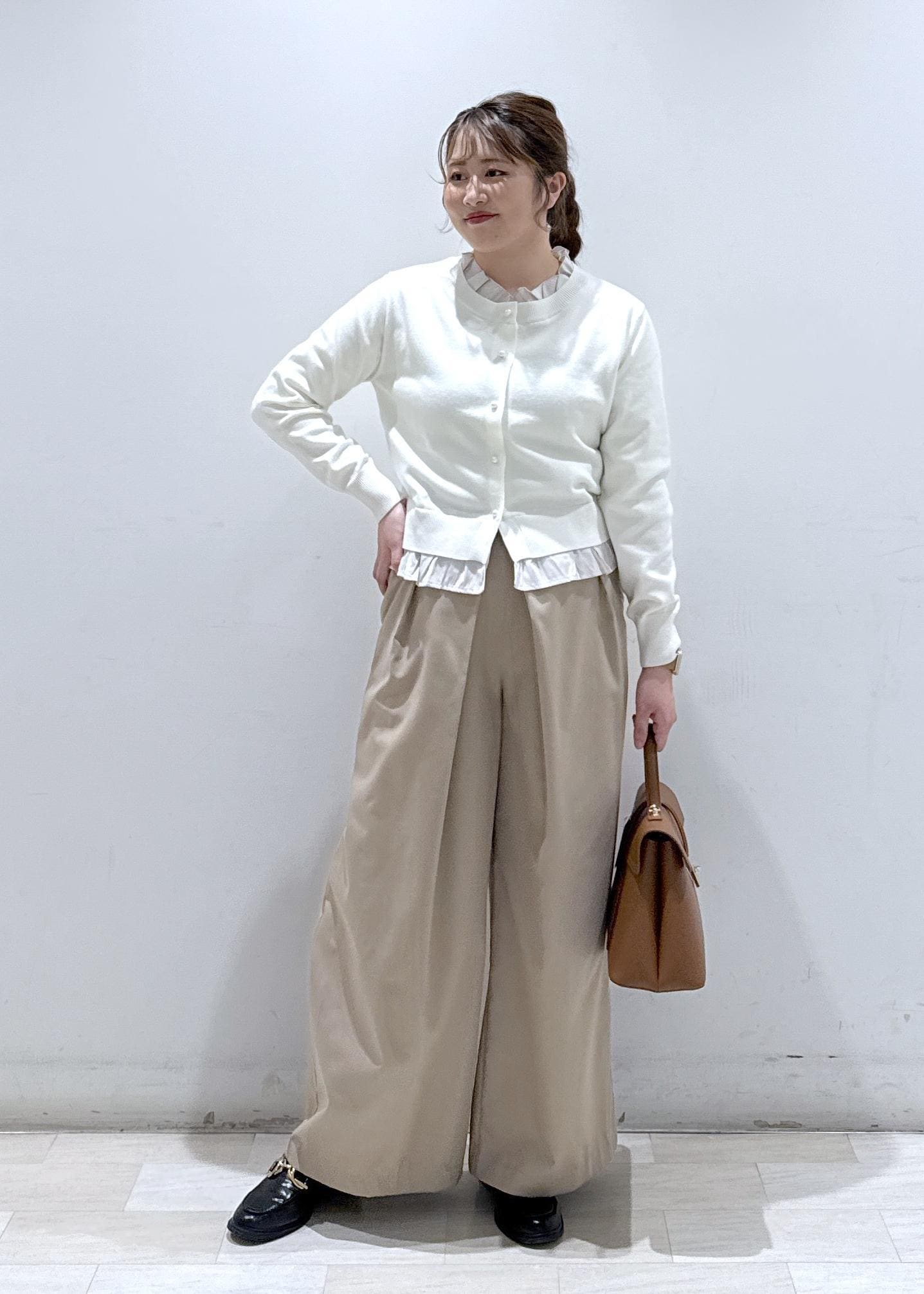 今回は新作で入荷しました、襟元のフリルが可愛らしいシャツとカーディガンがくっついてるドッキングカーディガンに、太めのワイドパンツを合わせて綺麗めカジュアルなコーディネートにしてみました。一枚で楽に、そしてお洒落に見えるので朝の時短にもなるのでオススメです。