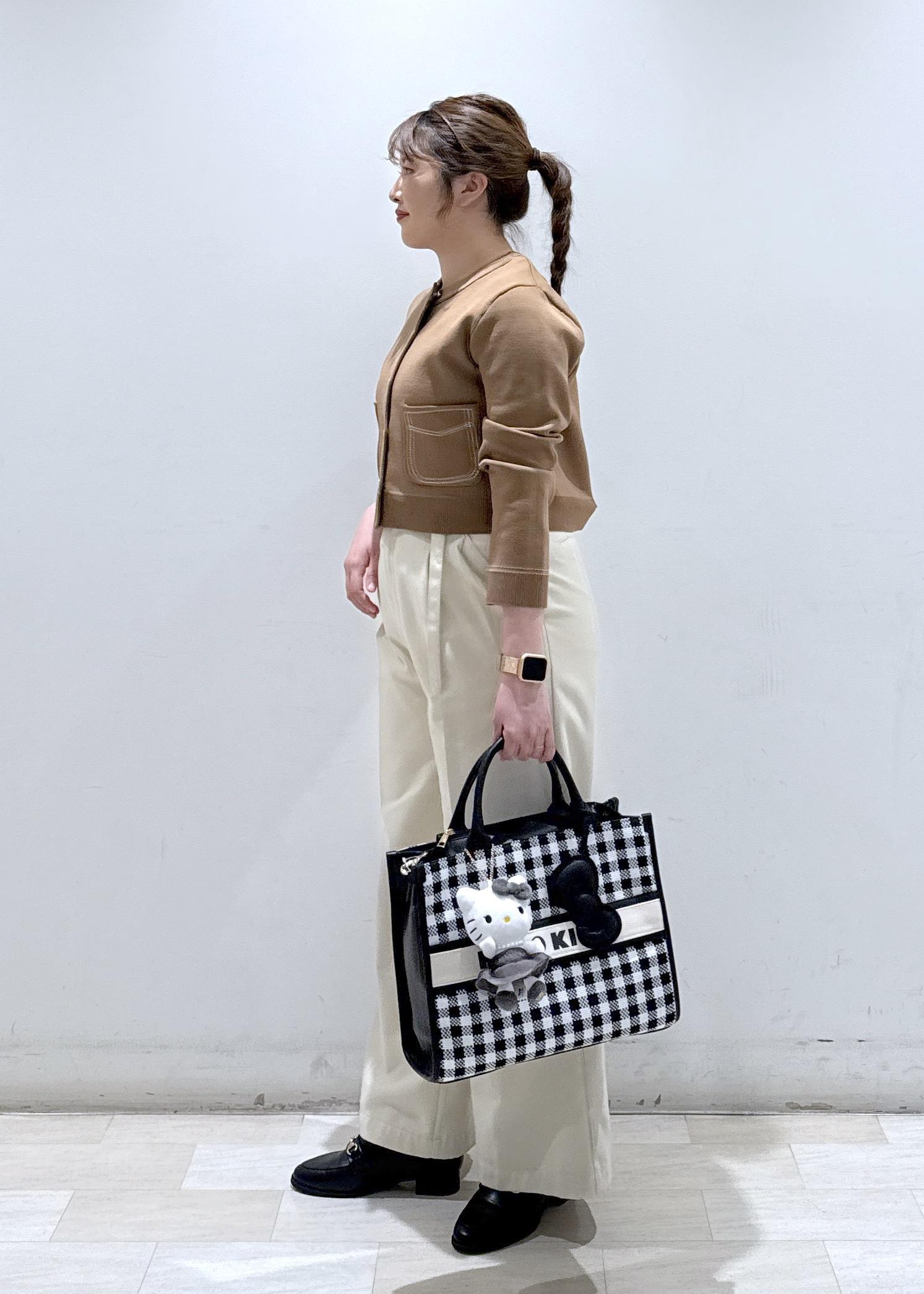 今回は新作で入荷しましたステッチデザインのショート丈カーディガンに、ストレートパンツを合わせて綺麗めなコーディネートにしてみました。VISでしか買えないキティちゃんのバッグと一緒に!コーディネートのアクセントとなるので、ぜひ使ってみてください♪