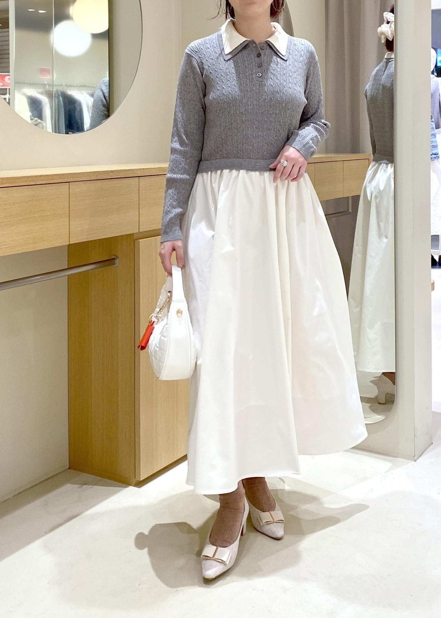 VISダブルカラーポロニットドッキングワンピースライトグレー / F¥8,899レビューケーブル編みニットとシャカシャカ素材のスカートとのドッキングワンピースです!