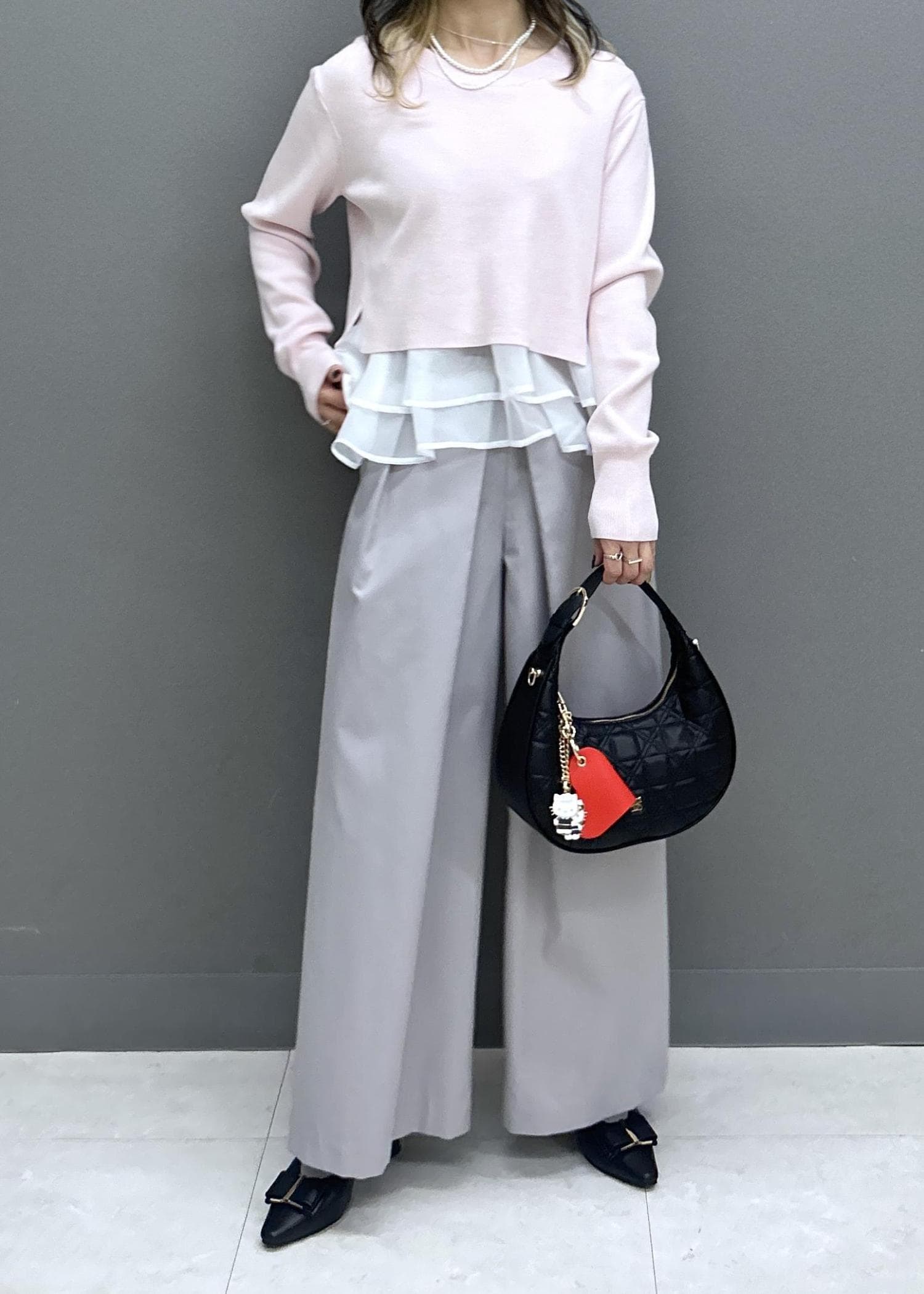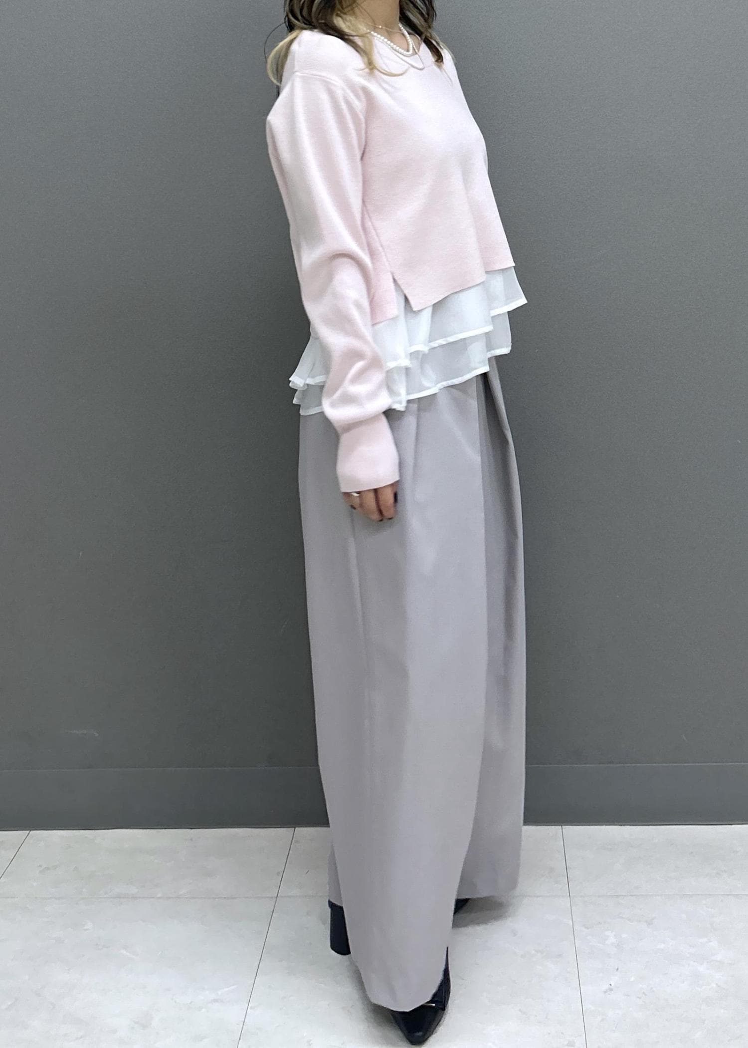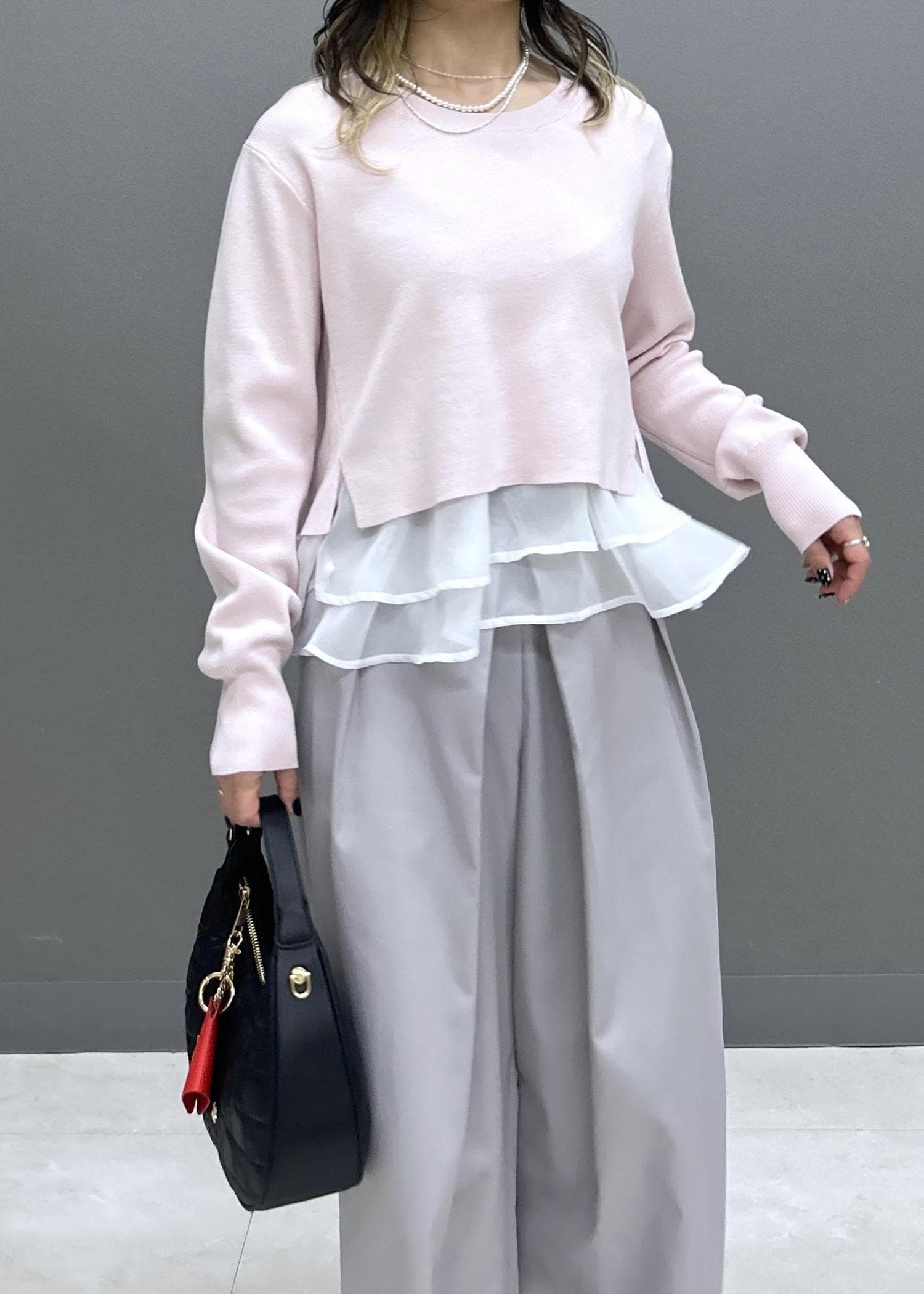 ニット部分は着丈スッキリなので、アウトスタイルでも目線が上がりスラっと見えます◎