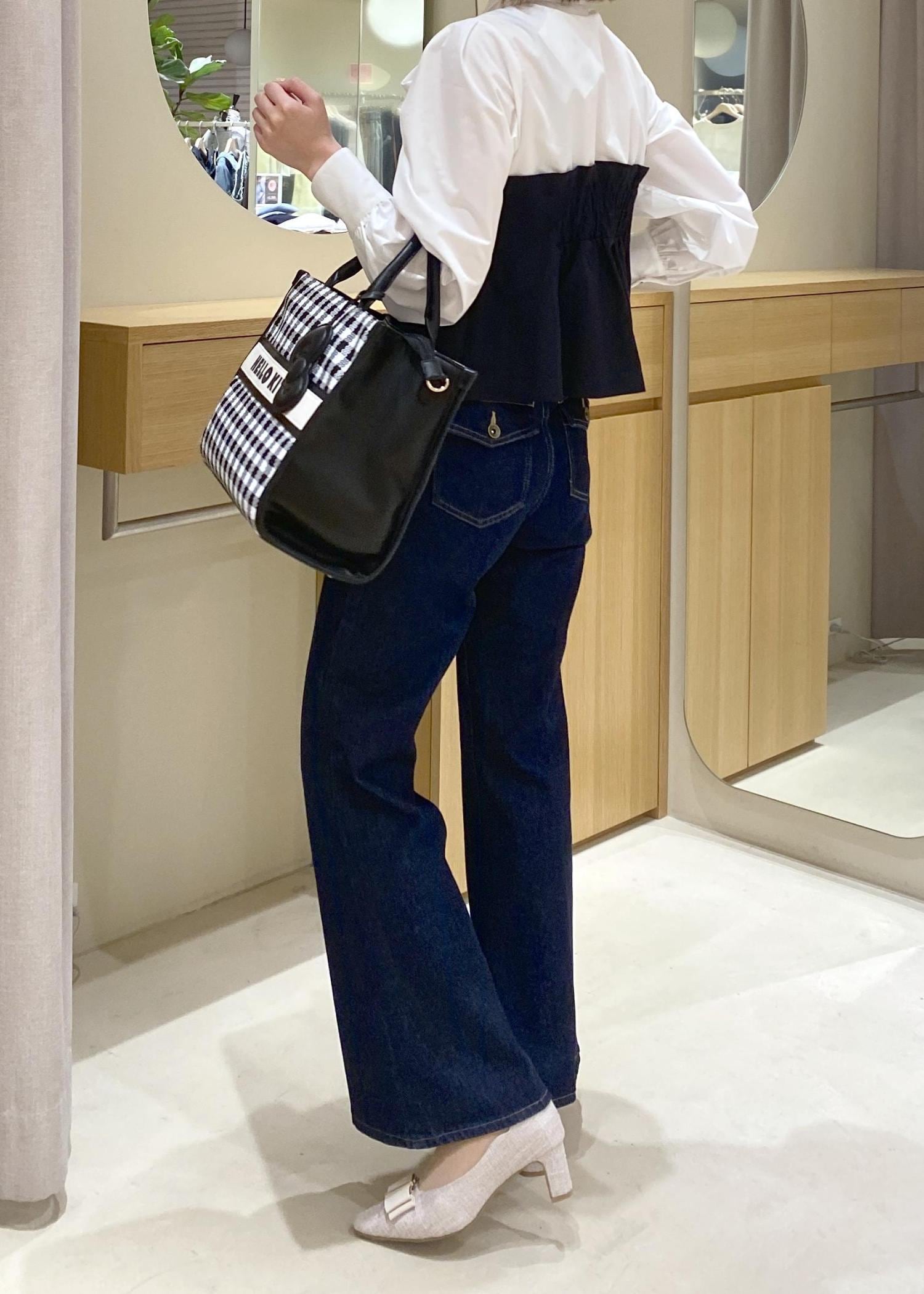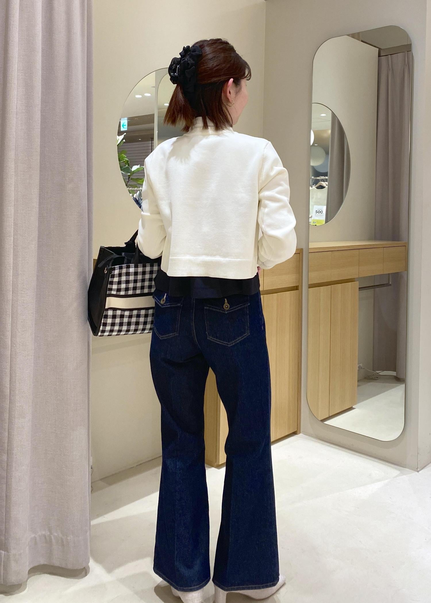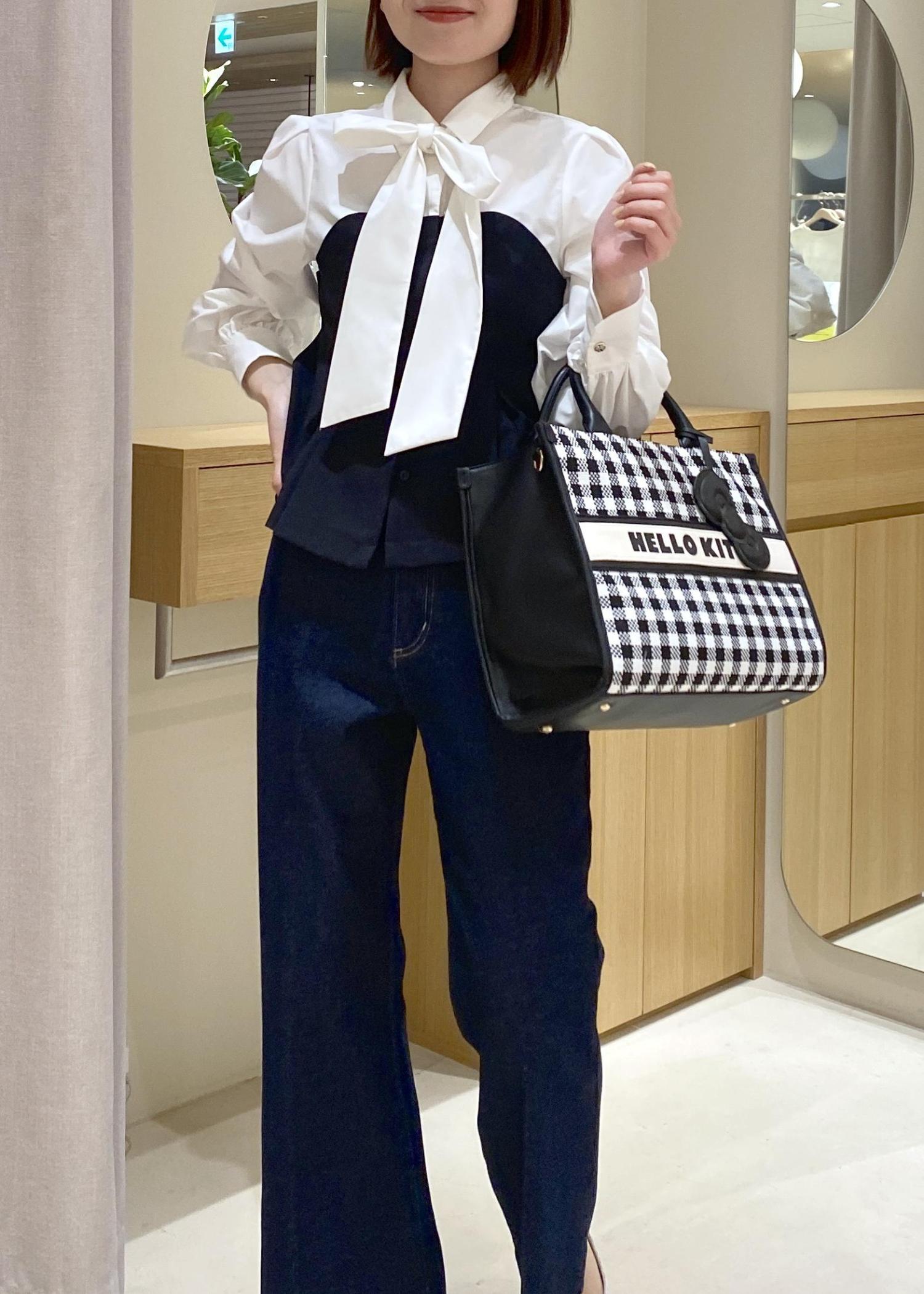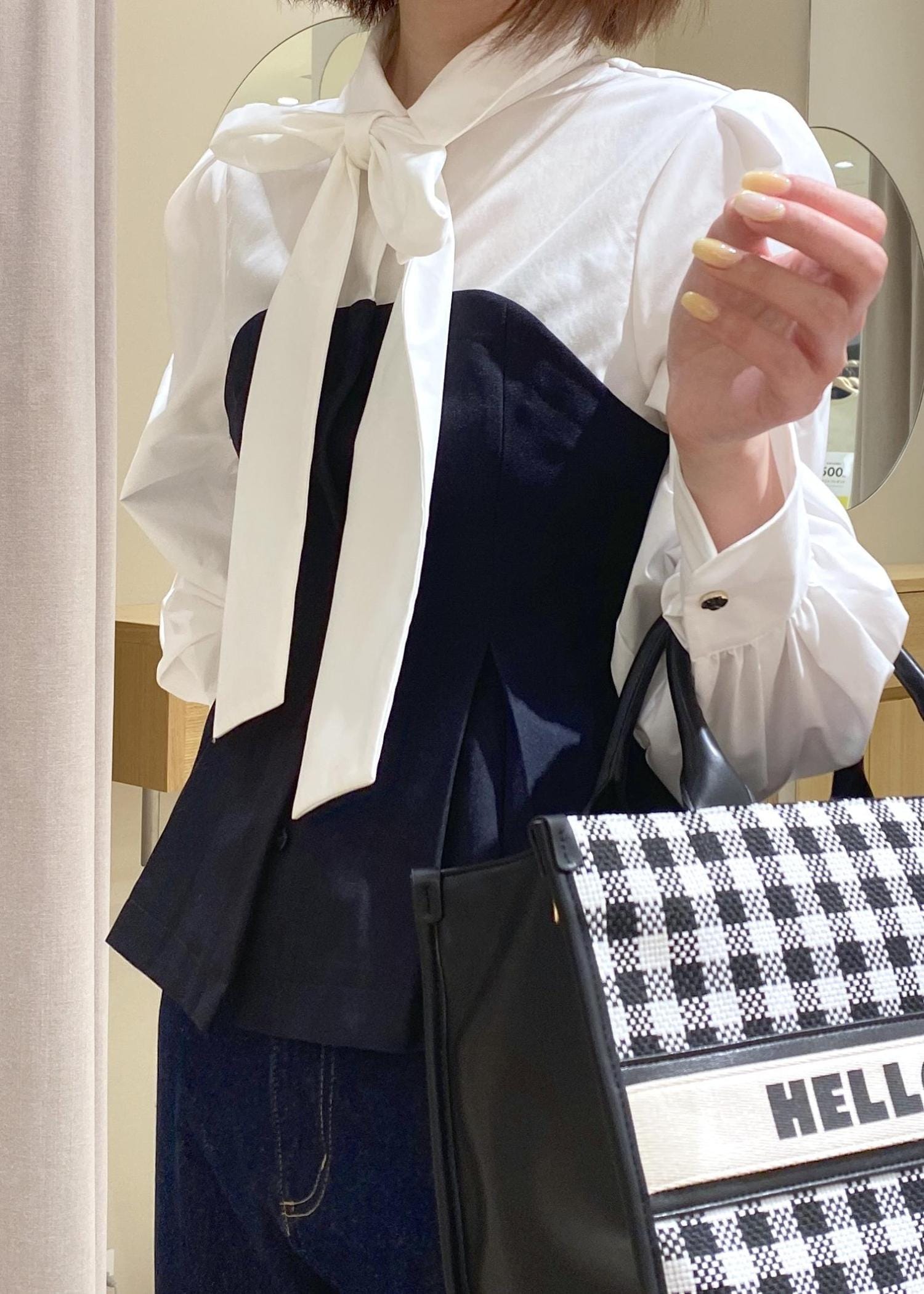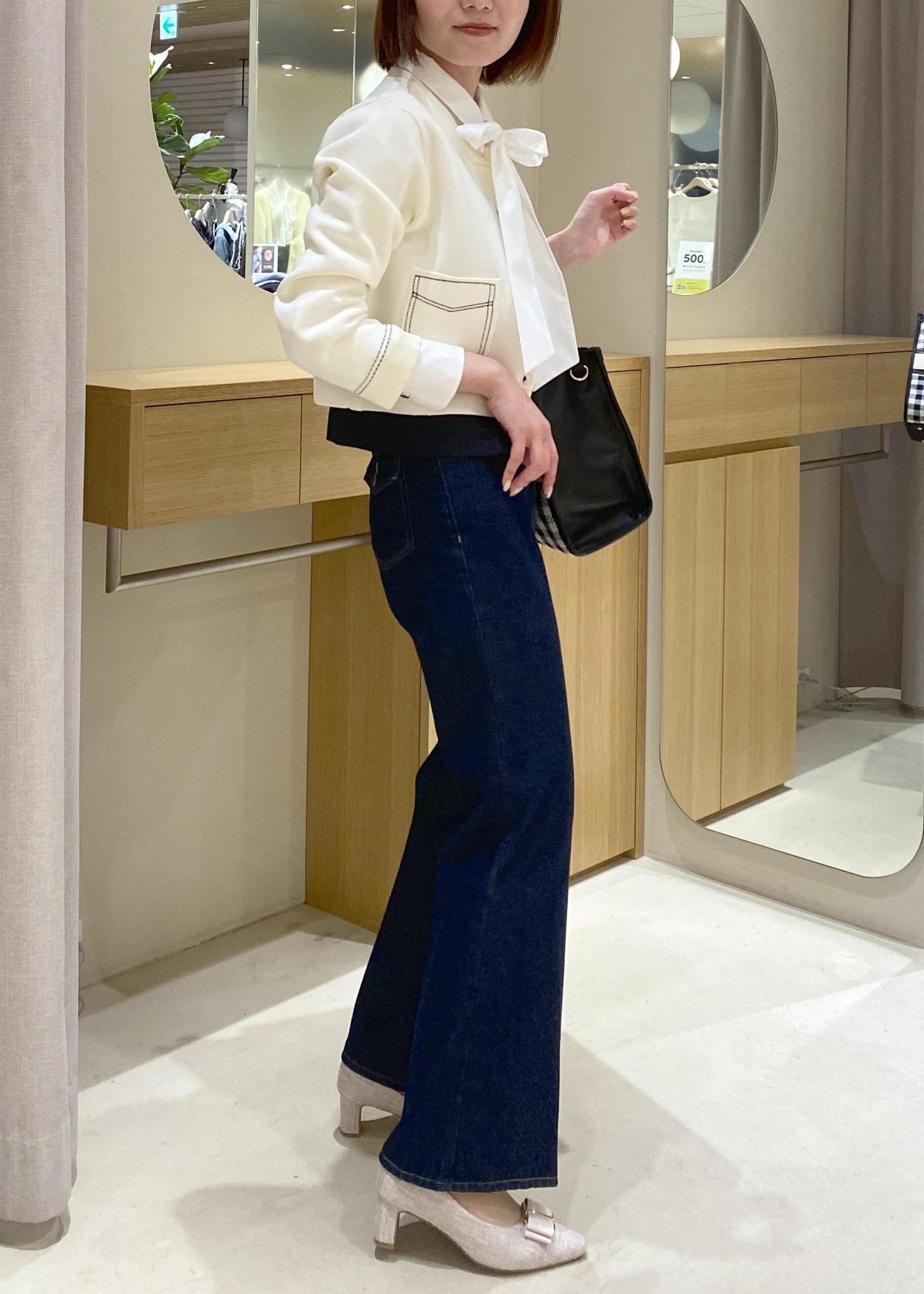 ボウタイ付きブラウスとボタンがアクセントのニットジャケットをデニムで合わせ、カジュアルダウンしたコーデ!