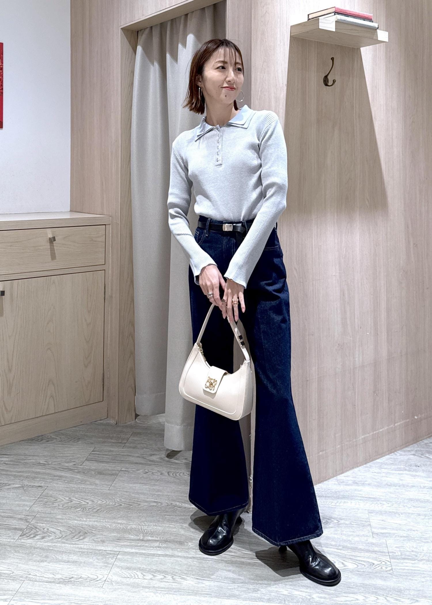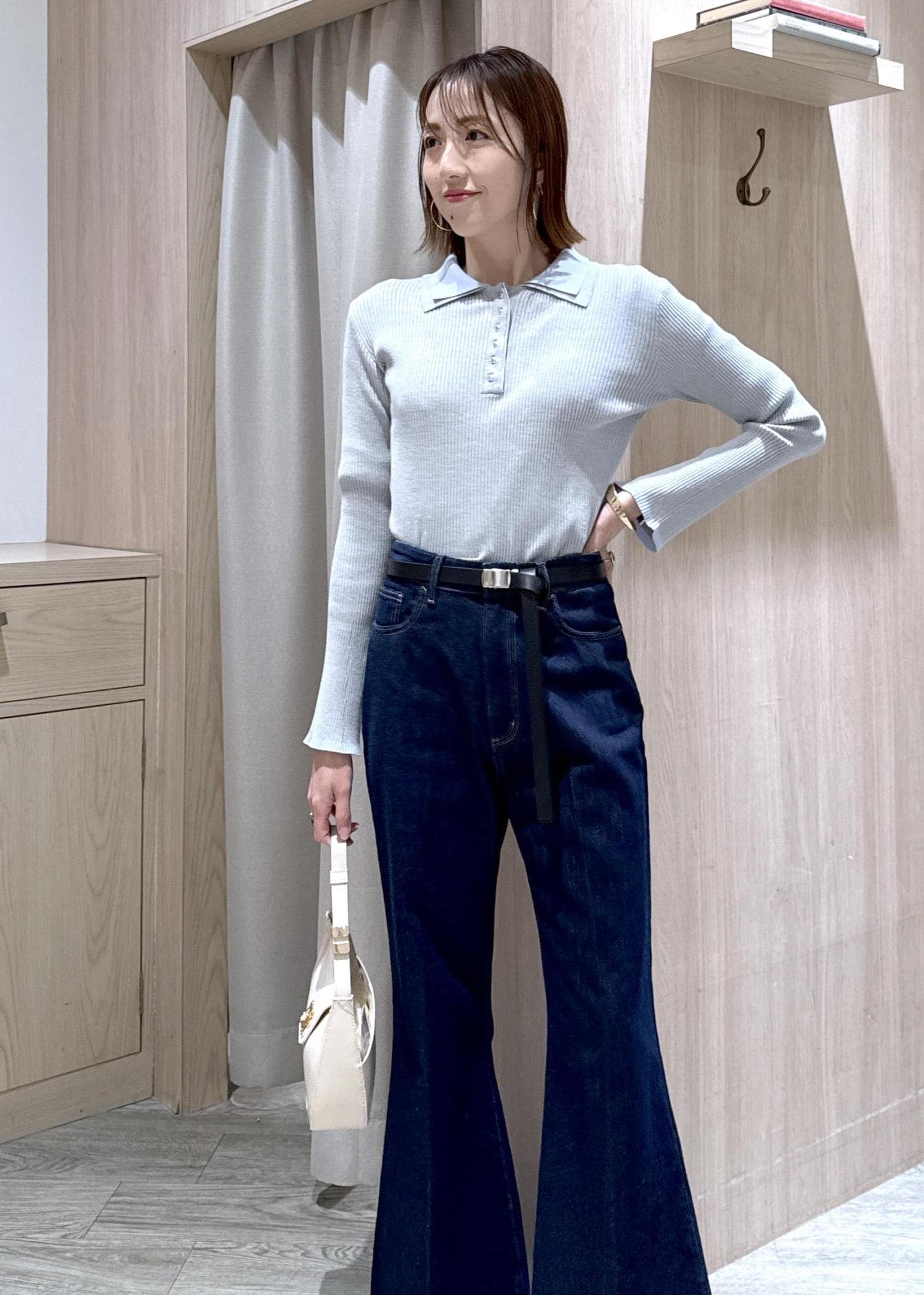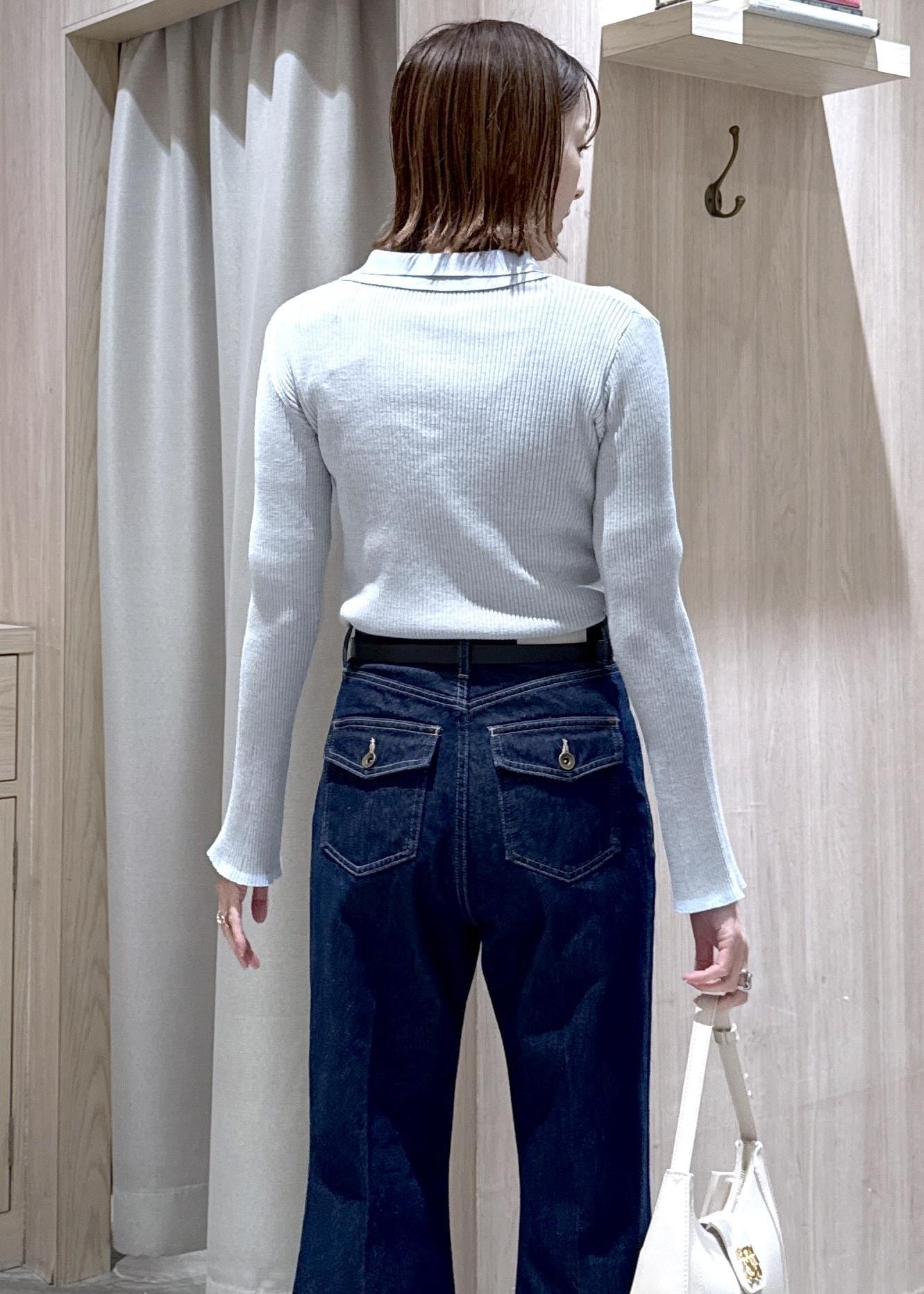 バイカラー襟が可愛いトップスにフレアデニムを合わせた春の大人シンプルコーデ☆