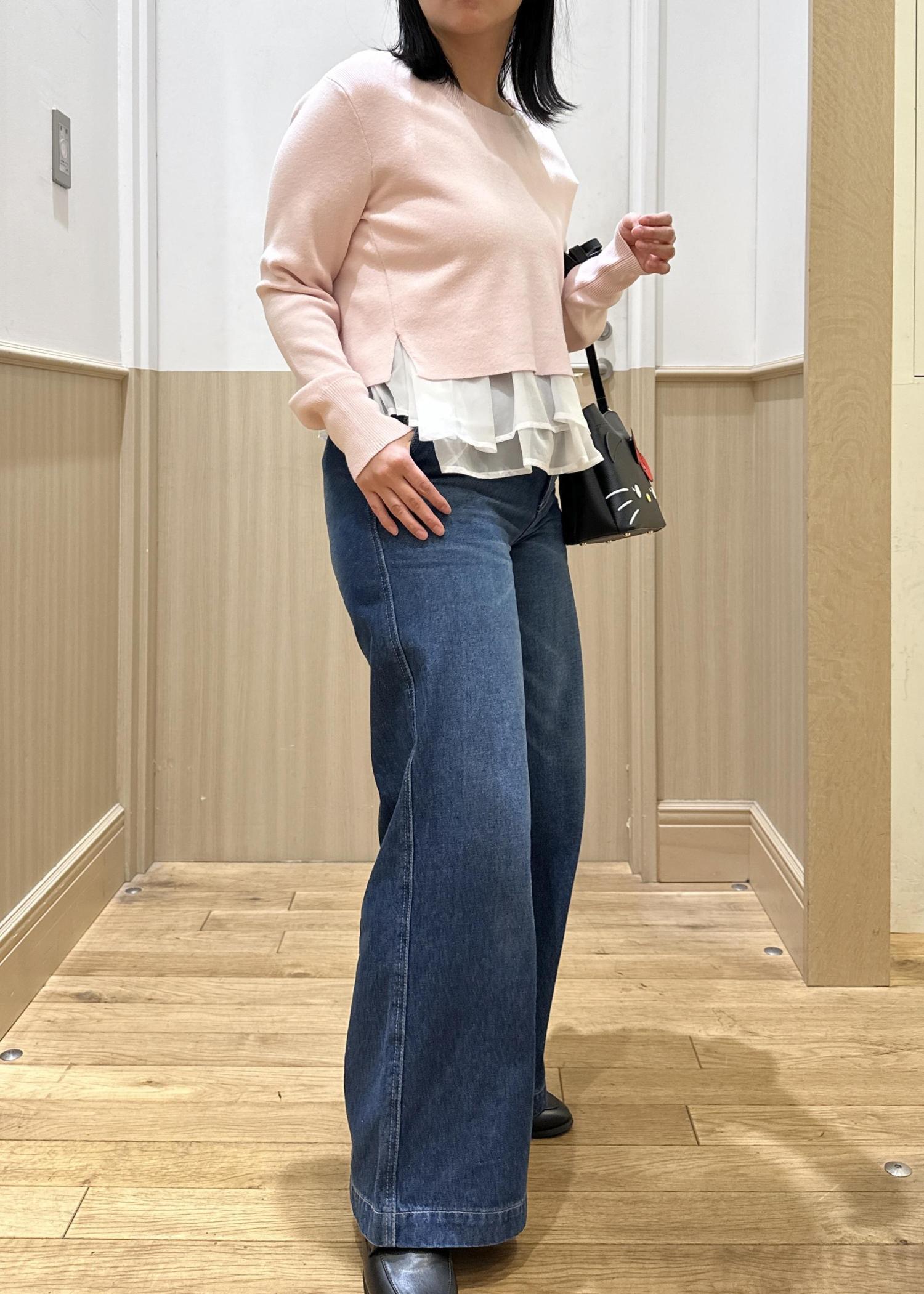 インナーにピンクのニットをチョイスし、差し色にしたのもポイントです。