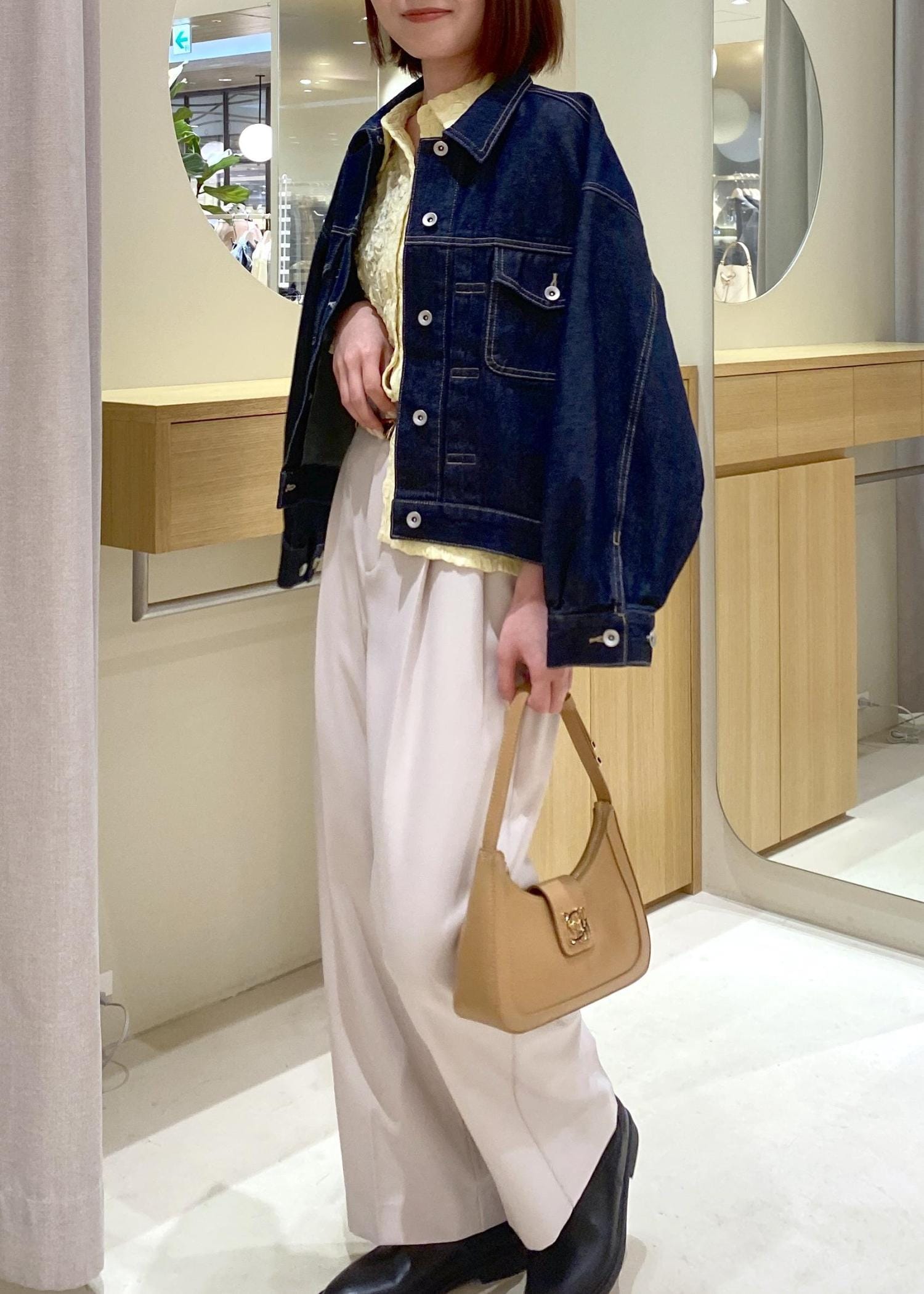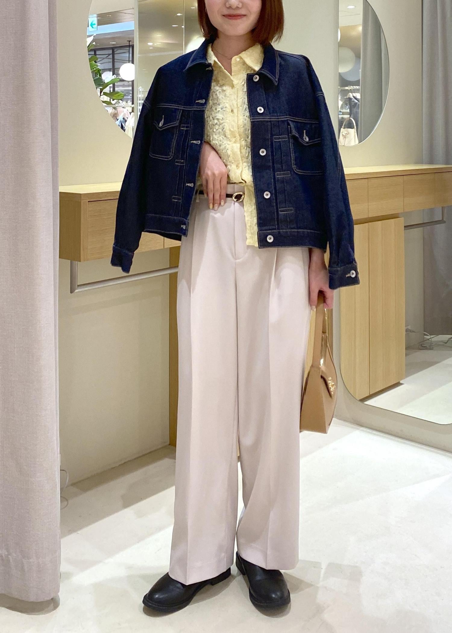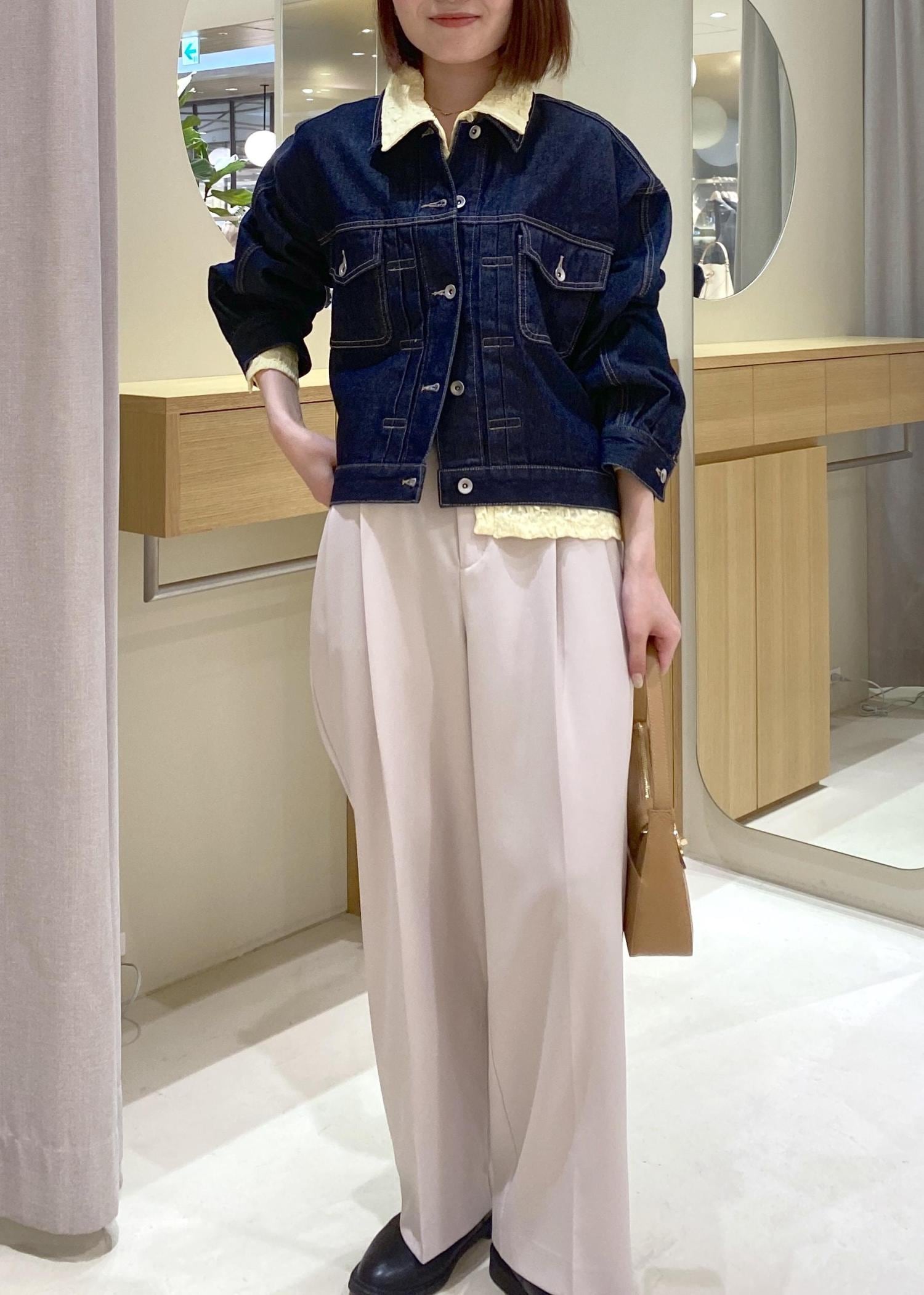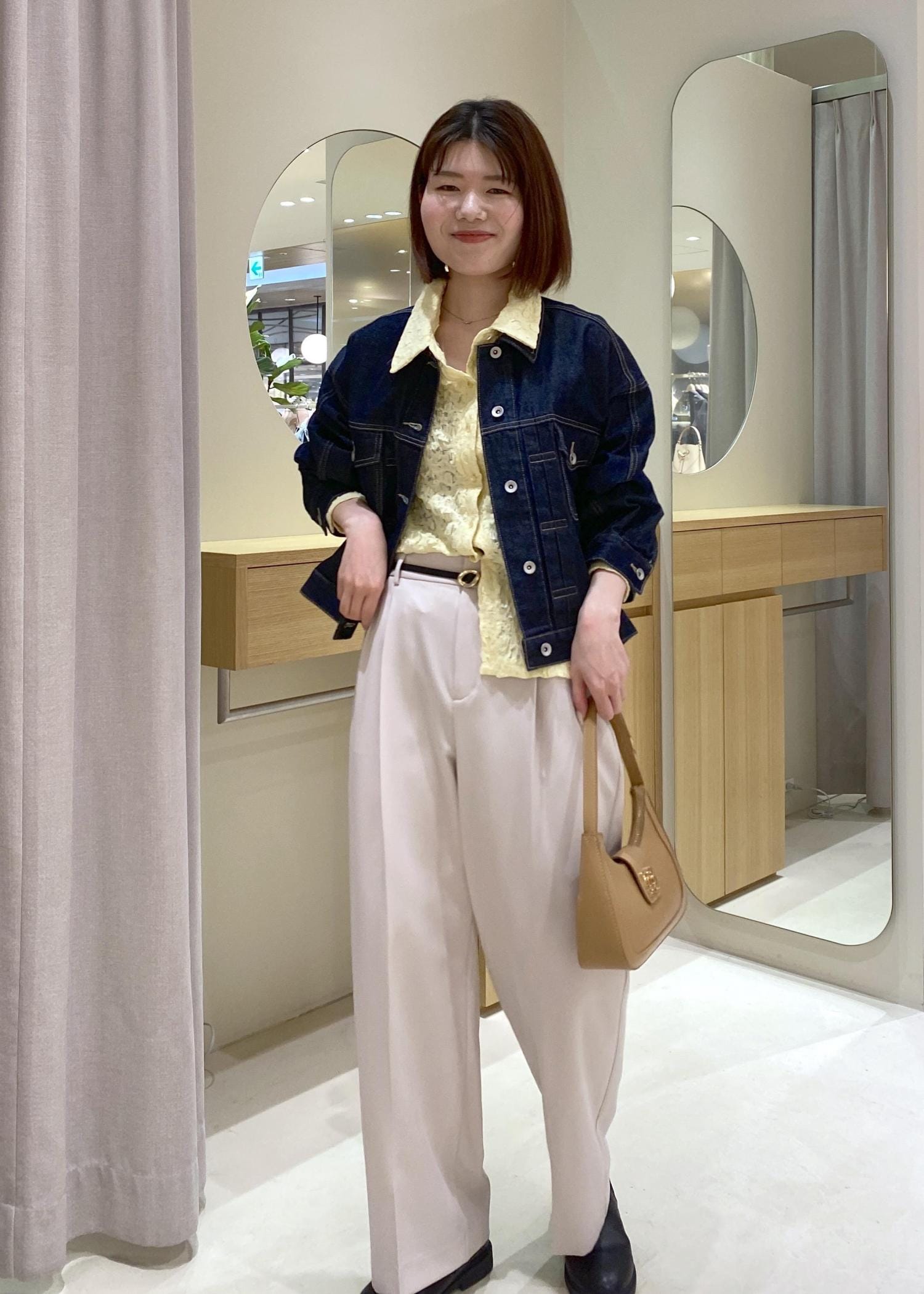 デニムジャケットに爽やかなイエローのレースカーデを取り入れ、春らしさを取り入れたパンツコーデです!