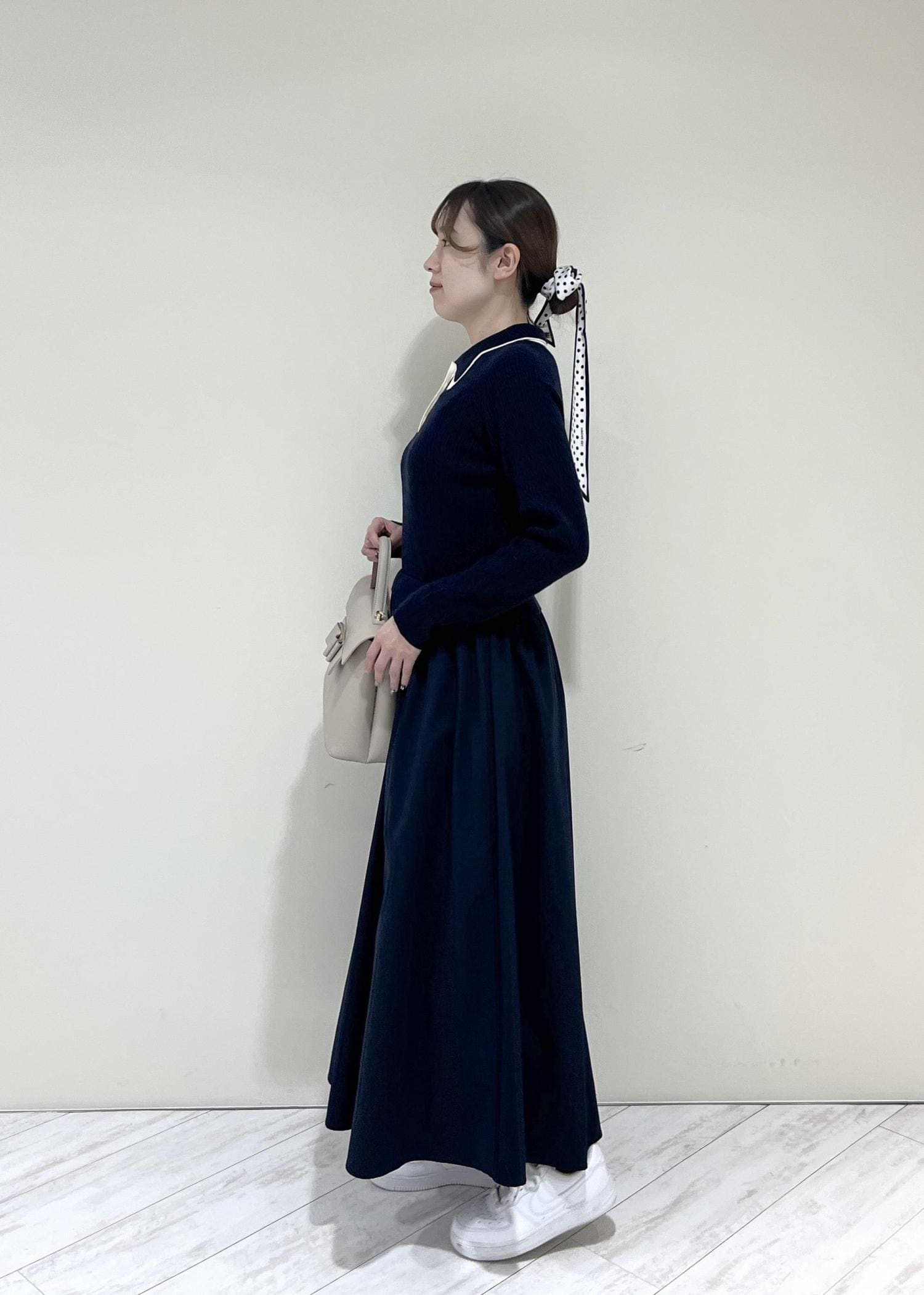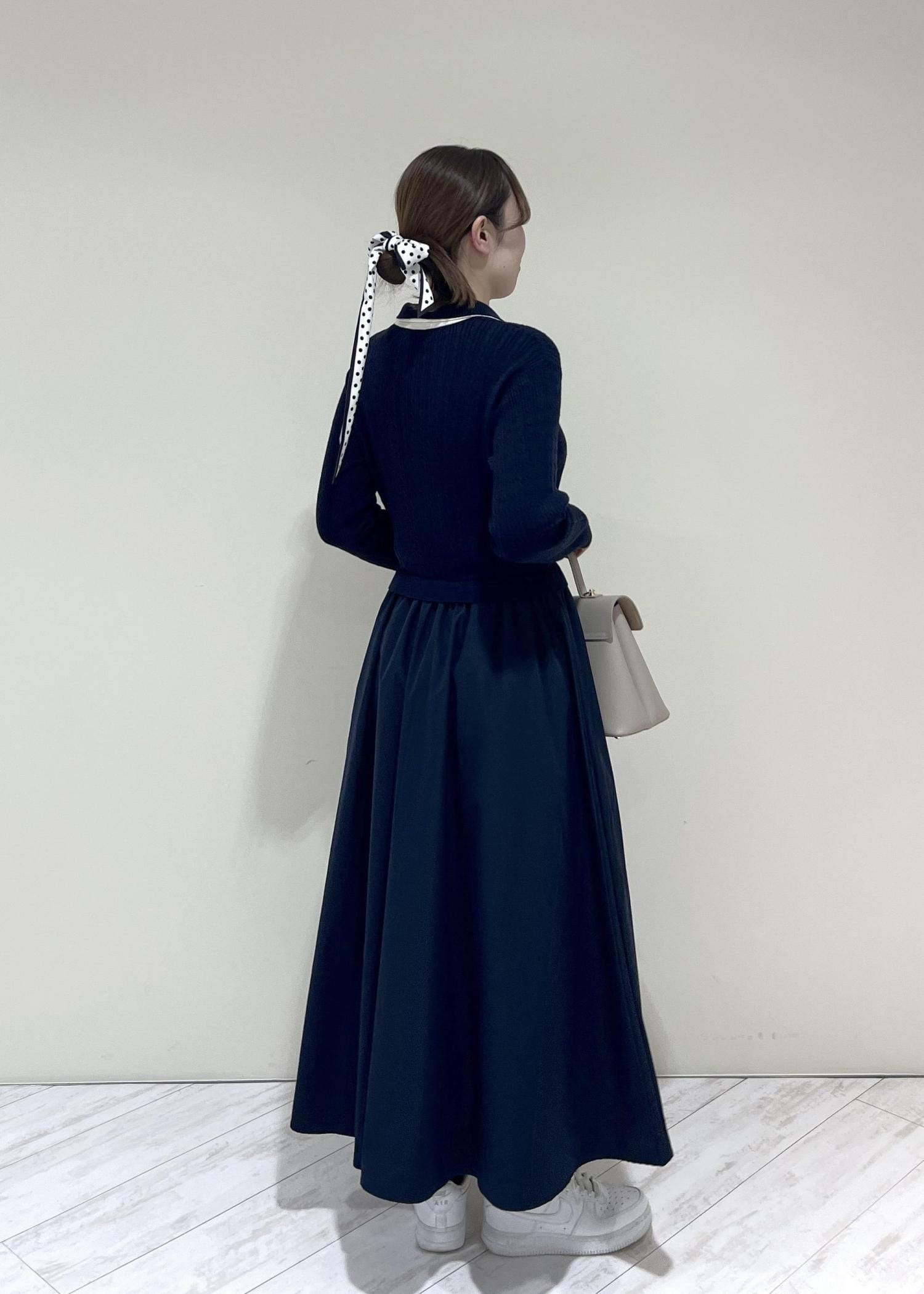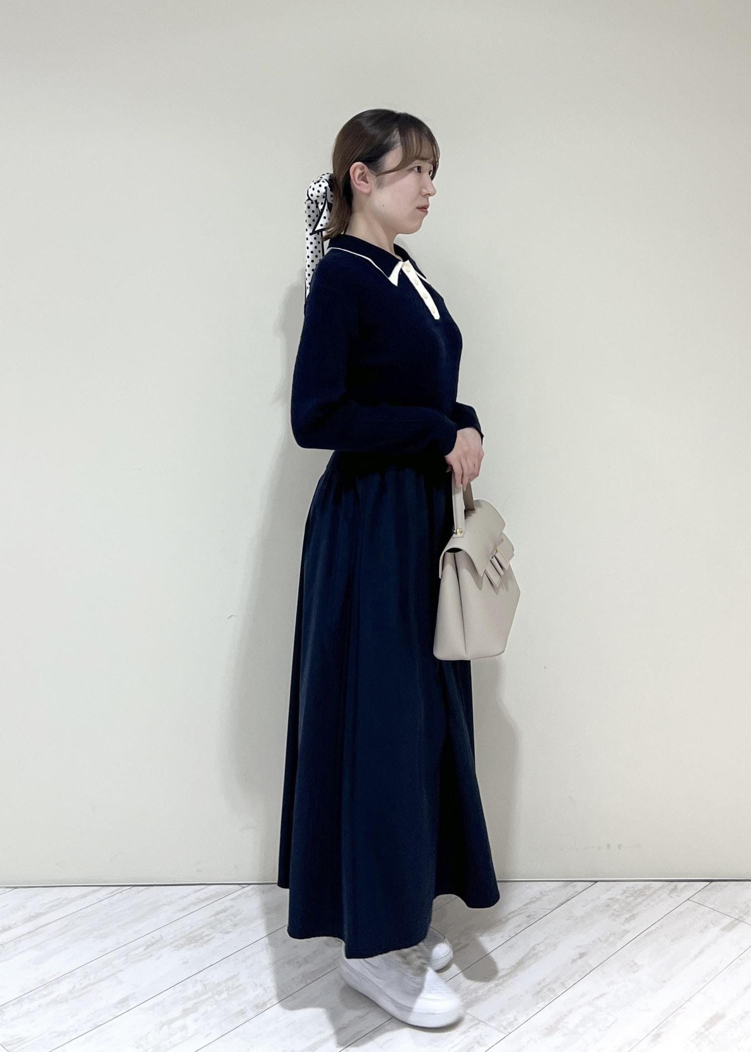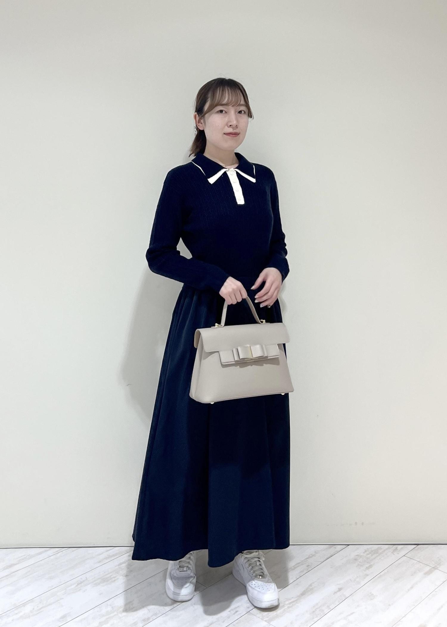 VISダブルカラーポロニットドッキングワンピースネイビー / F¥8,899レビュー着丈はくるぶし上にくる長さでした。ニットなのとウエストはゴムなので着心地抜群です!程よくゆとりのあるサイズ感でした♡