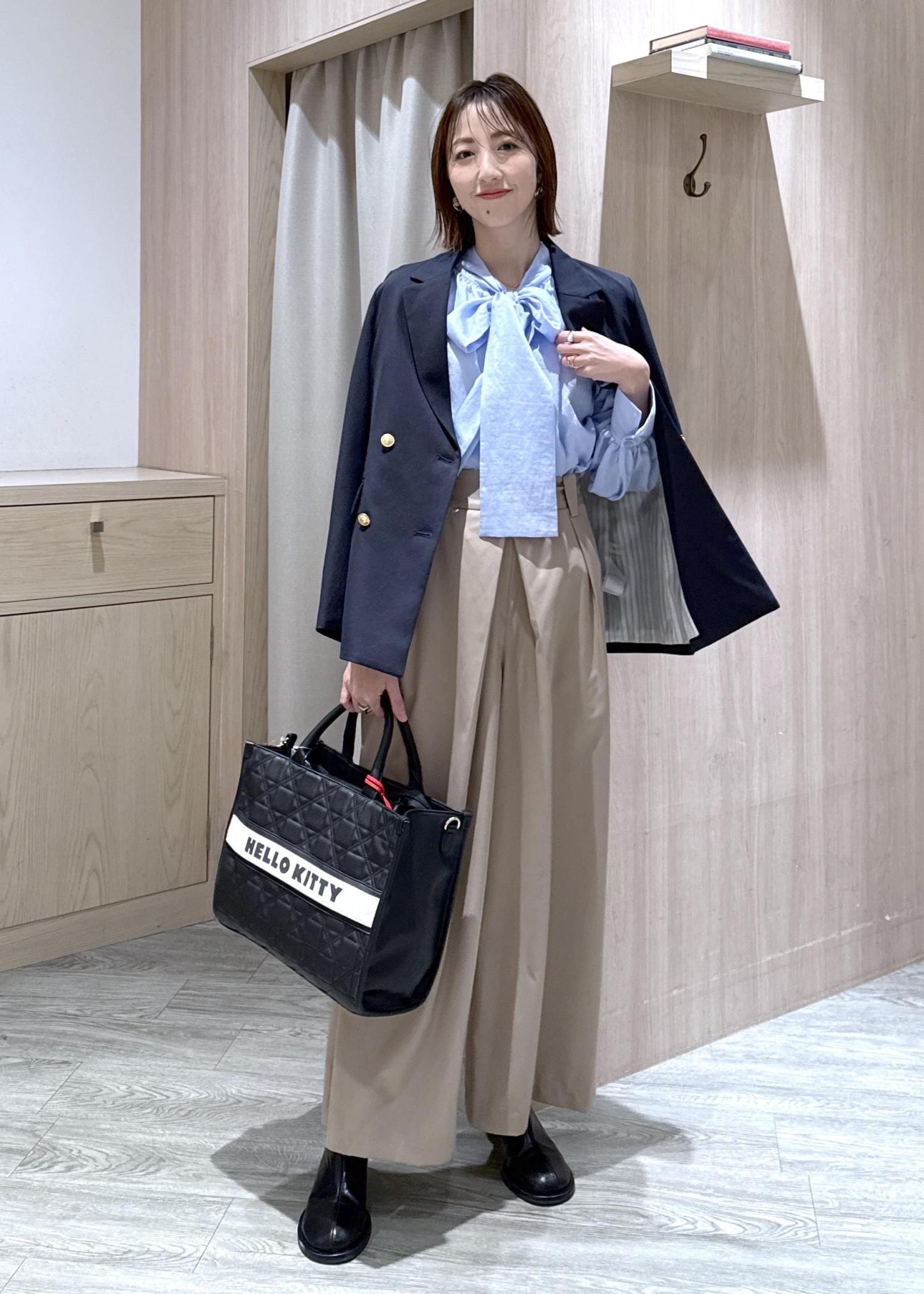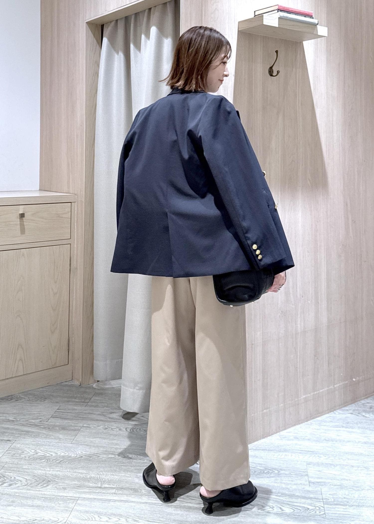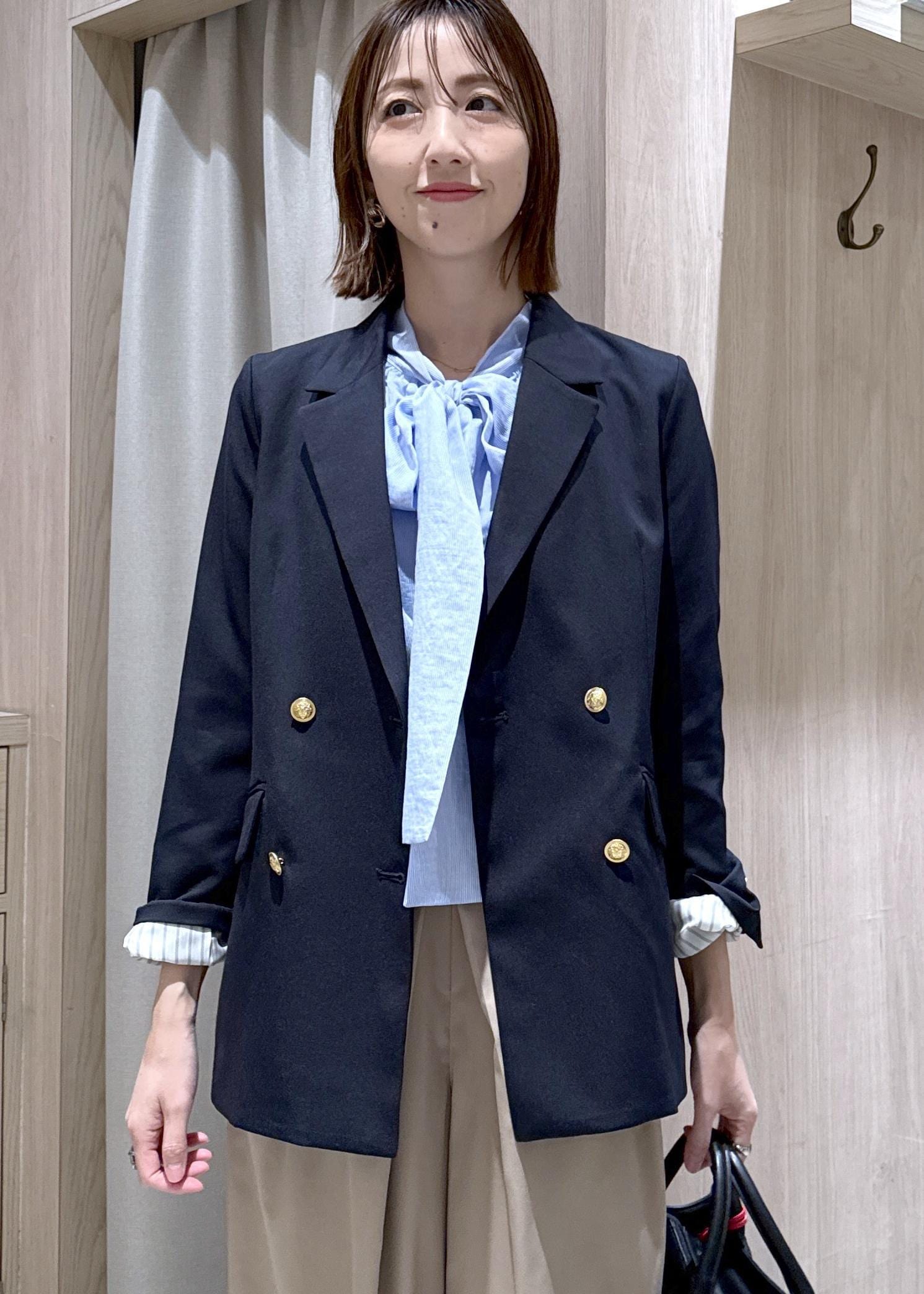 ダブルの金ボタンのジャケットにサラッとタックパンツを合わせたオフィスカジュアルコーデです!