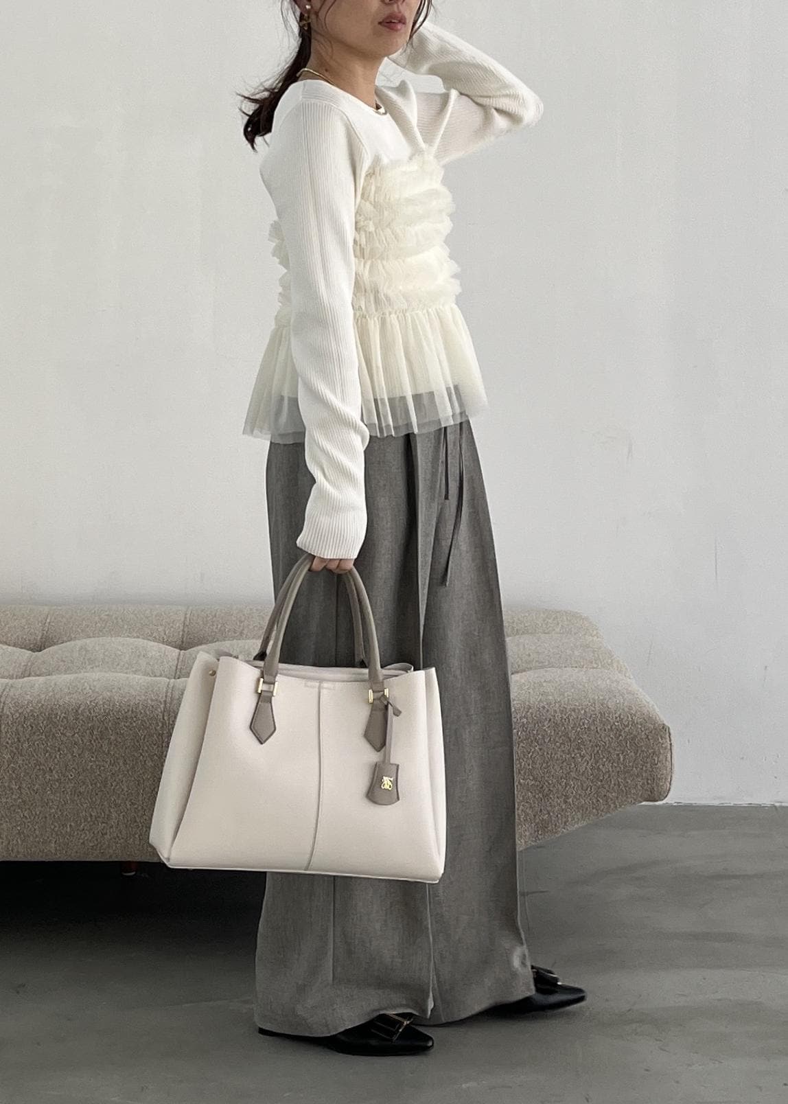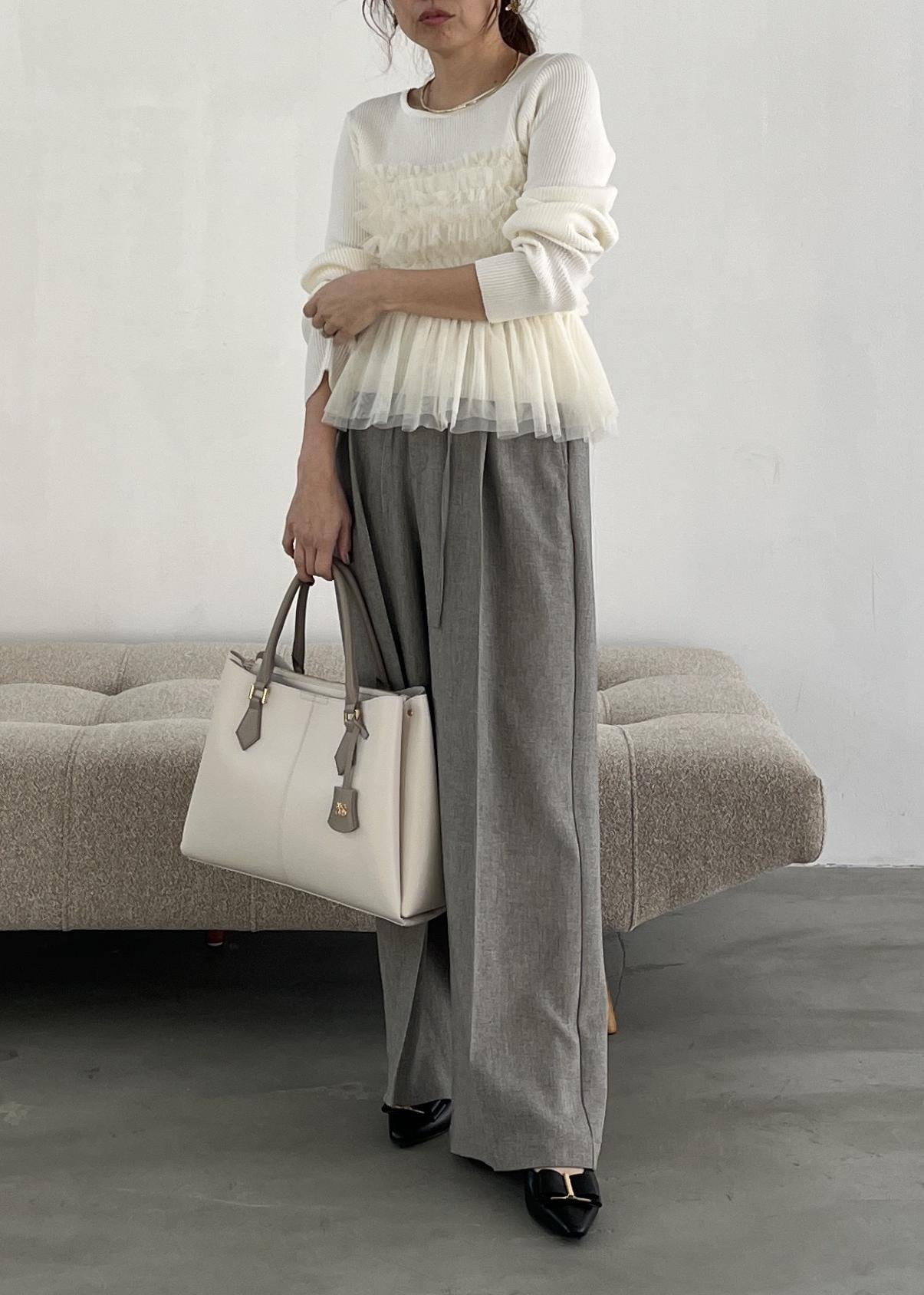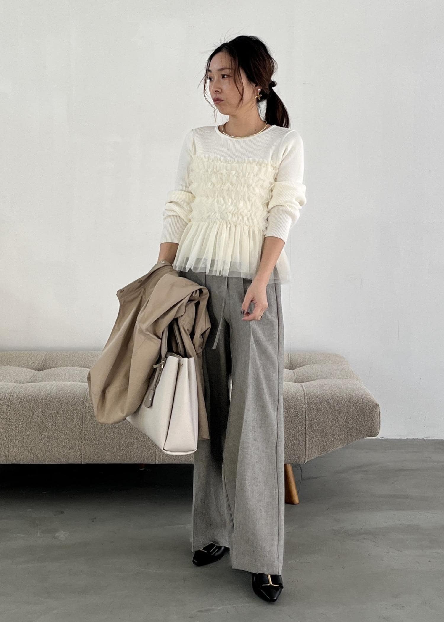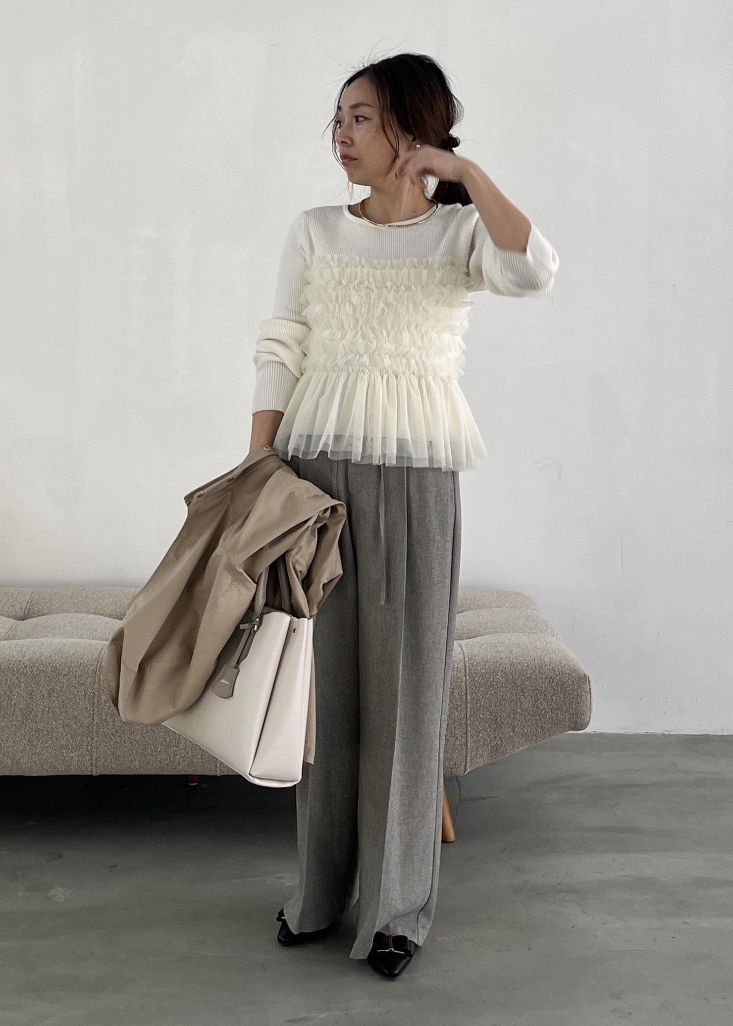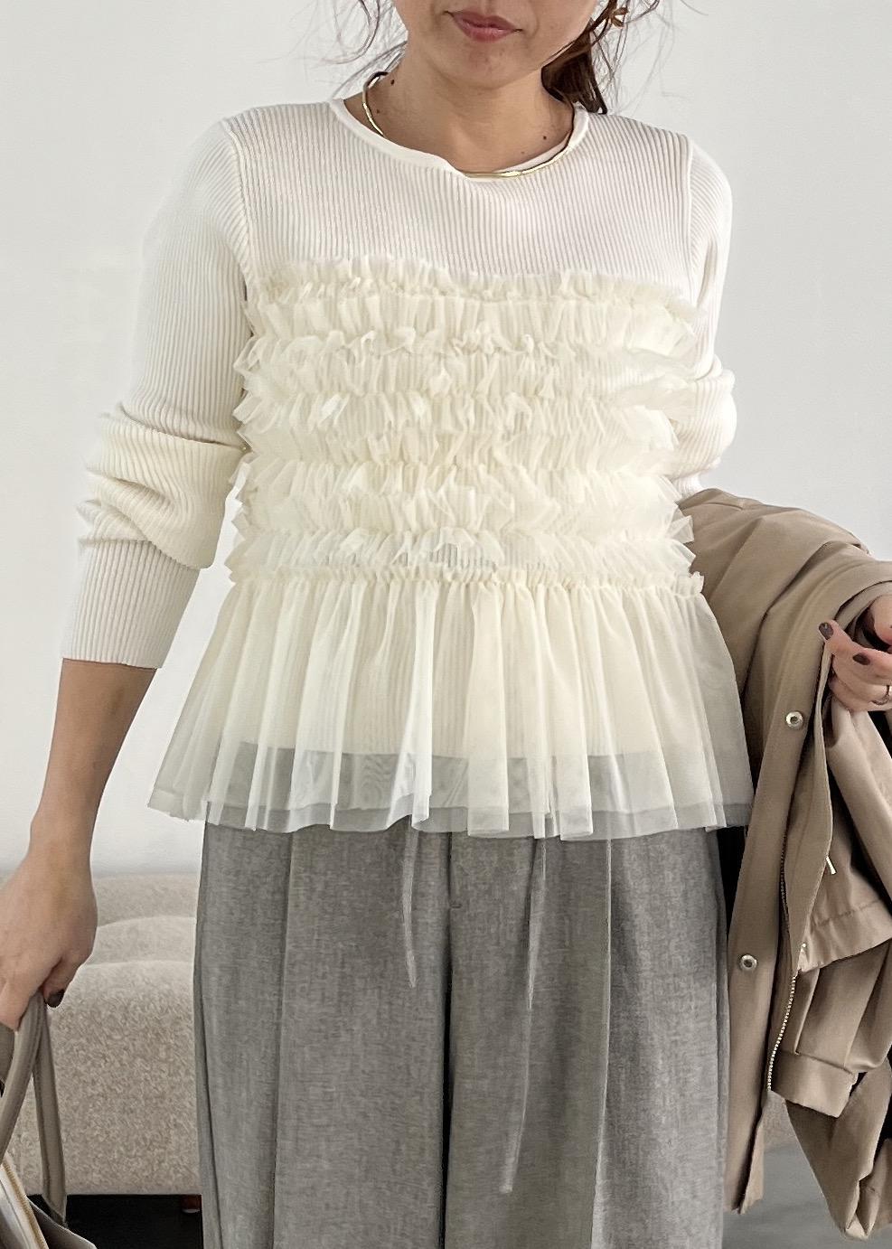 ふわっと重ねたチュールをドッキングした主役トップス。