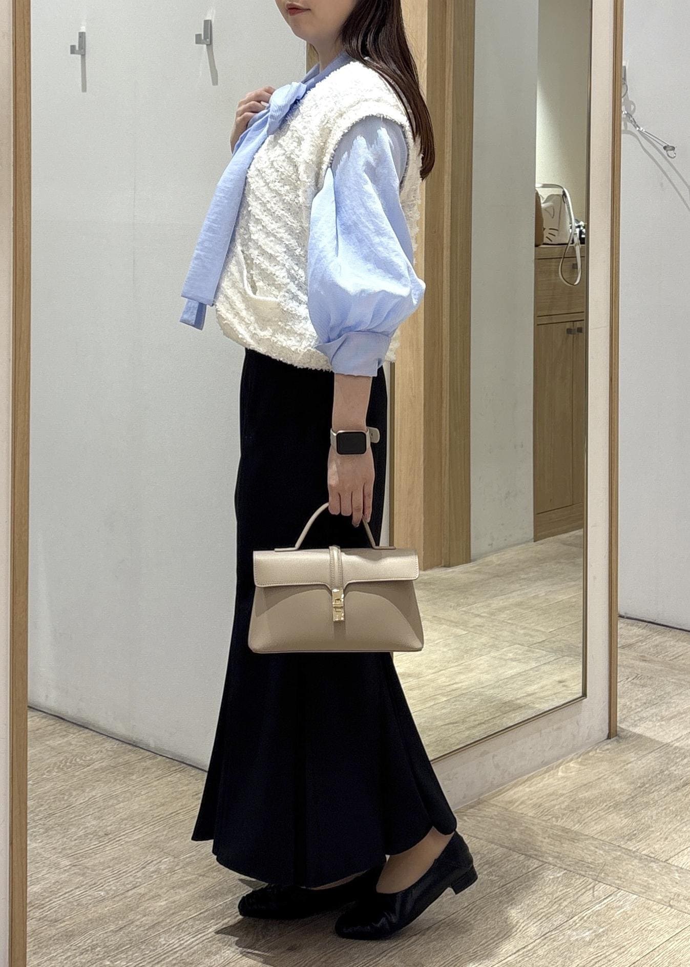 ハリ感のある素材で身体のラインを拾いにくく、きちんと感とスタイルアップを両立できます。 -