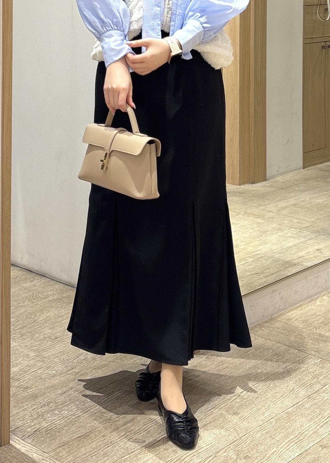 ボックスプリーツ入りでも広がりすぎず、縦ラインが強調されるので下半身が重たく見えにくいです。