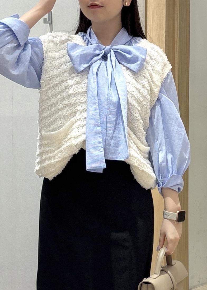 全体的にゆとりのあるシルエットながら、薄手で落ち感のある素材が上半身をすっきり見せるのが特徴。レイヤードスタイルにも映え、リボン結びや片結びなど結び方で印象を変えられます。 -